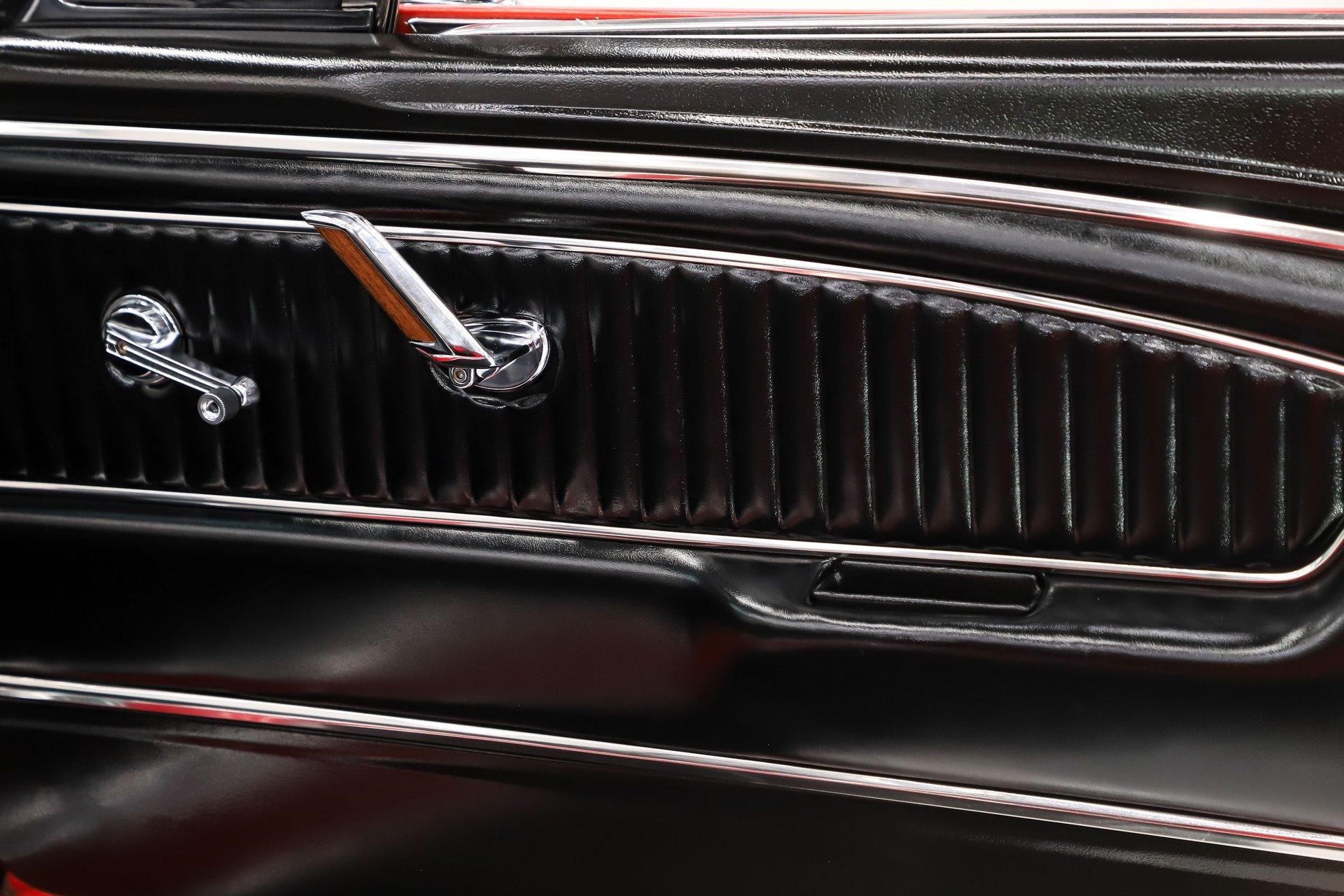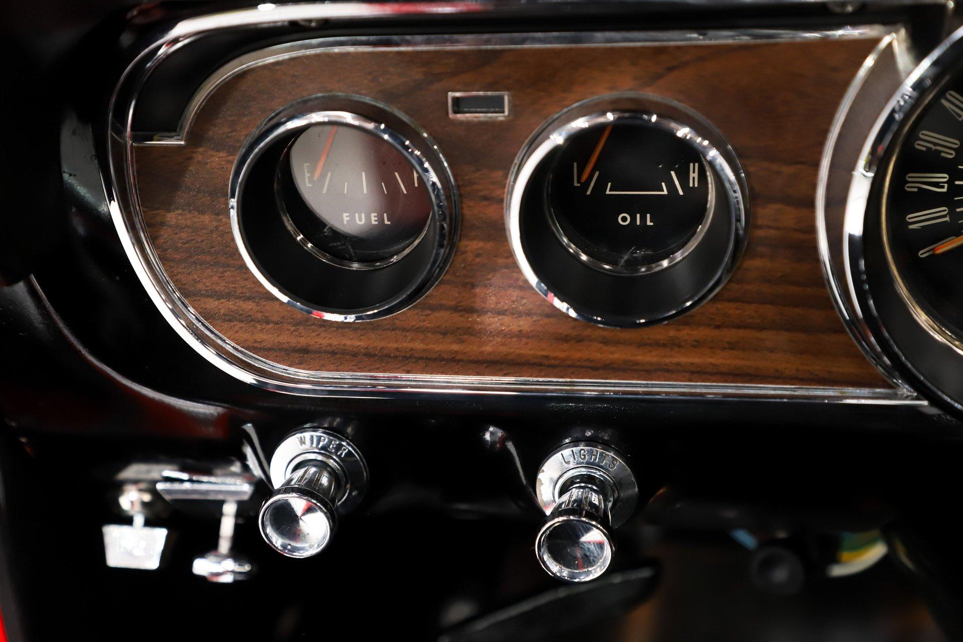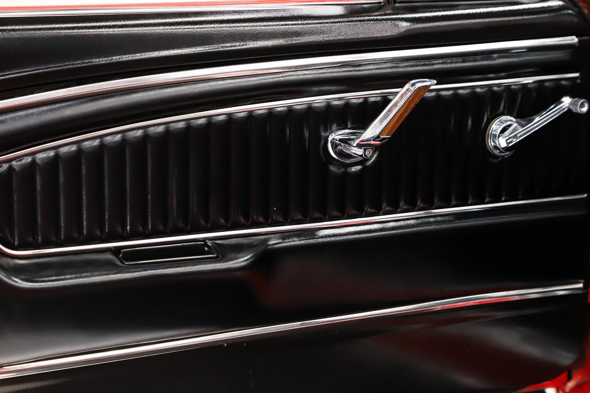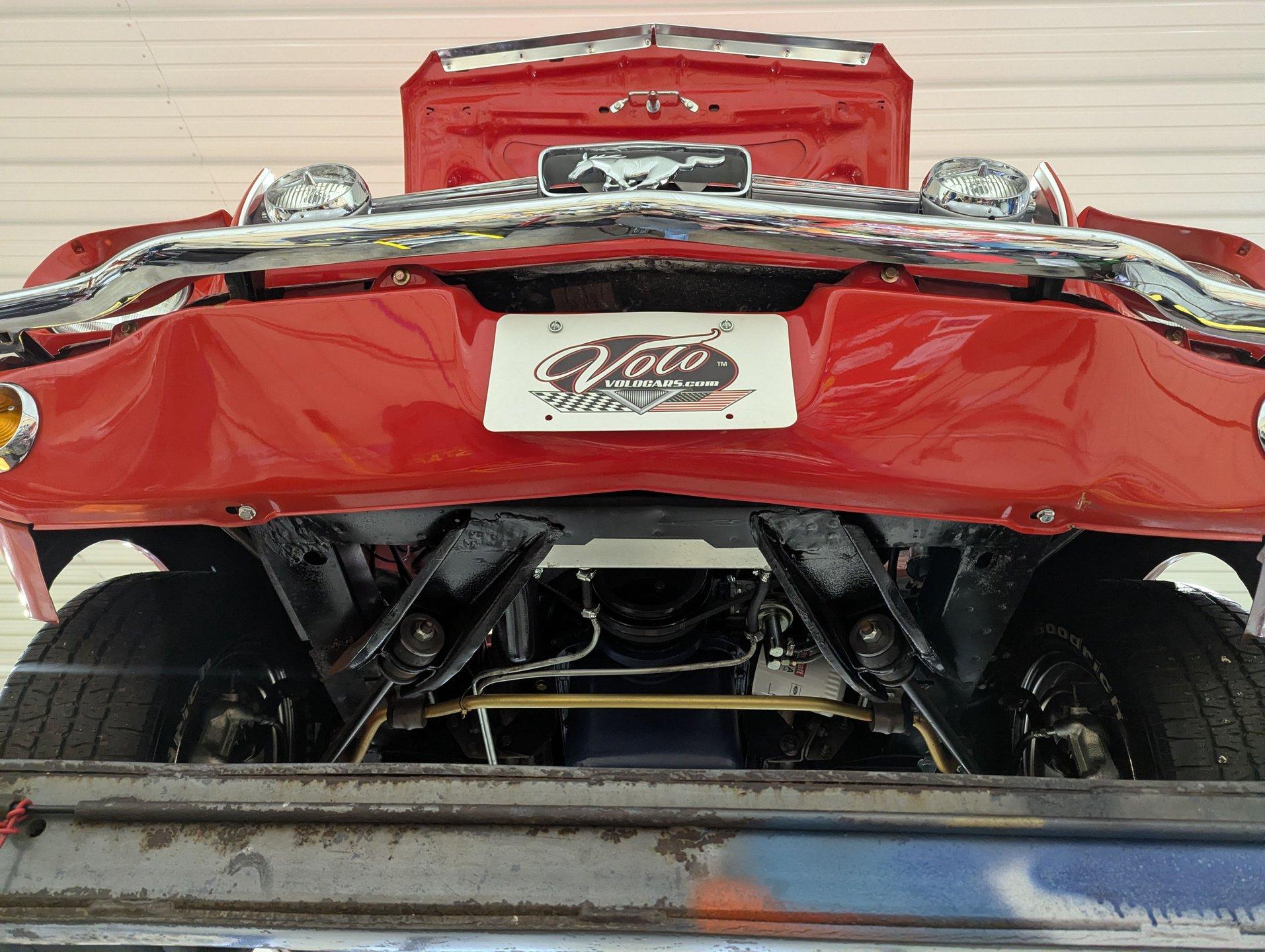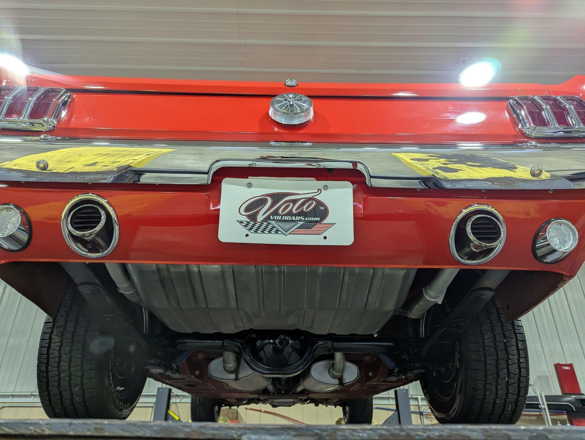 EXTERIOR: It's a beautiful classic Mustang GT with options, glass, and red paint. Body is excellent; it's straight and fits right, has no rust or damage showing, repainted in signal flare red, and it is polished smooth and glossy. Just about every piece of external trim chrome has been replaced and sparkles. Convertible top has been restored, black power top, all new weather strips, windshield was replaced as the GT fog lamps in front and GT exhaust tips coming through the valance and back. It's riding on 15-in GT wheels with red center caps and radial tires as dual mirrors correct antenna.