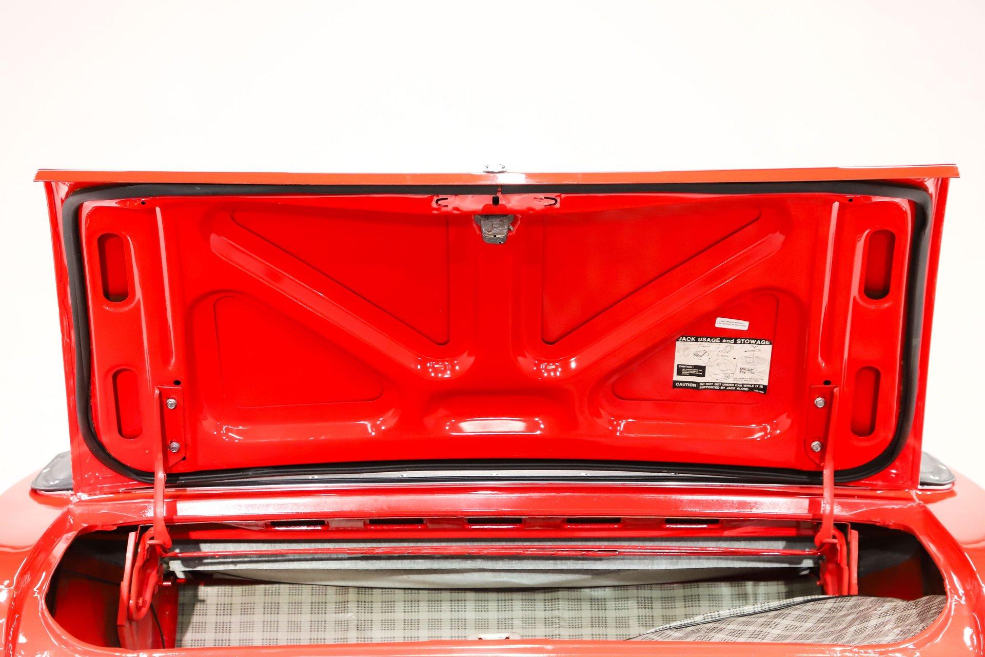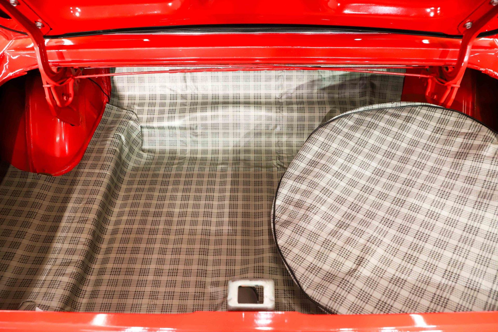 TRUNK COMPARTMENT: Under the trunk lid and the jamb have fresh red paint, inside is also painted red and has a complete liner and tire cover over the spare. It also has a reproduction decal and weatherstrip.