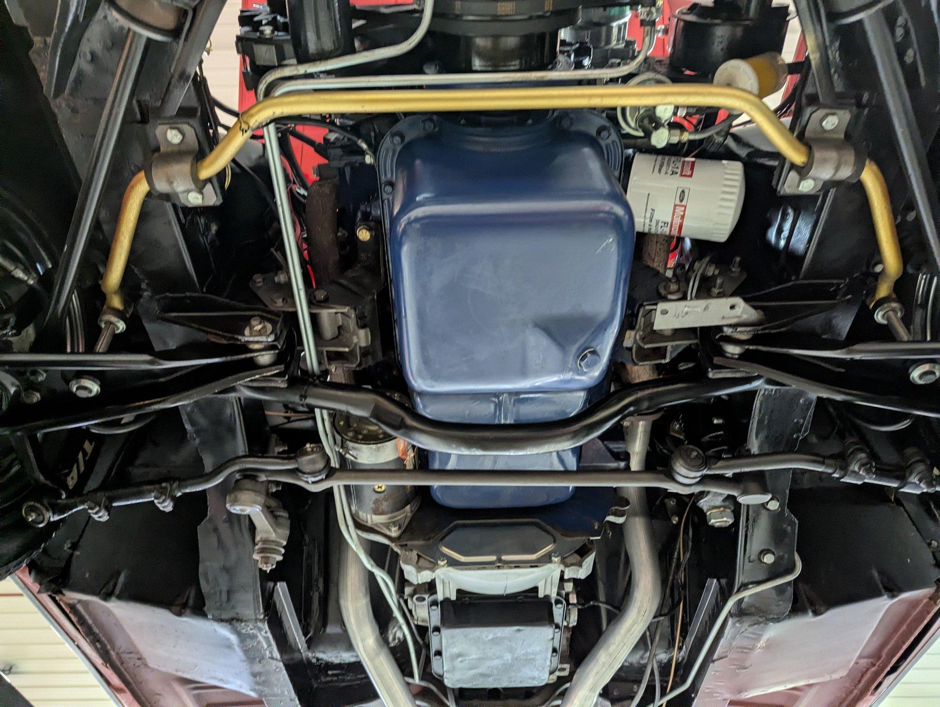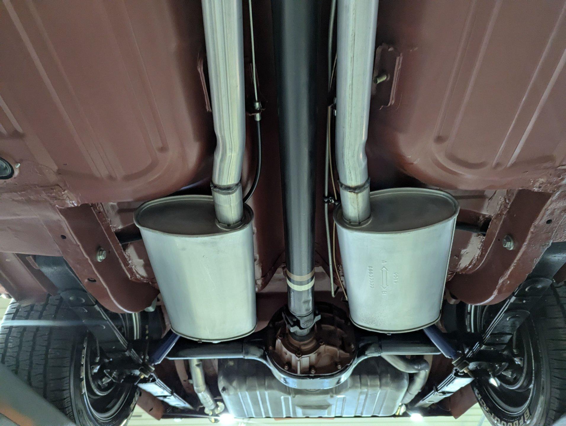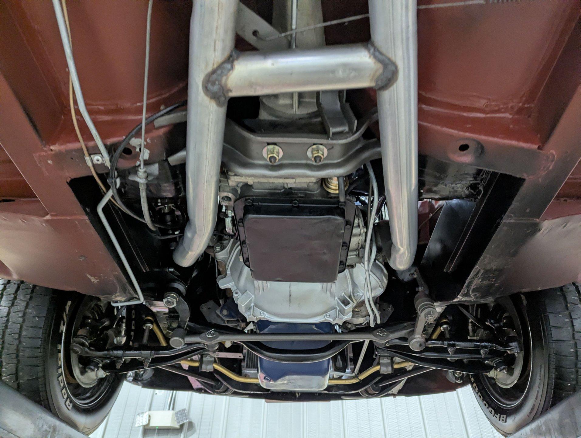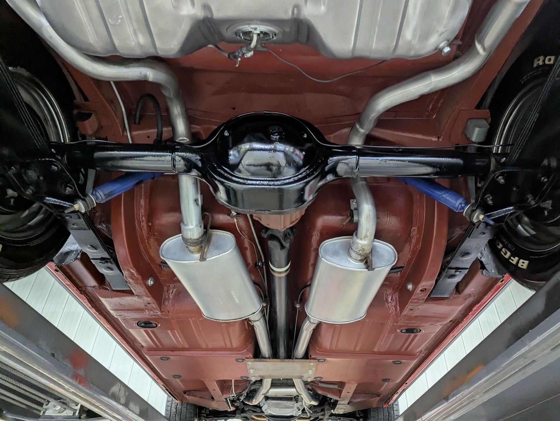 UNDERSIDE: It's even restored mechanically and cosmetically underneath! All of the steering and suspension has been rebuilt or replaced. It has a new factory type GT dual exhaust with crossover pipe and the stainless tips going through the valance. It has an all new fuel system including the tank. The brakes have been redone, lines were replaced, upgraded to disc in front and the e-brake is hooked up. Looking up at the motor it is fresh with fresh components. It has a rebuilt Cruis-o-matic transmission and a restored driveshaft that goes back to the rear end with cruising gears. The floors are all restored and painted in red oxide primer like the factory would have done.