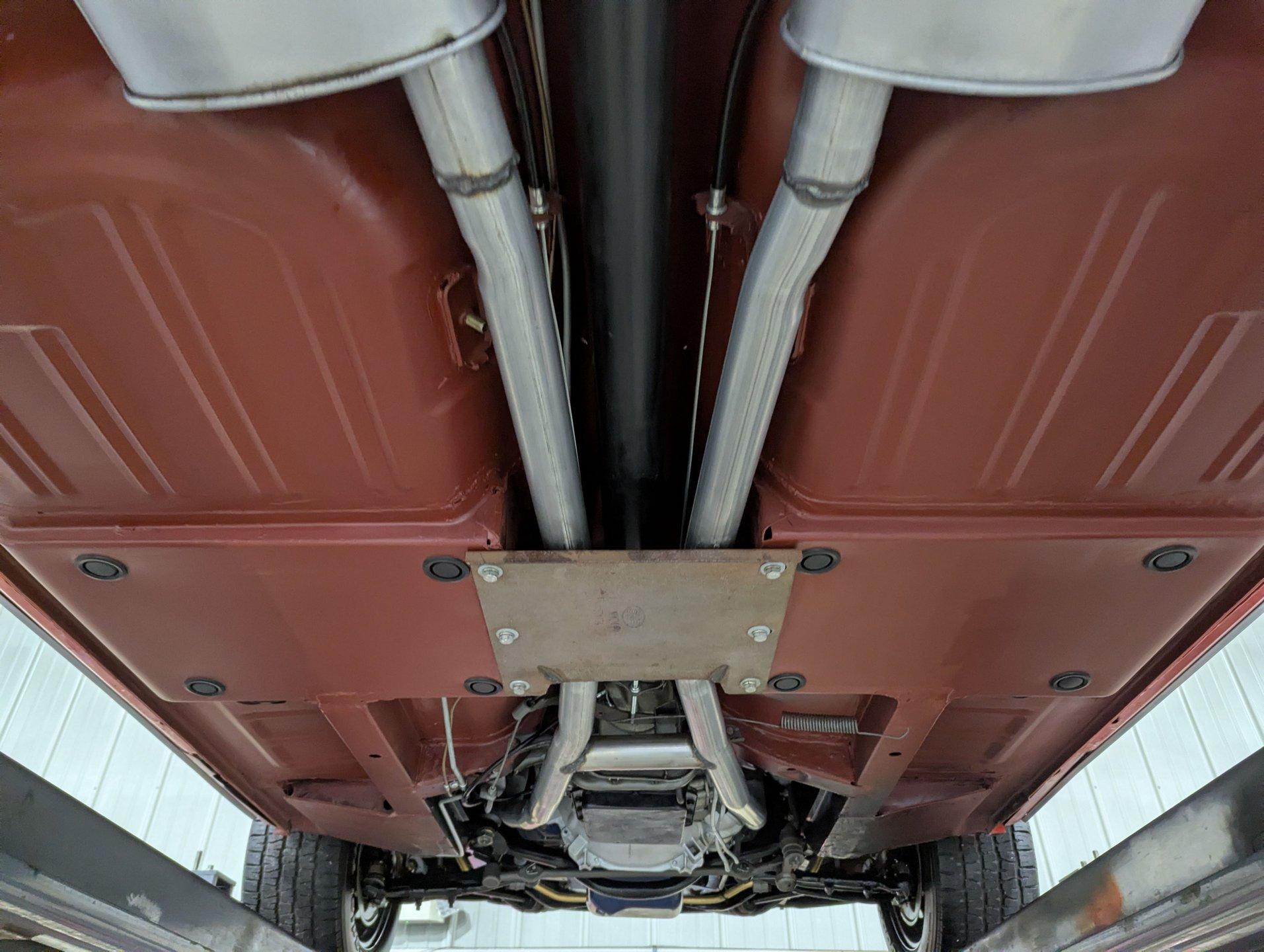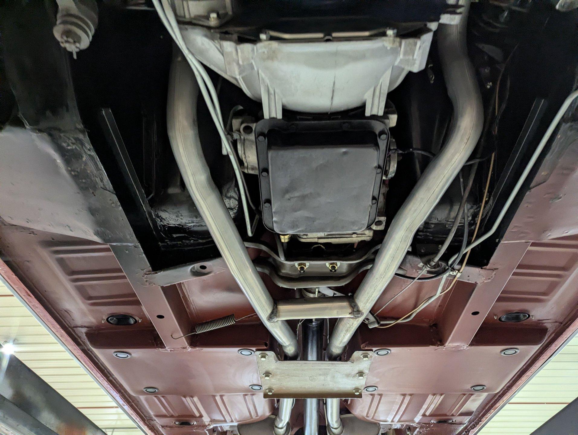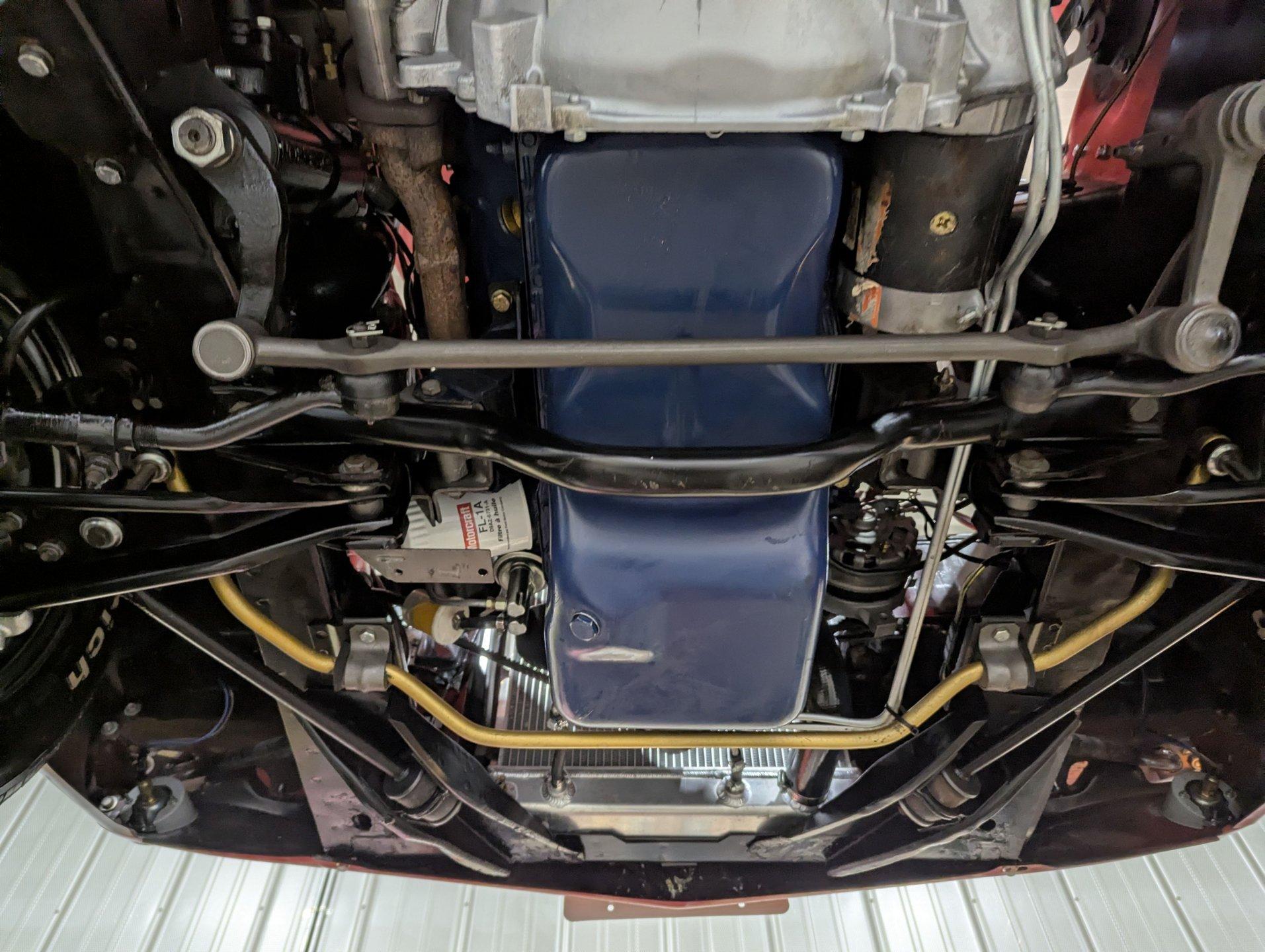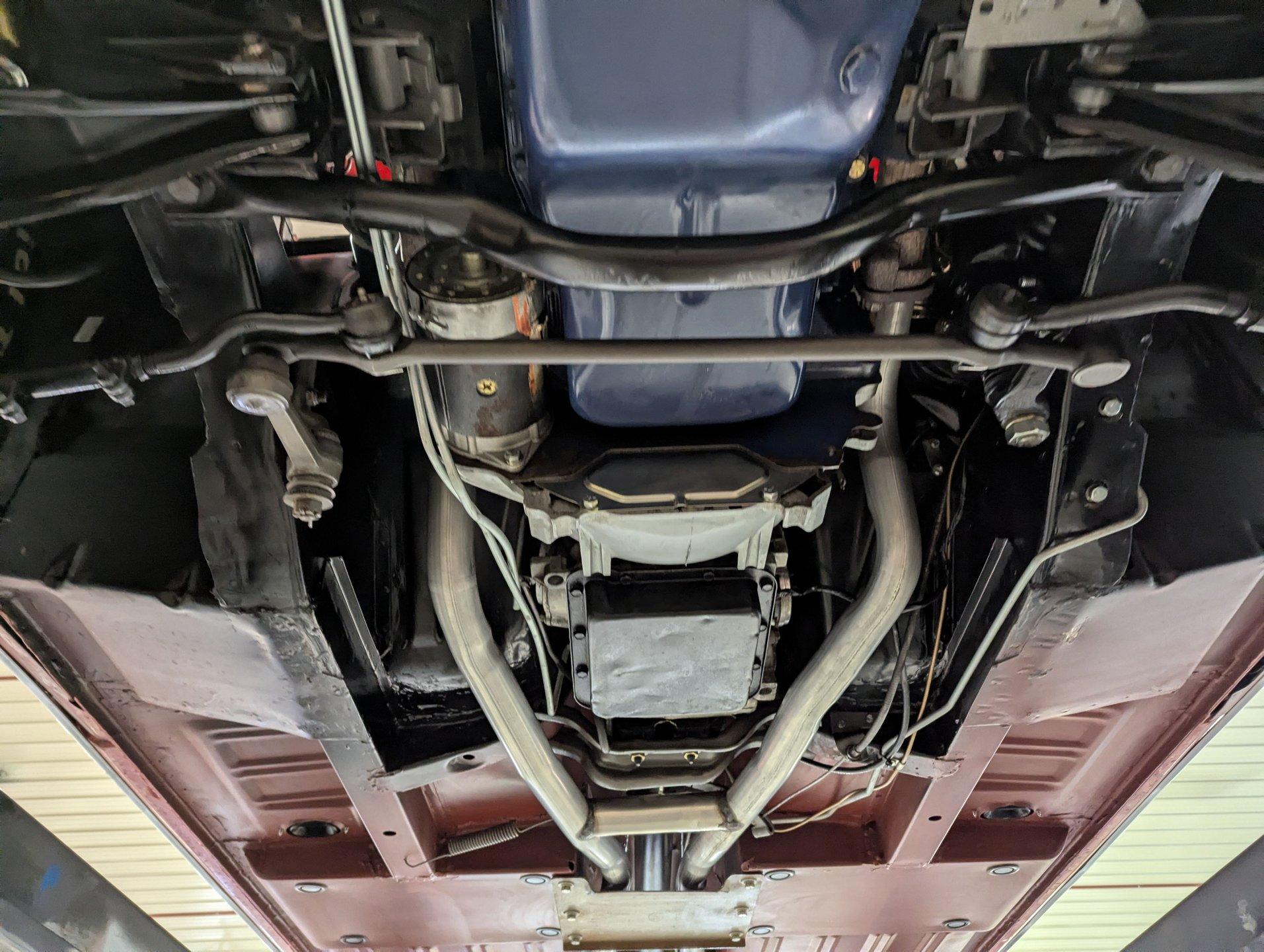 UNDERSIDE: It's even restored mechanically and cosmetically underneath! All of the steering and suspension has been rebuilt or replaced. It has a new factory type GT dual exhaust with crossover pipe and the stainless tips going through the valance. It has an all new fuel system including the tank. The brakes have been redone, lines were replaced, upgraded to disc in front and the e-brake is hooked up. Looking up at the motor it is fresh with fresh components. It has a rebuilt Cruis-o-matic transmission and a restored driveshaft that goes back to the rear end with cruising gears. The floors are all restored and painted in red oxide primer like the factory would have done.