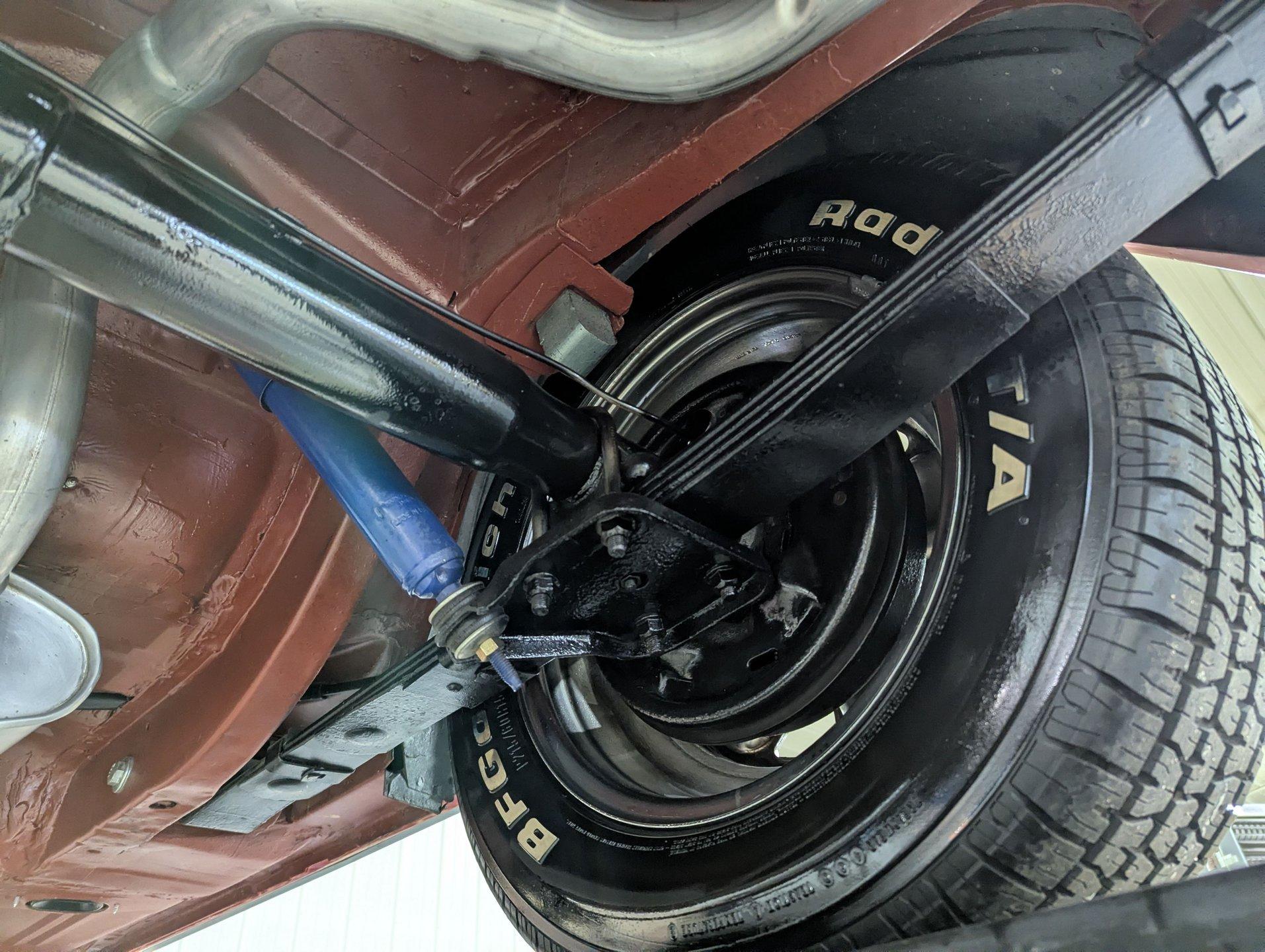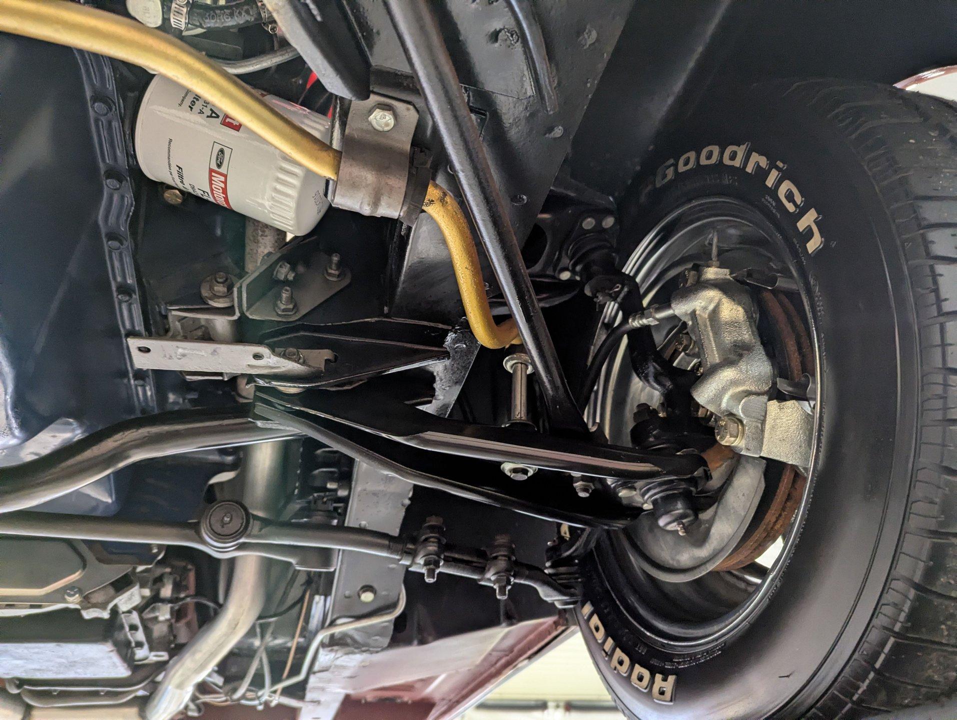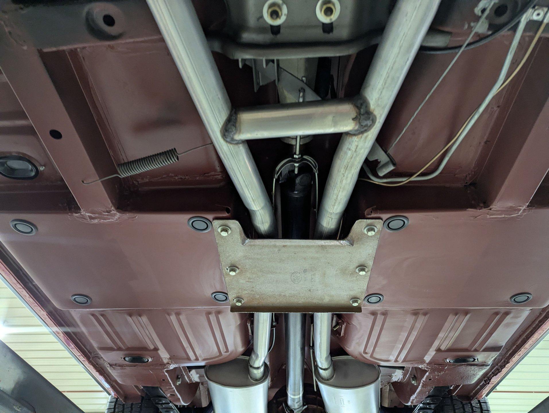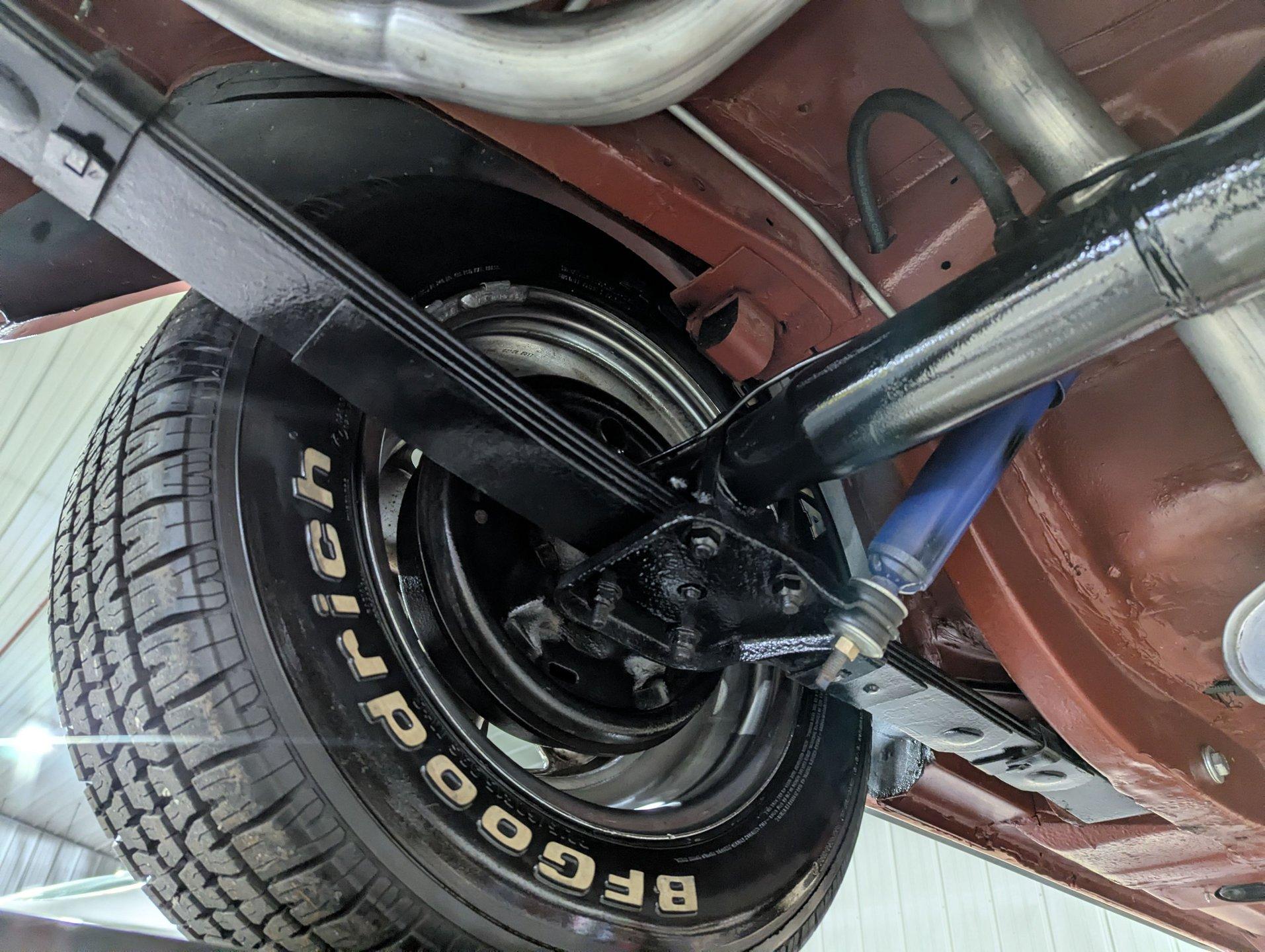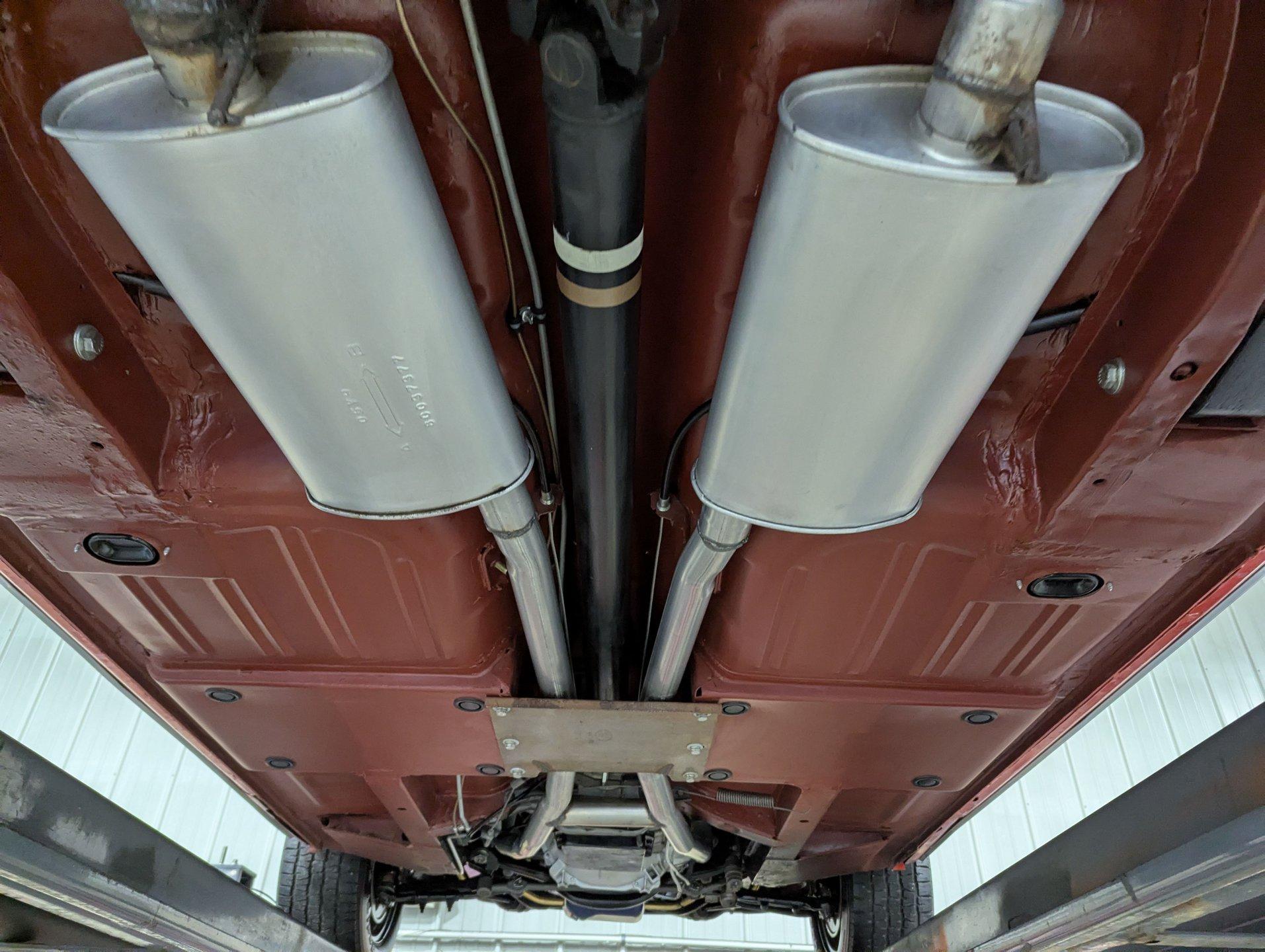 UNDERSIDE: It's even restored mechanically and cosmetically underneath! All of the steering and suspension has been rebuilt or replaced. It has a new factory type GT dual exhaust with crossover pipe and the stainless tips going through the valance. It has an all new fuel system including the tank. The brakes have been redone, lines were replaced, upgraded to disc in front and the e-brake is hooked up. Looking up at the motor it is fresh with fresh components. It has a rebuilt Cruis-o-matic transmission and a restored driveshaft that goes back to the rear end with cruising gears. The floors are all restored and painted in red oxide primer like the factory would have done.