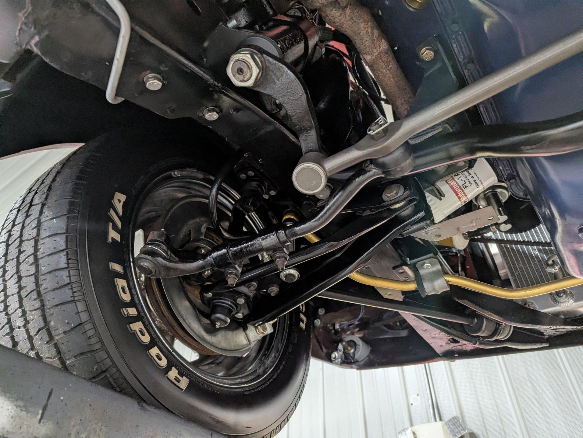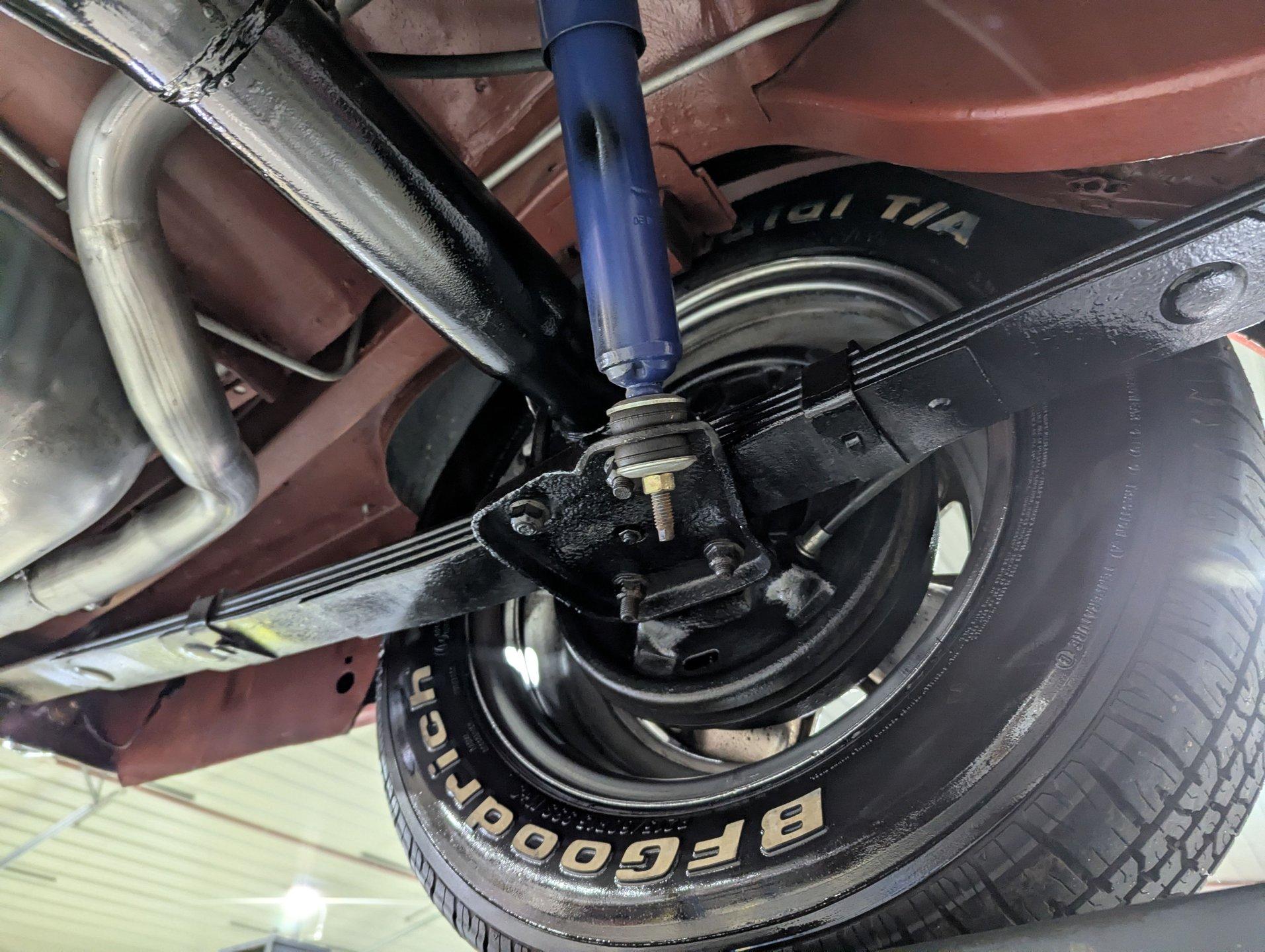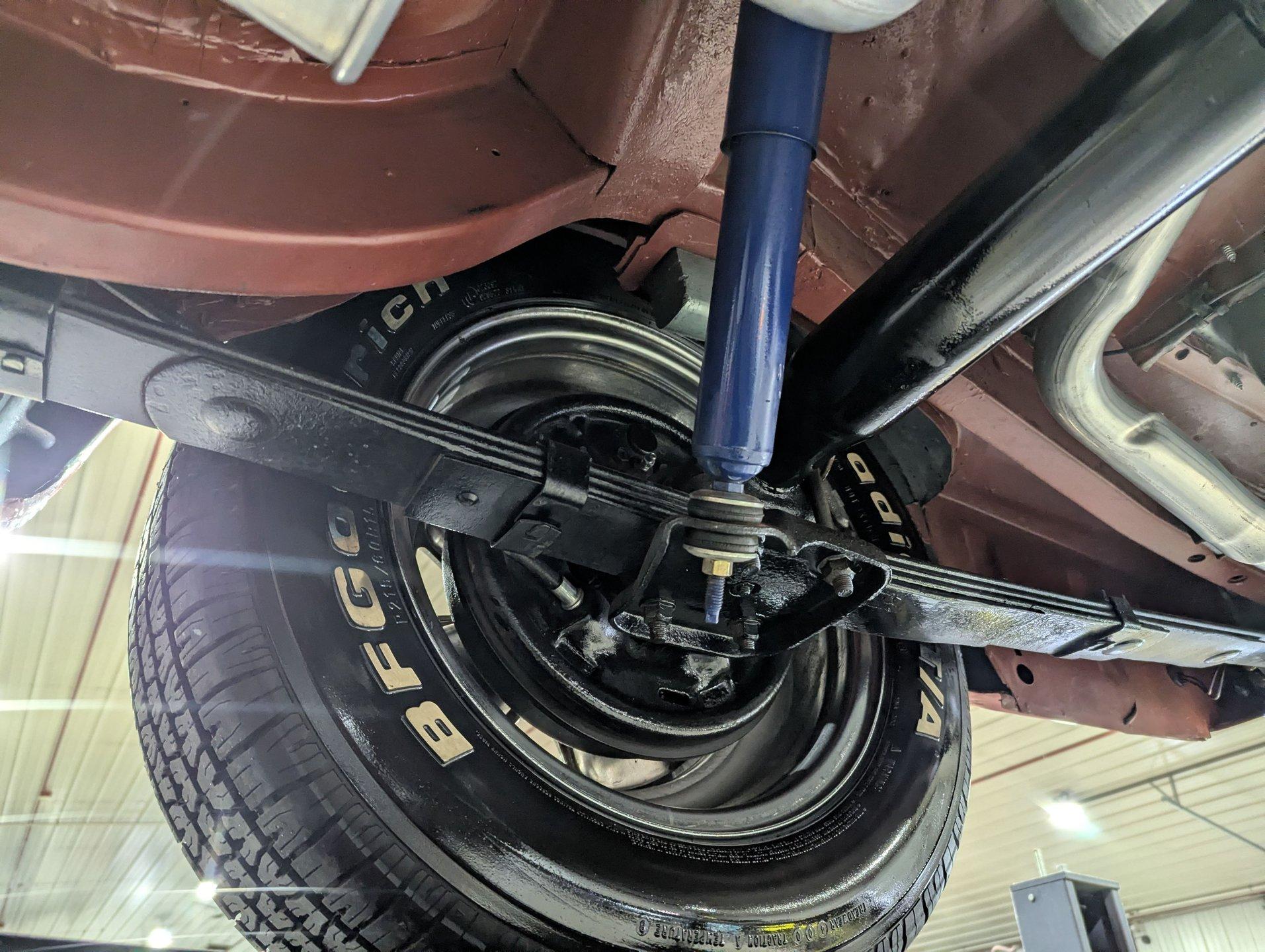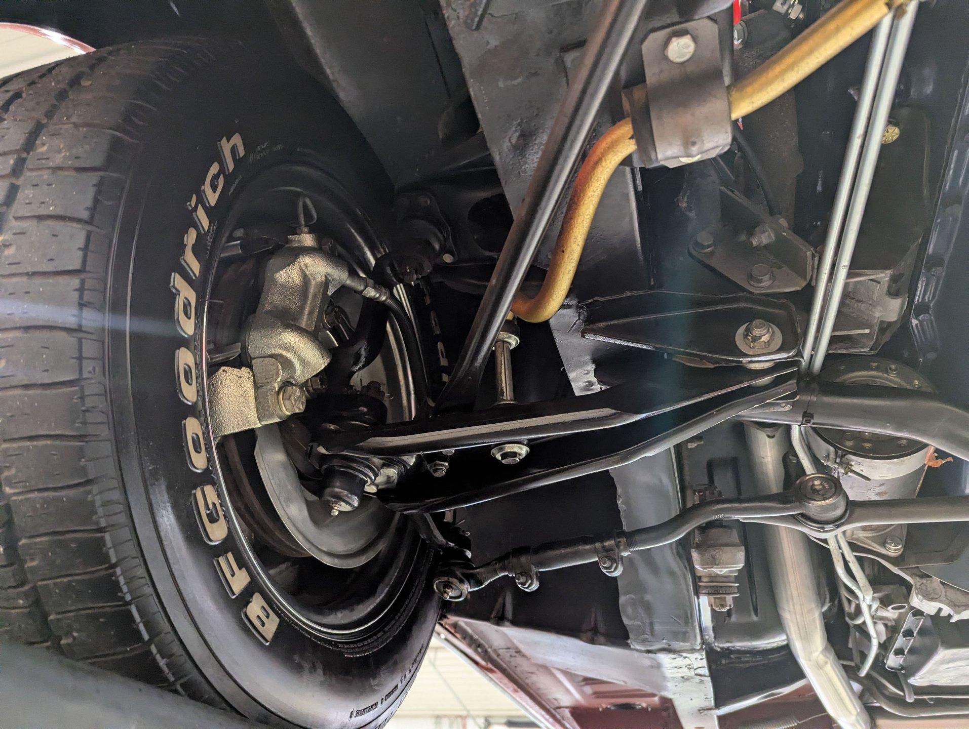 UNDERSIDE: It's even restored mechanically and cosmetically underneath! All of the steering and suspension has been rebuilt or replaced. It has a new factory type GT dual exhaust with crossover pipe and the stainless tips going through the valance. It has an all new fuel system including the tank. The brakes have been redone, lines were replaced, upgraded to disc in front and the e-brake is hooked up. Looking up at the motor it is fresh with fresh components. It has a rebuilt Cruis-o-matic transmission and a restored driveshaft that goes back to the rear end with cruising gears. The floors are all restored and painted in red oxide primer like the factory would have done.