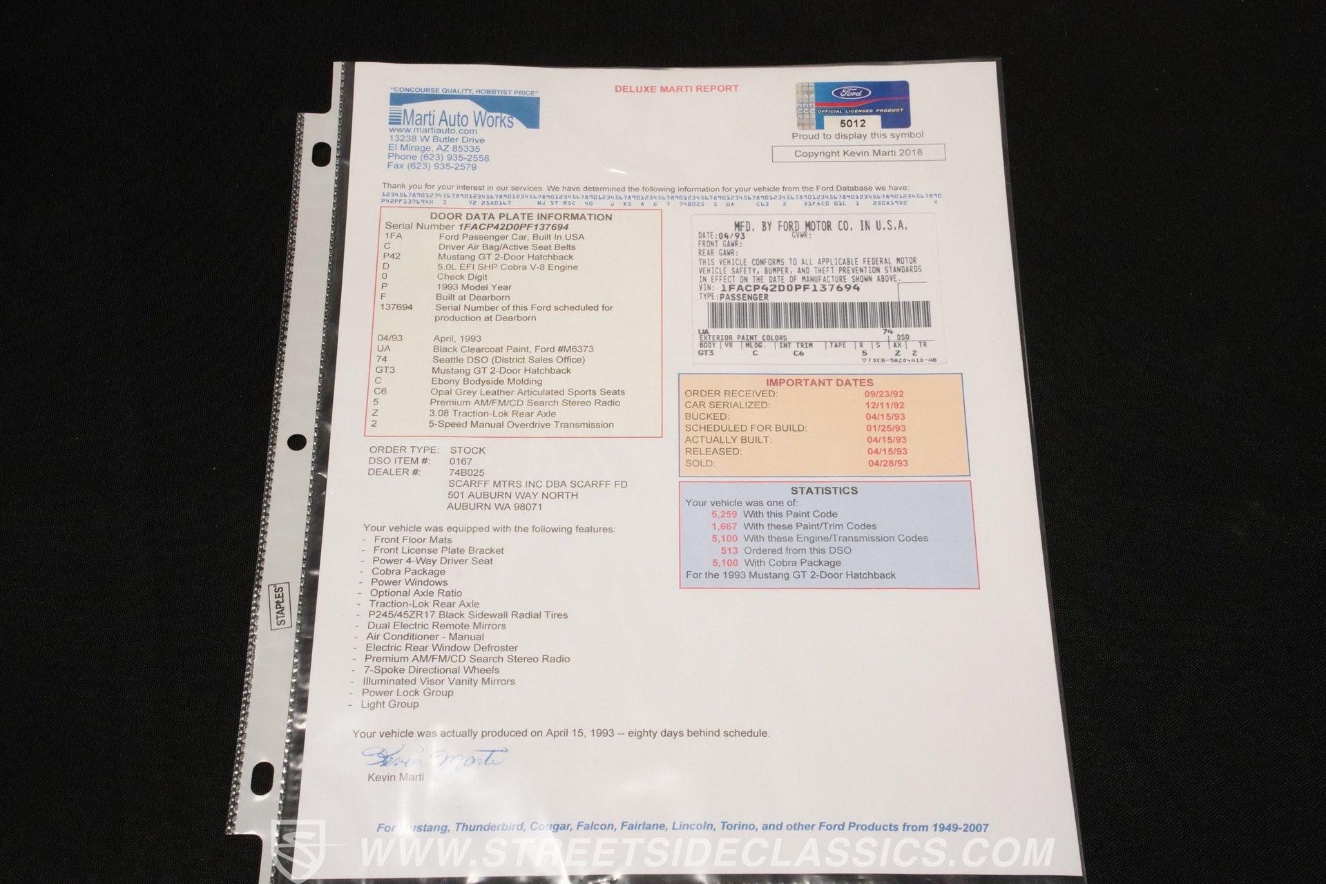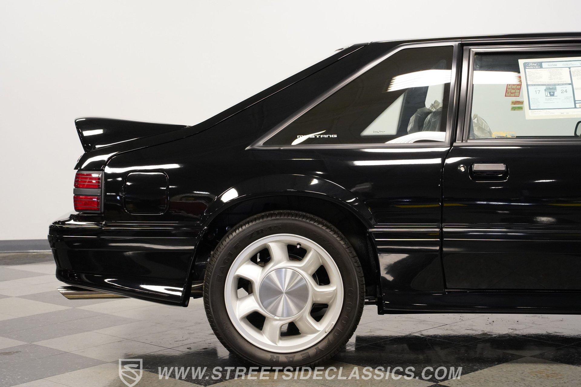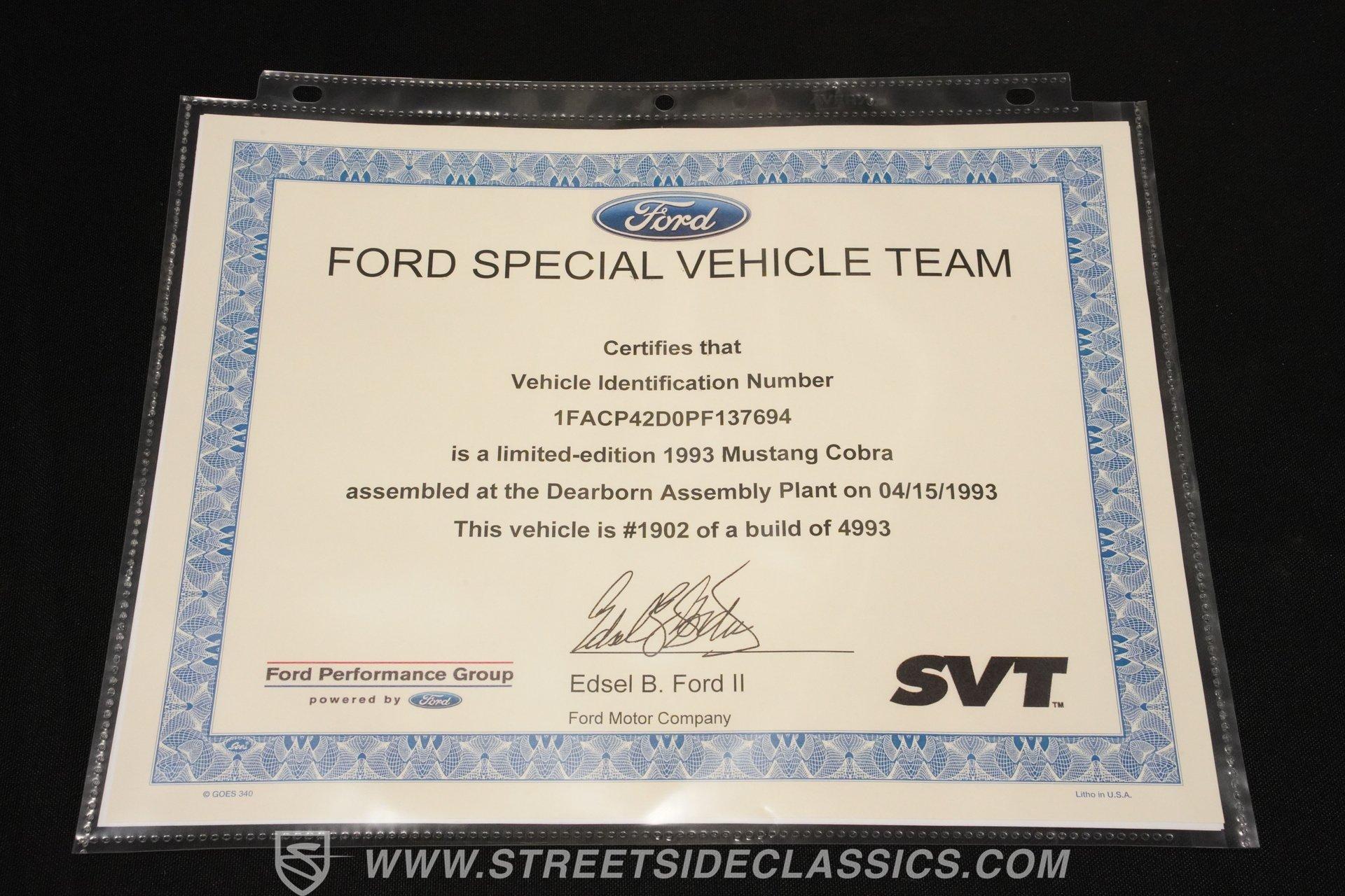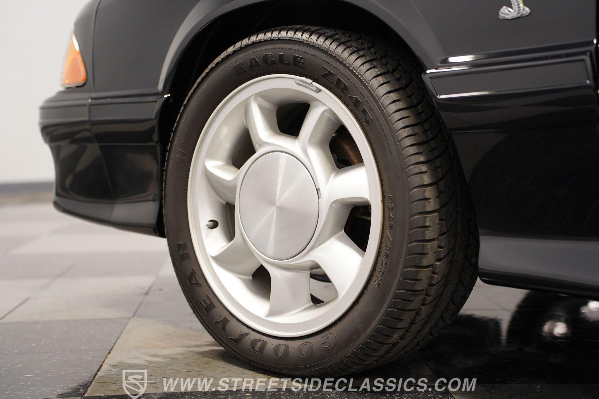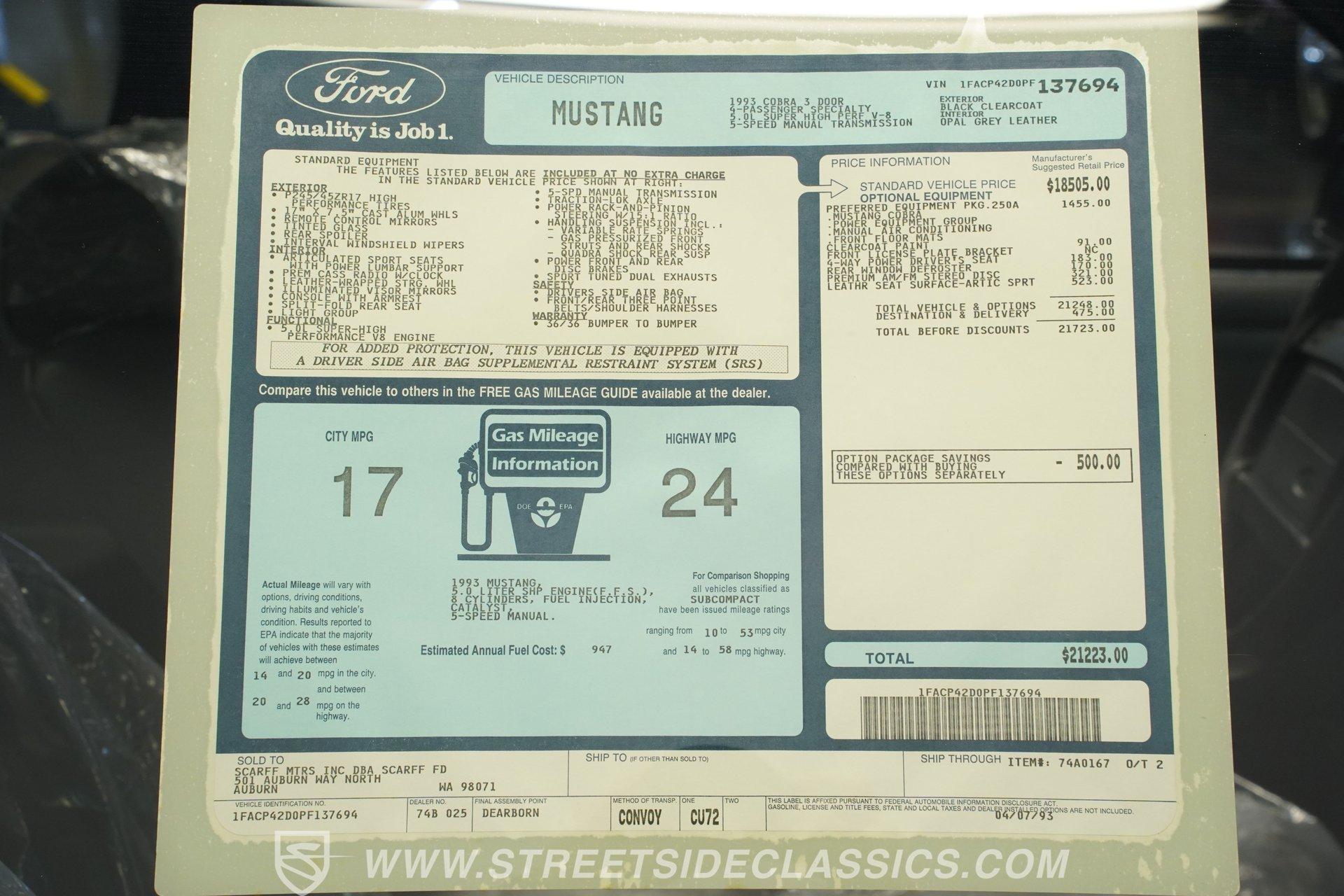 This 1993 Ford Mustang Cobra SVT rides on its factory suspension, Cobra-specific directional 17-inch wheels, and original Goodyear tires. If you've been looking for a sporty and extremely rare muscle car from the modern era, there is no better car than this still-new first-year Mustang Cobra. Along with its laughably low mileage, this collectible classic comes with a Marti Report, owner's manual, original warranty card, and original window sticker. But don't wait, because cars like this don't come around often and don't last long. Call today!