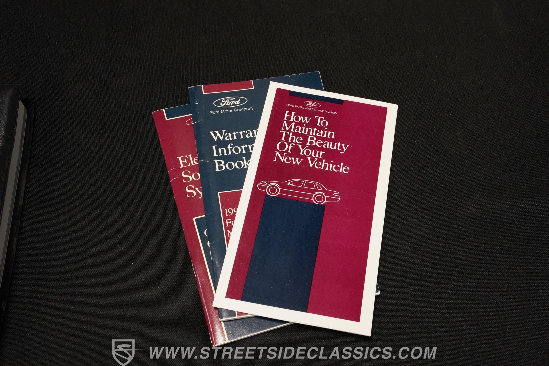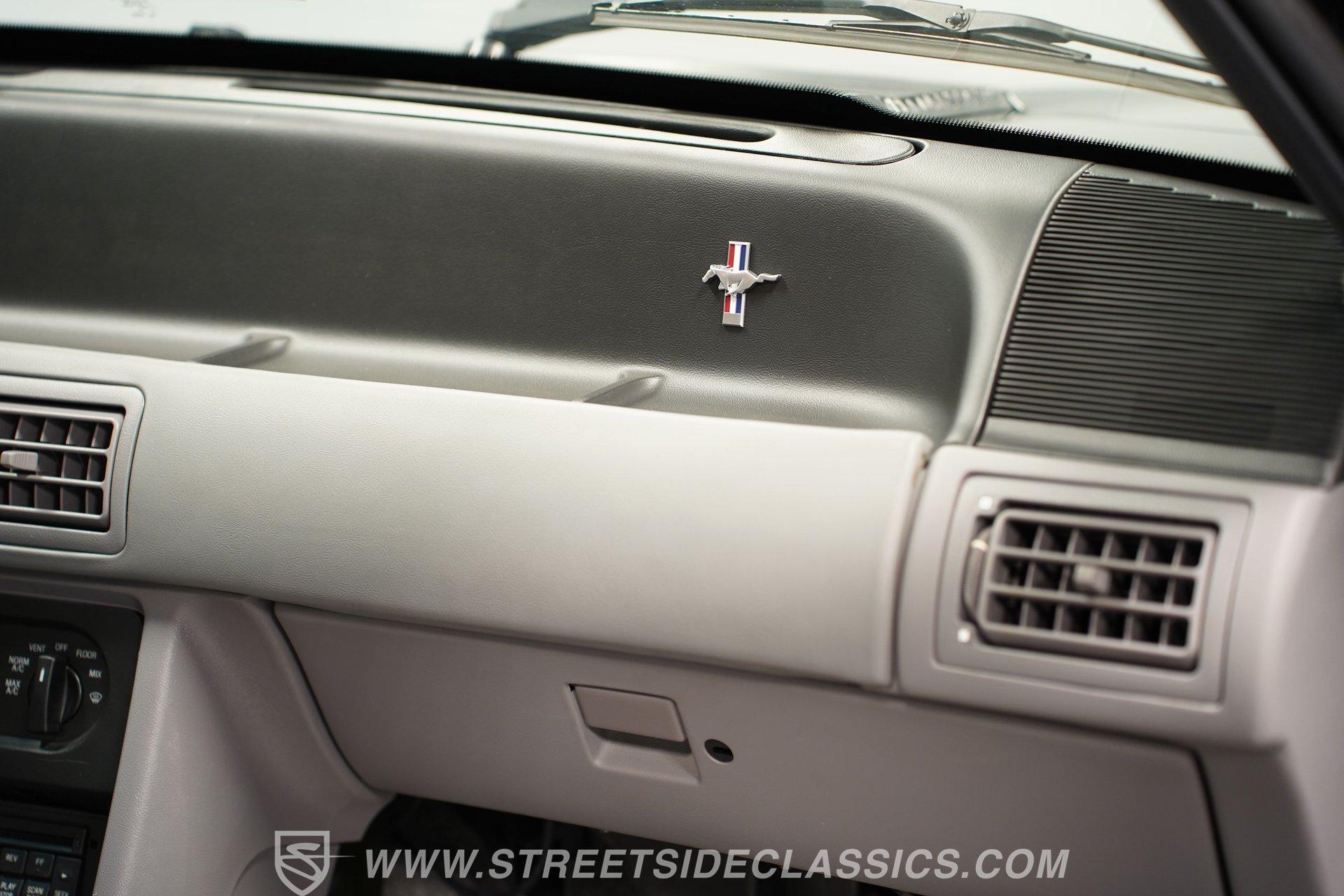 Inside, we find the original Opal Grey leather interior still protected by plastic. The four-spoke power-assisted steering wheel sits just ahead of a five-pod analog gauge cluster featuring a 7,000-rpm tachometer and 140-mph speedometer. The original AM/FM/CD head unit is in place, still sporting its factory plastic barcode cover, along with the factory HVAC controls and a barely touched shift knob, making this Mustang feel as though it just emerged from a three-decade-old time capsule. Sporting modern amenities such as power locks, windows, and mirrors to complement its air conditioning and cruise control, allowing this car to be comfy enough to drive every day.