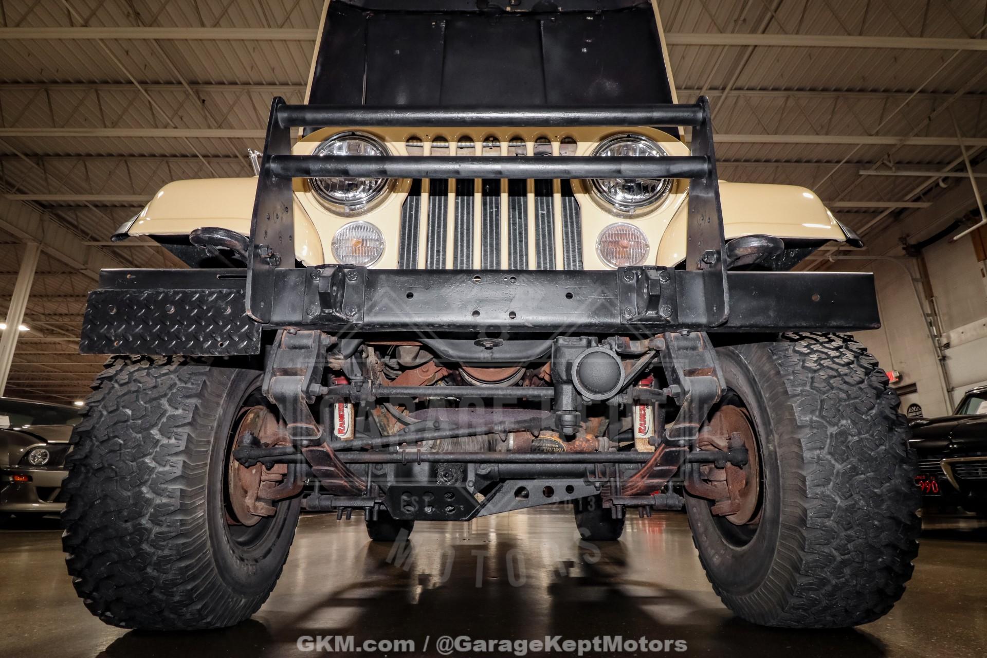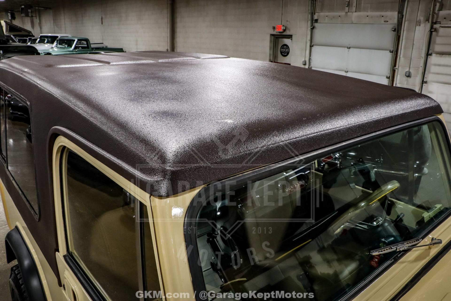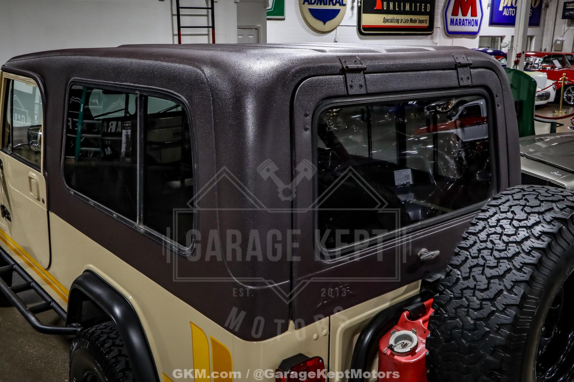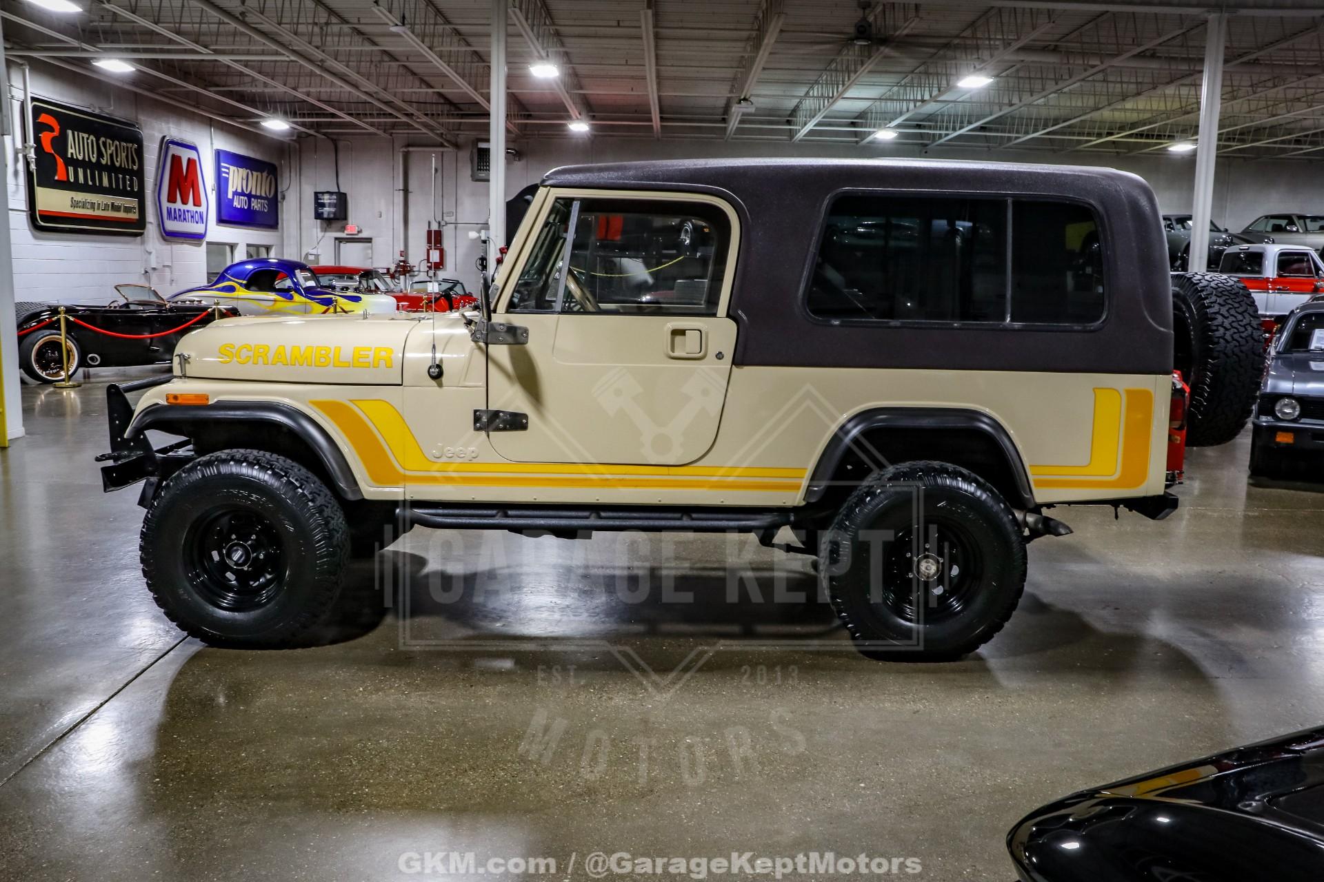 1982 Jeep CJ8 Scrambler- California 4x4- Sold New at County Wide Chrysler of Garden Grove, CA- Jamaican Beige Exterior with Scrambler Graphics over Nutmeg Denim Interior Upholstery- 350ci V8 with Fuel-injected TBI System- California BAR-Certified Engine Conversion (full emissions compliant)- 5-Speed NV4500 Manual Transmission- Bushard Clutch and Dana Axles- Full-Float Rear End with ARB Rear Air Locker- Onboard ARB air compressor- Magnaflow Exhaust and Lifted Suspension- Conn-Ferr Springs and Shackles with Rancho shocks- Baja Rockcrawler Wheels- 32x11.50x15 BFGoodrich All-Terrain Rires- Super-rare Full-size Hardtop- Factory Roll Bar and RCT Front and Rear Bumpers- Swing-Away Rear Tire Carrier with Full Size Matching Spare- Dual Rear-Mounted Jerry Cans- Full Stainless Hardware Package (hinges, latches, etc.)- Upgraded LED Headlight Kit- Bestop Low-Back Seats- Tilt Steering Wheel and Full Gauge Package- In-Dash Tachometer and Billet Dash Knobs- Kenwood CD Player with Bluetooth- Convenience Group- Original Bill of Sale, Window Sticker, and Promotional Brochures- 686 Miles Recorded Since Restored This 1982 Jeep CJ8 Scrambler represents a rare and exceptionally well-executed example of Jeep's long-wheelbase classic, combining California provenance, period-correct style, and thoughtfully engineered upgrades. Sold new at County Wide Chrysler of Garden Grove, California, this lifelong 4x4 benefits from a dry-climate history and remains accompanied by its original bill of sale, window sticker, and promotional brochures, documentation seldom seen with Scramblers today. Showing just 686 miles recorded since its restoration, this CJ8 presents as a collector-grade example that is equally capable on the road or trail.Finished in striking Jamaican Beige with factory-style Scrambler graphics, the exterior captures the unmistakable character that made the CJ8 iconic. A super-rare full-size hardtop adds both desirability and year-round usability, while factory roll bar, RCT front and rear bumpers, and a swing-away rear tire carrier with a full-size matching spare reinforce its rugged, purposeful stance. Dual rear-mounted jerry cans, upgraded LED headlight kit, Baja Rockcrawler wheels, and 32x11.50x15 BFGoodrich All-Terrain tires complete the look, blending classic Jeep aesthetics with modern functionality.Under the hood lies a powerful 350ci V8 equipped with a fuel-injected TBI system, delivering reliable performance with improved drivability. Importantly, this engine conversion is California BAR-certified, meaning it is fully emissions compliant, an extremely rare and valuable feature for a V8-swapped CJ in today's regulatory environment. Power is routed through a stout 5-speed NV4500 manual transmission, paired with a Bushard clutch and durable Dana axles, making this Scrambler as robust as it is enjoyable to drive.The drivetrain is further enhanced by a full-float rear end with an ARB rear air locker, offering exceptional traction when conditions demand it. An onboard ARB air compressor allows for quick locker engagement and tire adjustments on the fly. A lifted suspension featuring Conn-Ferr springs and shackles, combined with Rancho shocks, provides confident off-road capability while maintaining stable road manners. A Magnaflow exhaust adds a refined yet authoritative V8 tone befitting this classic Jeep.Inside, the cabin blends classic CJ simplicity with tasteful upgrades. Nutmeg denim upholstery is complemented by Bestop low-back seats, a tilt steering wheel, and a full gauge package with an in-dash tachometer and billet dash knobs. A Kenwood CD player with Bluetooth adds modern convenience, while the factory Convenience Group enhances everyday usability without detracting from the Scrambler's authentic feel.Finished with a full stainless hardware package throughoutcovering hinges, latches, and exterior details, this CJ8 Scrambler stands out for both its attention to detail and its rarity. With low post-restoration mileage, exceptional documentation, and a carefully engineered, emissions-compliant V8 conversion, this 1982 Jeep CJ8 Scrambler is a standout example that appeals equally to collectors, enthusiasts, and those seeking one of the most versatile and desirable classic Jeeps ever produced.