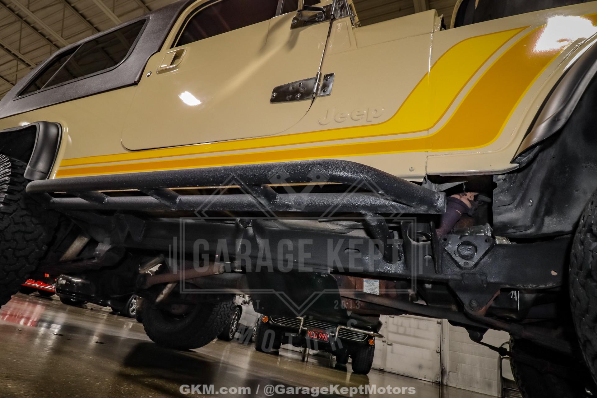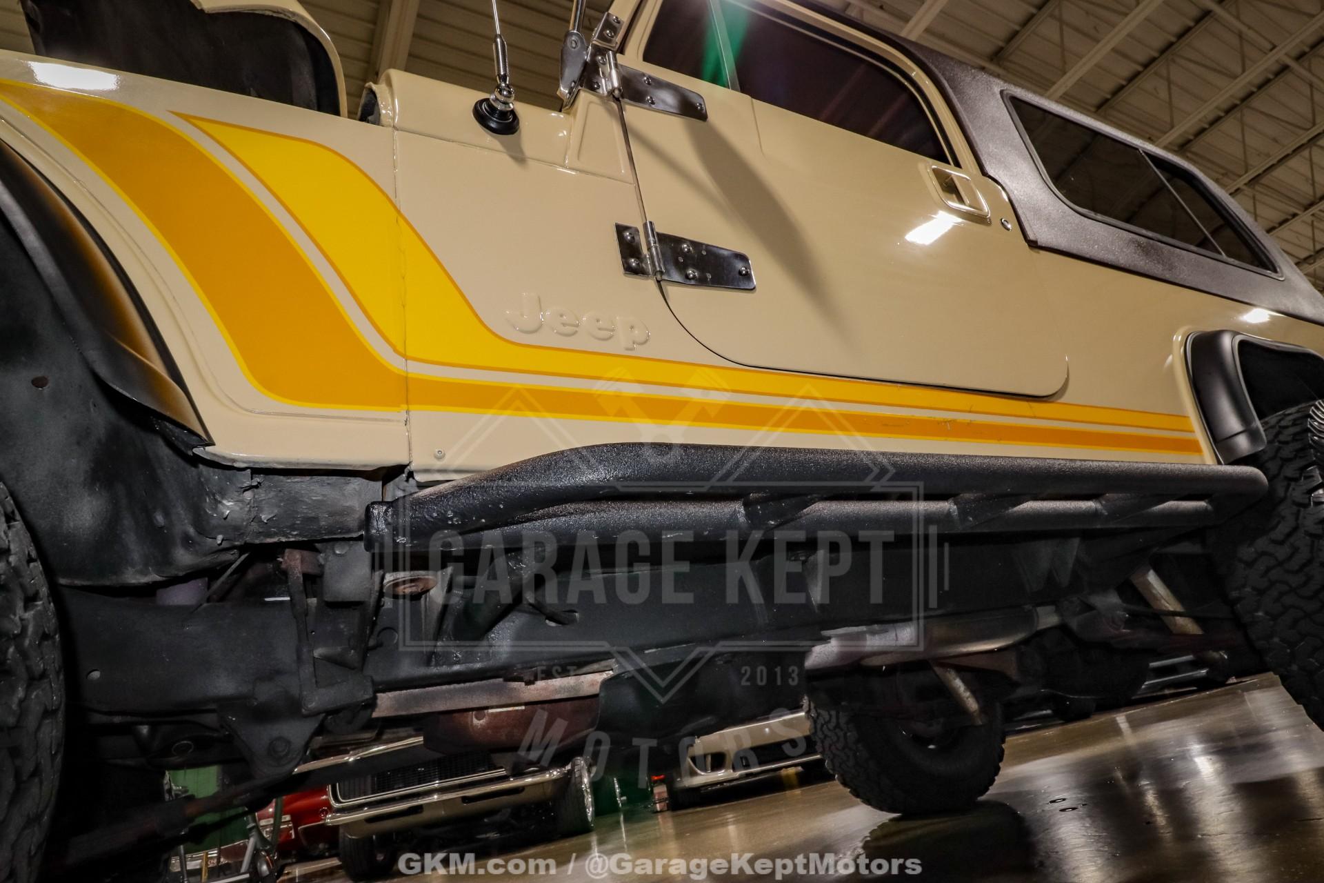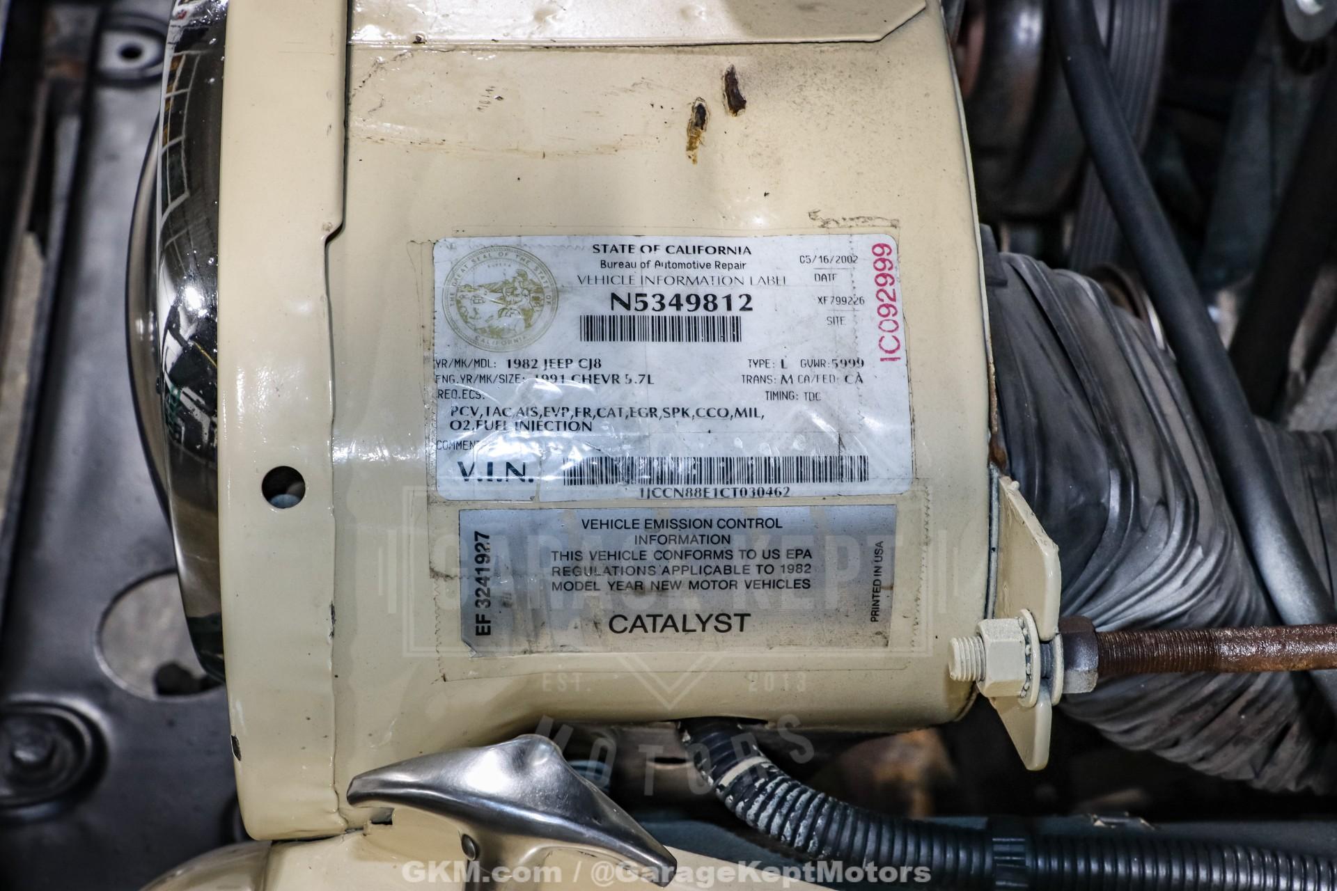 1982 Jeep CJ8 Scrambler- California 4x4- Sold New at County Wide Chrysler of Garden Grove, CA- Jamaican Beige Exterior with Scrambler Graphics over Nutmeg Denim Interior Upholstery- 350ci V8 with Fuel-injected TBI System- California BAR-Certified Engine Conversion (full emissions compliant)- 5-Speed NV4500 Manual Transmission- Bushard Clutch and Dana Axles- Full-Float Rear End with ARB Rear Air Locker- Onboard ARB air compressor- Magnaflow Exhaust and Lifted Suspension- Conn-Ferr Springs and Shackles with Rancho shocks- Baja Rockcrawler Wheels- 32x11.50x15 BFGoodrich All-Terrain Rires- Super-rare Full-size Hardtop- Factory Roll Bar and RCT Front and Rear Bumpers- Swing-Away Rear Tire Carrier with Full Size Matching Spare- Dual Rear-Mounted Jerry Cans- Full Stainless Hardware Package (hinges, latches, etc.)- Upgraded LED Headlight Kit- Bestop Low-Back Seats- Tilt Steering Wheel and Full Gauge Package- In-Dash Tachometer and Billet Dash Knobs- Kenwood CD Player with Bluetooth- Convenience Group- Original Bill of Sale, Window Sticker, and Promotional Brochures- 686 Miles Recorded Since Restored This 1982 Jeep CJ8 Scrambler represents a rare and exceptionally well-executed example of Jeep's long-wheelbase classic, combining California provenance, period-correct style, and thoughtfully engineered upgrades. Sold new at County Wide Chrysler of Garden Grove, California, this lifelong 4x4 benefits from a dry-climate history and remains accompanied by its original bill of sale, window sticker, and promotional brochures, documentation seldom seen with Scramblers today. Showing just 686 miles recorded since its restoration, this CJ8 presents as a collector-grade example that is equally capable on the road or trail.Finished in striking Jamaican Beige with factory-style Scrambler graphics, the exterior captures the unmistakable character that made the CJ8 iconic. A super-rare full-size hardtop adds both desirability and year-round usability, while factory roll bar, RCT front and rear bumpers, and a swing-away rear tire carrier with a full-size matching spare reinforce its rugged, purposeful stance. Dual rear-mounted jerry cans, upgraded LED headlight kit, Baja Rockcrawler wheels, and 32x11.50x15 BFGoodrich All-Terrain tires complete the look, blending classic Jeep aesthetics with modern functionality.Under the hood lies a powerful 350ci V8 equipped with a fuel-injected TBI system, delivering reliable performance with improved drivability. Importantly, this engine conversion is California BAR-certified, meaning it is fully emissions compliant, an extremely rare and valuable feature for a V8-swapped CJ in today's regulatory environment. Power is routed through a stout 5-speed NV4500 manual transmission, paired with a Bushard clutch and durable Dana axles, making this Scrambler as robust as it is enjoyable to drive.The drivetrain is further enhanced by a full-float rear end with an ARB rear air locker, offering exceptional traction when conditions demand it. An onboard ARB air compressor allows for quick locker engagement and tire adjustments on the fly. A lifted suspension featuring Conn-Ferr springs and shackles, combined with Rancho shocks, provides confident off-road capability while maintaining stable road manners. A Magnaflow exhaust adds a refined yet authoritative V8 tone befitting this classic Jeep.Inside, the cabin blends classic CJ simplicity with tasteful upgrades. Nutmeg denim upholstery is complemented by Bestop low-back seats, a tilt steering wheel, and a full gauge package with an in-dash tachometer and billet dash knobs. A Kenwood CD player with Bluetooth adds modern convenience, while the factory Convenience Group enhances everyday usability without detracting from the Scrambler's authentic feel.Finished with a full stainless hardware package throughoutcovering hinges, latches, and exterior details, this CJ8 Scrambler stands out for both its attention to detail and its rarity. With low post-restoration mileage, exceptional documentation, and a carefully engineered, emissions-compliant V8 conversion, this 1982 Jeep CJ8 Scrambler is a standout example that appeals equally to collectors, enthusiasts, and those seeking one of the most versatile and desirable classic Jeeps ever produced.