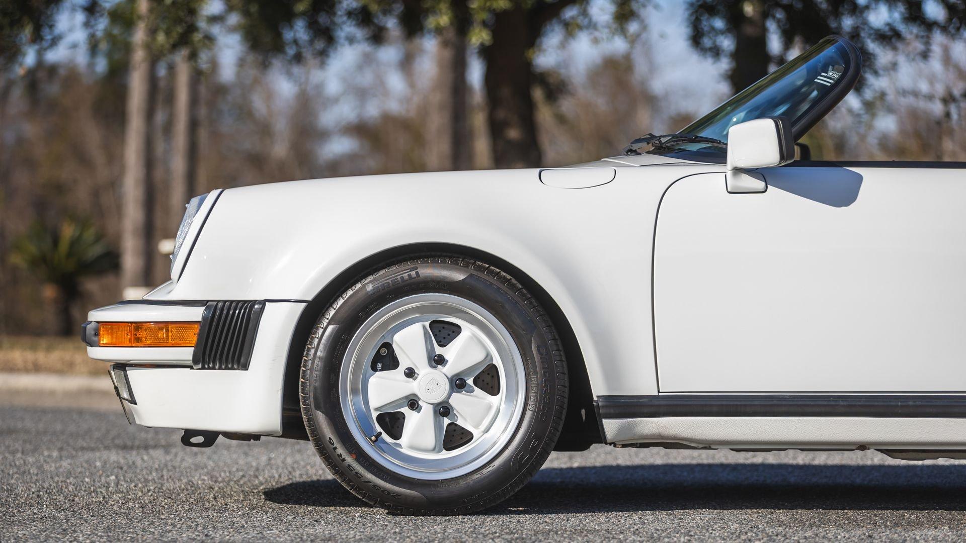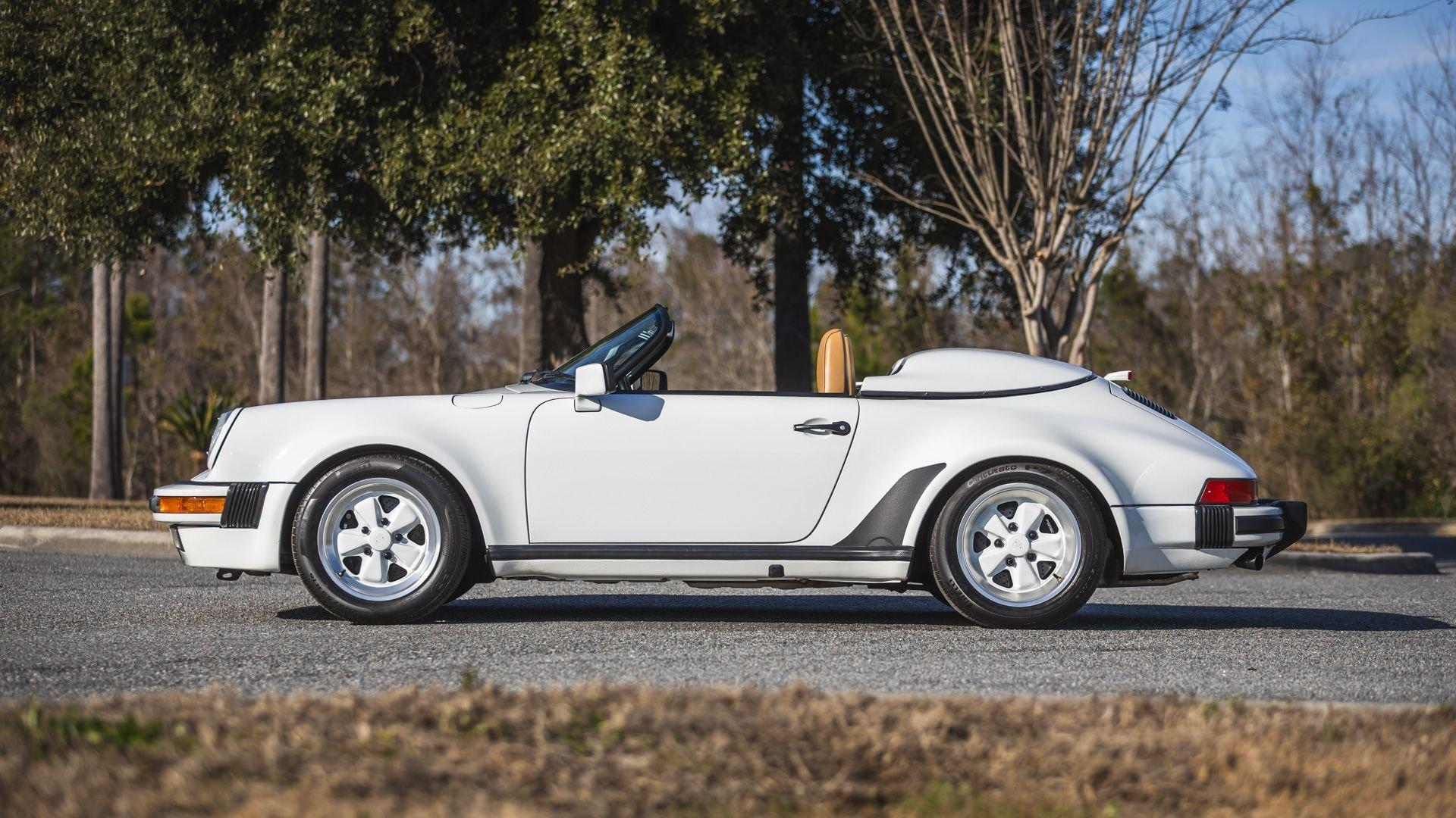 To celebrate both the 25th anniversary of the 911 and the final year of the beloved G-Model, Porsche unveiled the limited-production 1989 911 Speedster as a striking tribute to the original 356 Speedster and a bold statement in its own right. First previewed as the Speedster Studie at the 1987 Frankfurt Motor Show, the production version retained the concept's raked wraparound windshield, double-hump clamshell tonneau cover, and exciting minimalistic character. Though based on the Carrera 3.2, most Speedsters were constructed using the Turbo's wider bodywork, giving the car an aggressive stance accentuated by Turbo-width 16-inch Fuchs forged alloy wheels. Power came from Porsche's 3.2-liter air-cooled flat-six, mated to the refined G50 five-speed manual transmission delivering a visceral top-down driving experience. Chief designer Tony Lapine ensured the styling carried cues from the 356 while remaining true to the modern 911 form.
