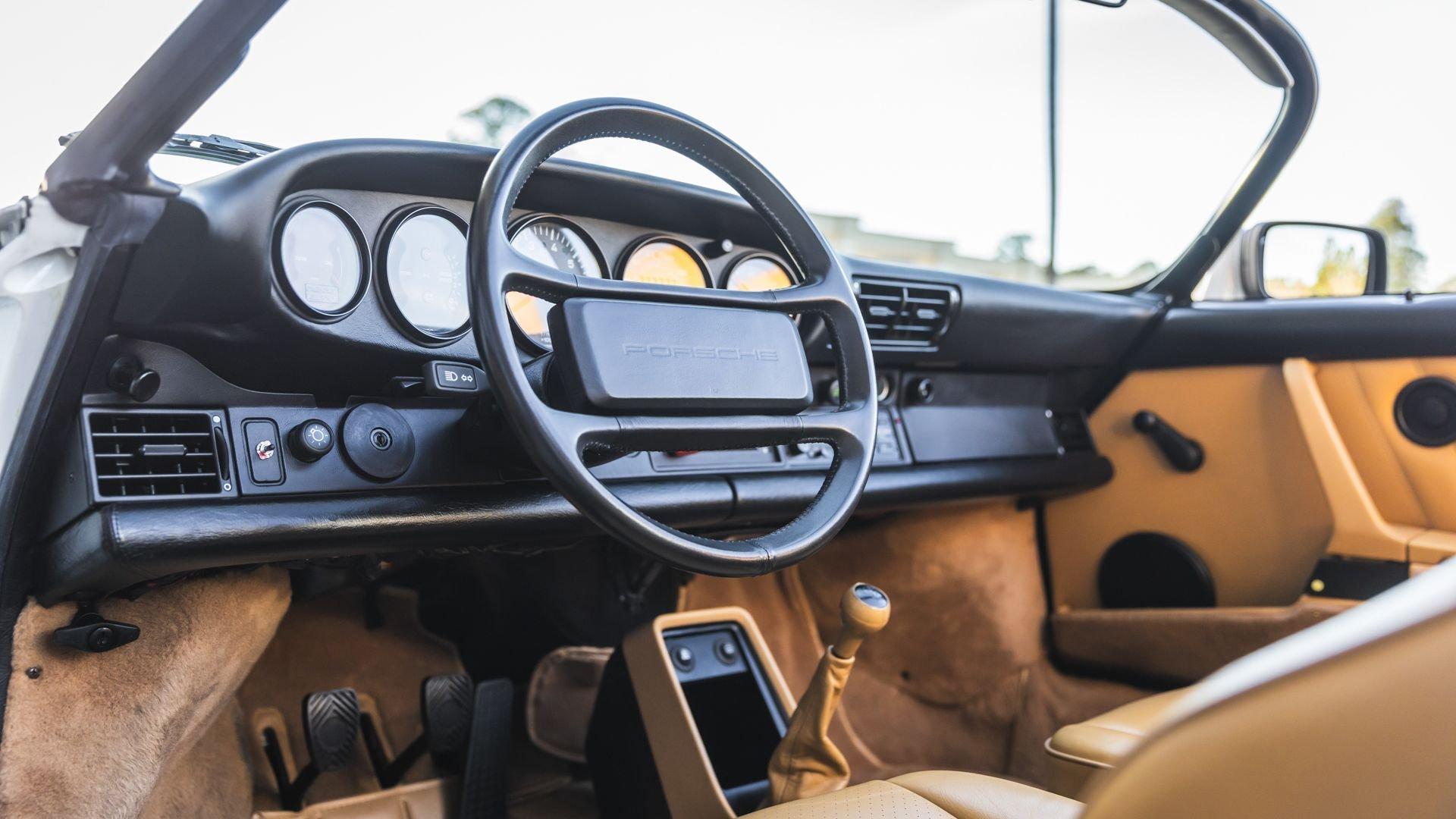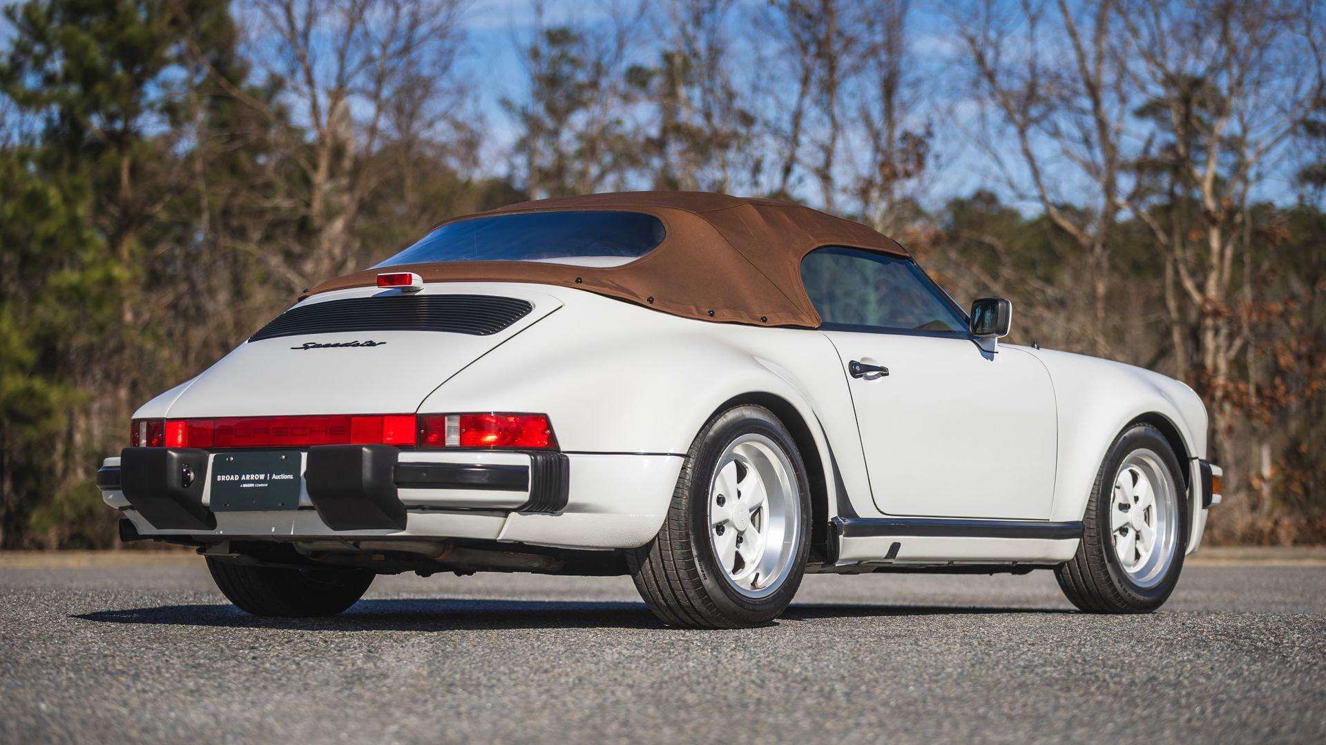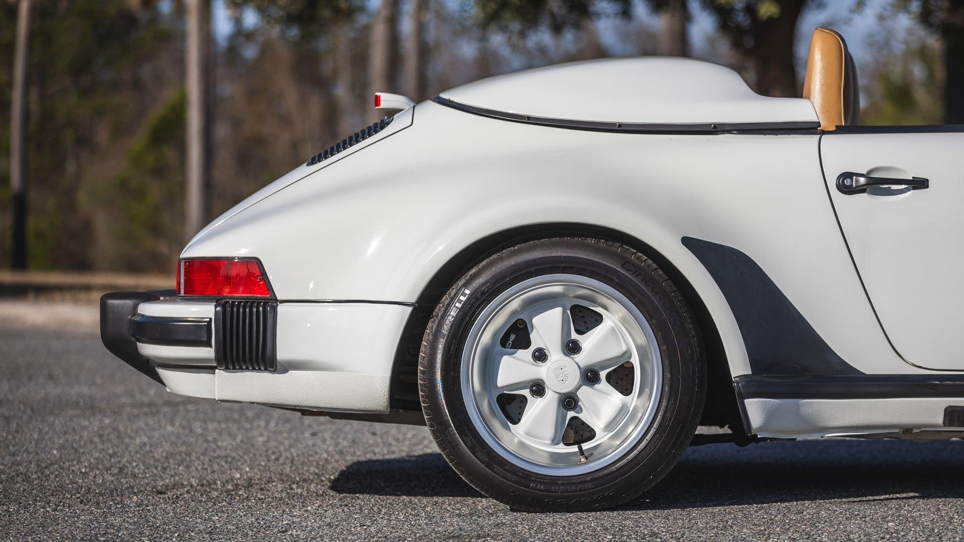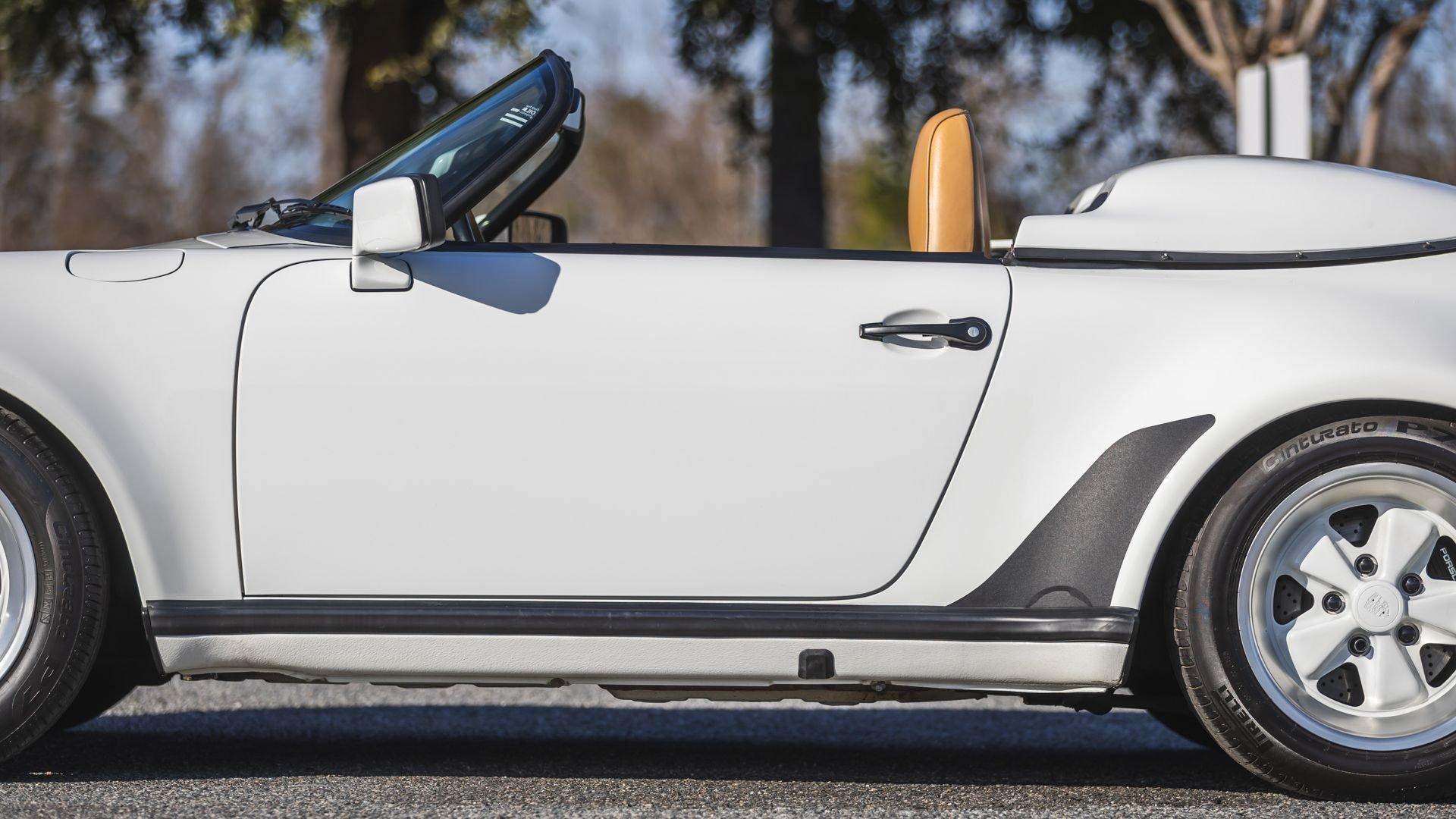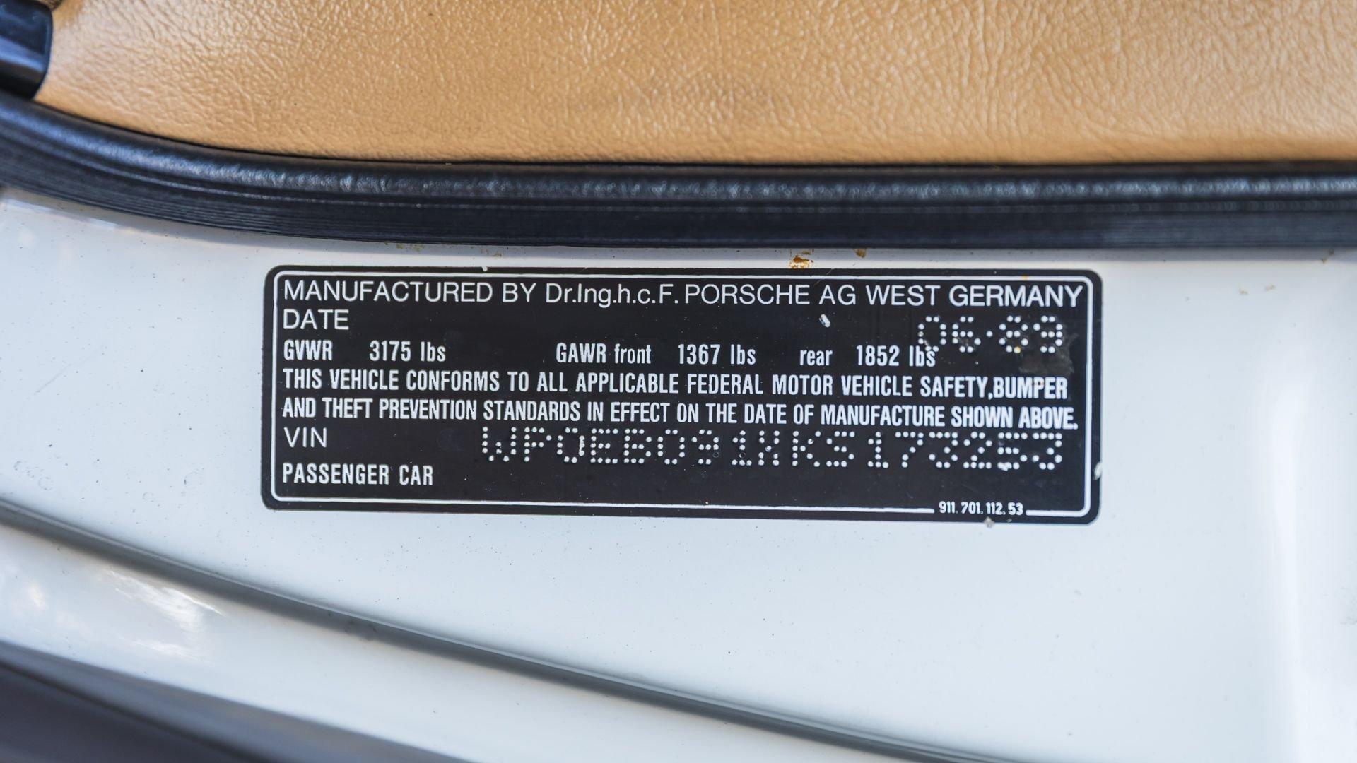 Completed in June 1989, this 911 Speedster dates from the closing months of production. The under-hood options sticker specifies “908” Grand Prix White, a color originally reserved only for the 1973 911 Carrera RS and a “LE” Black leather interior. The car is presently upholstered in tan leather with a matching tan top, a color combination it appears to have carried since new. Optional equipment includes a Blaupunkt Reno radio, short shifter, and Grand Prix White–painted Fuchs wheels, along with the rear storage compartment fitted in place of rear seats to accommodate the Speedster's distinctive clamshell cover.