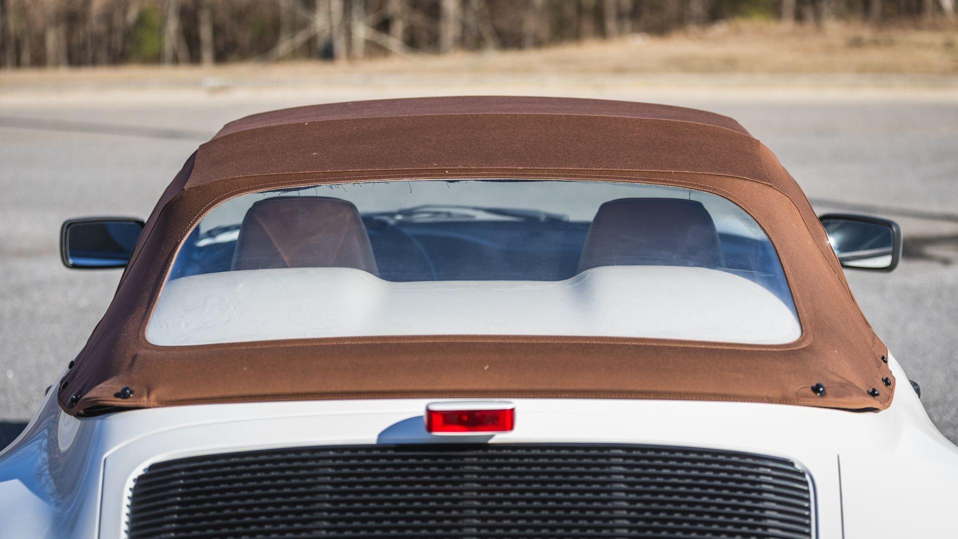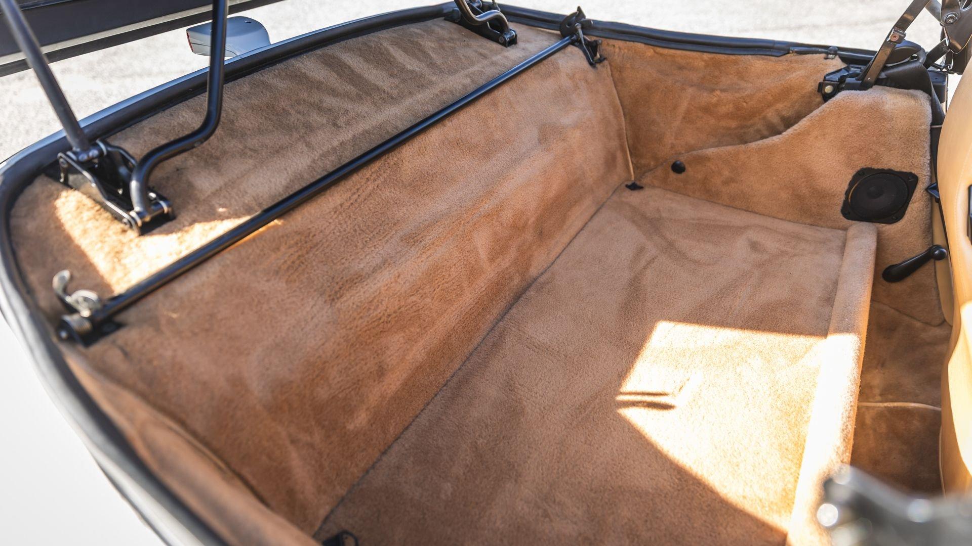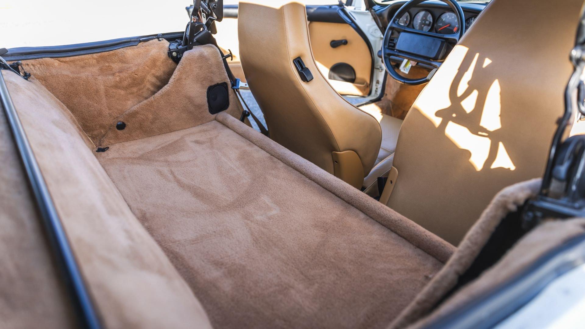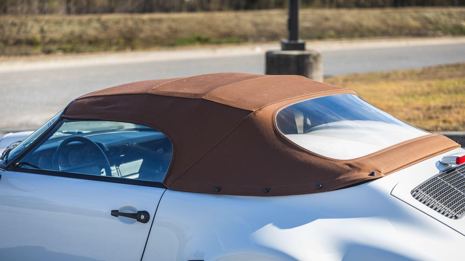 Completed in June 1989, this 911 Speedster dates from the closing months of production. The under-hood options sticker specifies “908” Grand Prix White, a color originally reserved only for the 1973 911 Carrera RS and a “LE” Black leather interior. The car is presently upholstered in tan leather with a matching tan top, a color combination it appears to have carried since new. Optional equipment includes a Blaupunkt Reno radio, short shifter, and Grand Prix White–painted Fuchs wheels, along with the rear storage compartment fitted in place of rear seats to accommodate the Speedster's distinctive clamshell cover.