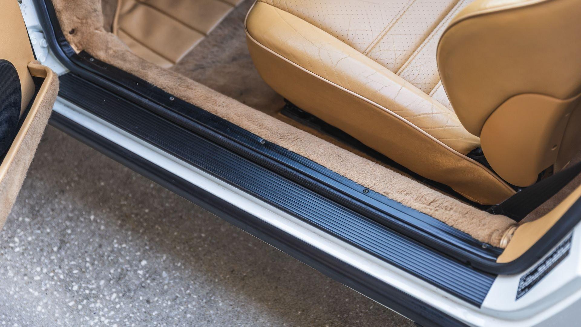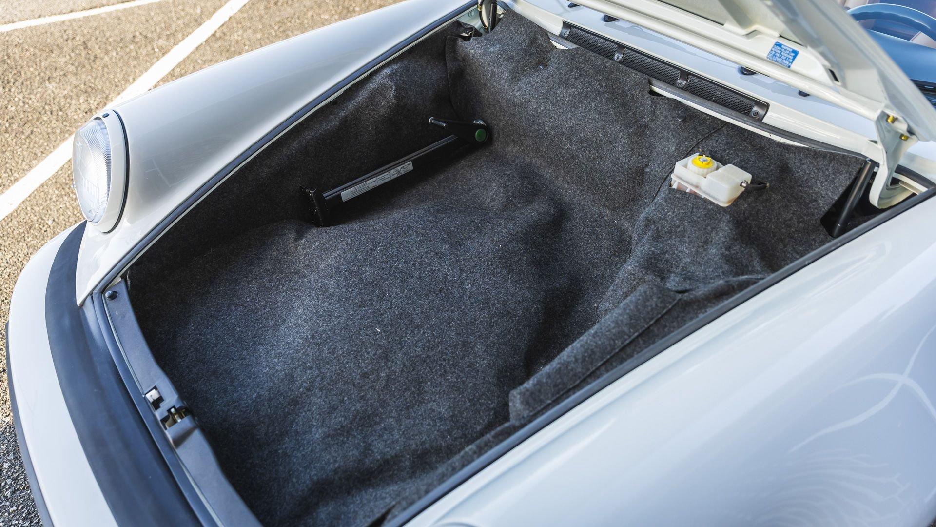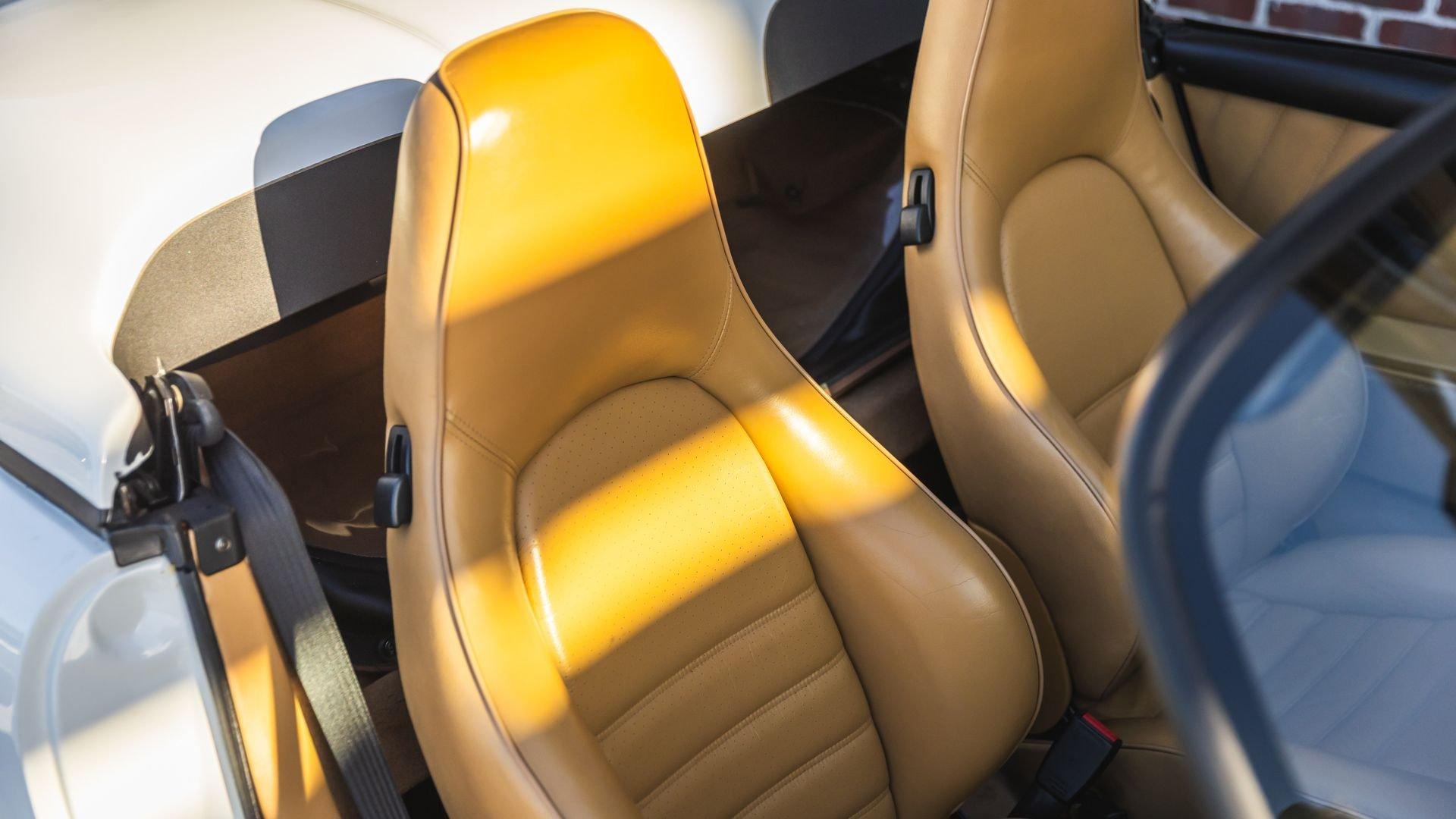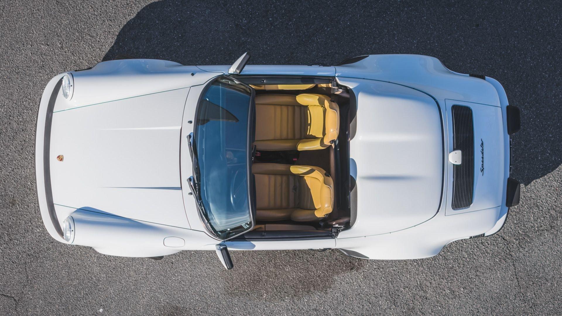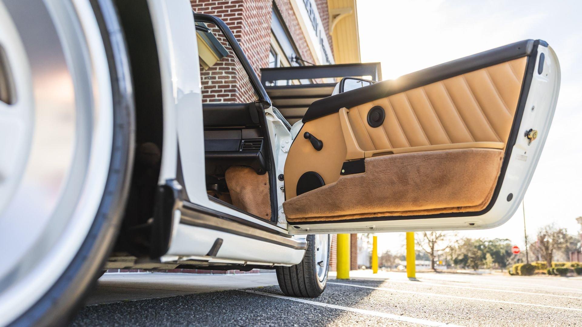 Completed in June 1989, this 911 Speedster dates from the closing months of production. The under-hood options sticker specifies “908” Grand Prix White, a color originally reserved only for the 1973 911 Carrera RS and a “LE” Black leather interior. The car is presently upholstered in tan leather with a matching tan top, a color combination it appears to have carried since new. Optional equipment includes a Blaupunkt Reno radio, short shifter, and Grand Prix White–painted Fuchs wheels, along with the rear storage compartment fitted in place of rear seats to accommodate the Speedster's distinctive clamshell cover.