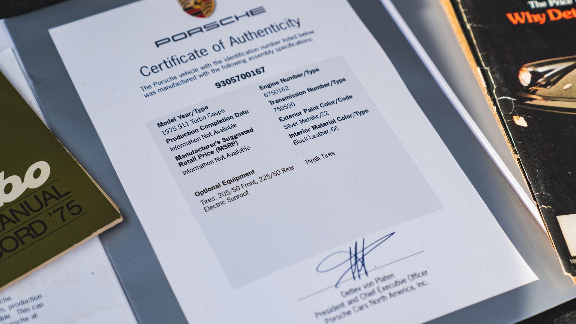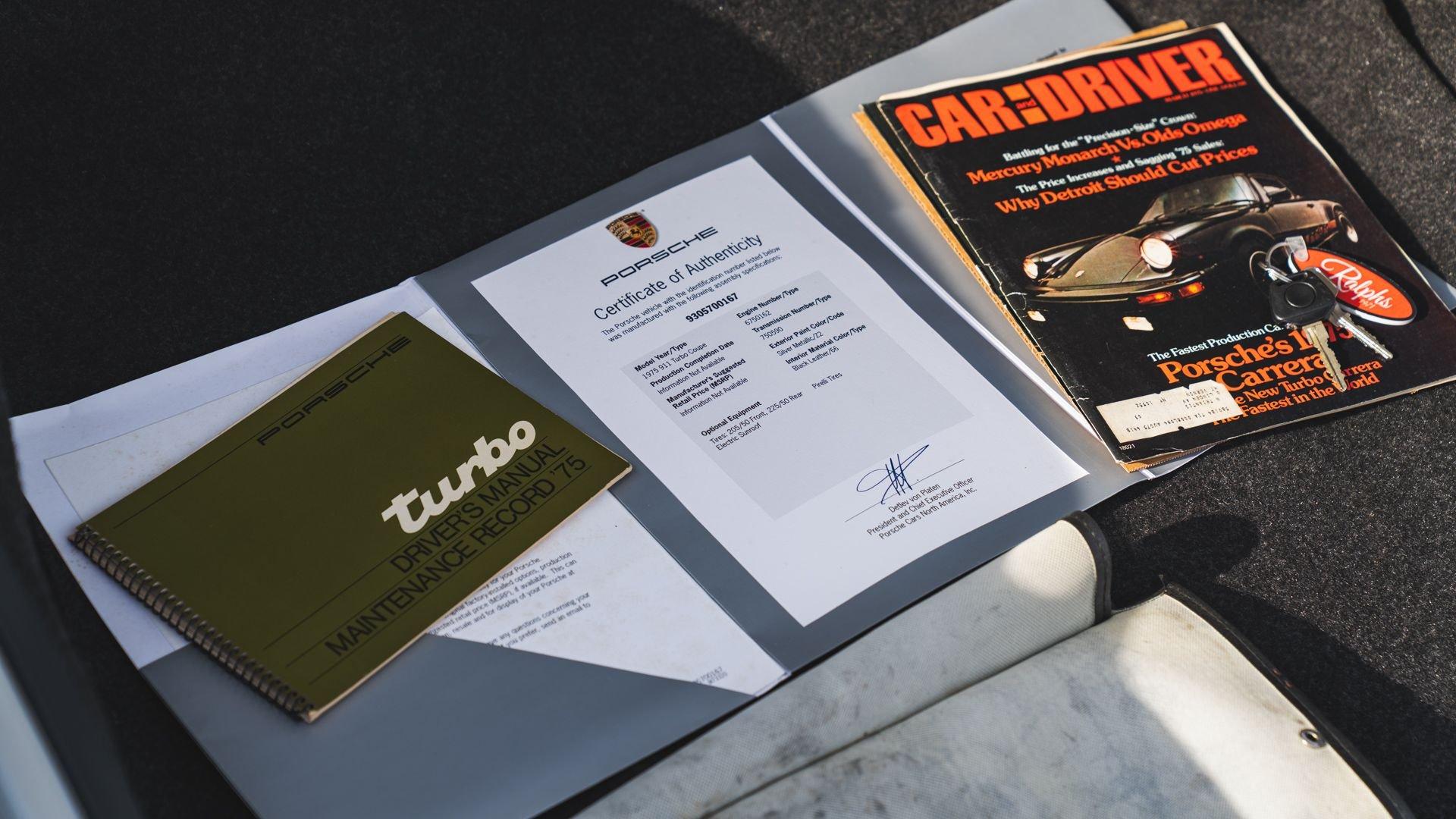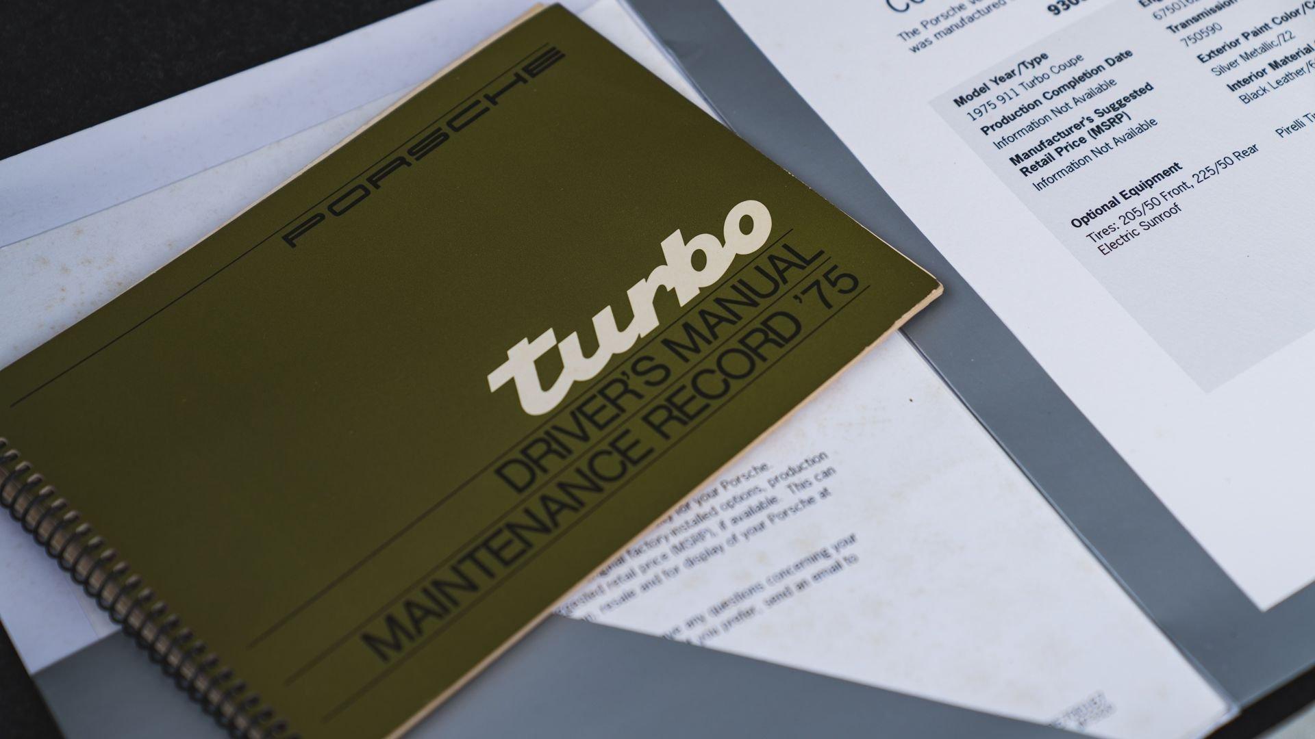 Nearly every mechanical system was disassembled and gone through while at Dawe's. Both the matching-numbers engine and four-speed transmission were rebuilt and tested by the technicians at Dawe's. The fuel, oil, braking system, pedal cluster, suspension, and electrics were all attended to, and a correct set of 15-inch Fuchs wheels were sourced and refinished. The interior received a set of factory Recaro sport seats trimmed in Black perforated leather by Autobahn Interiors, along with Black carpeting, a retrimmed dashboard, and a Blaupunkt stereo. Perhaps the crowning achievement is an original, ultra-rare 1975 Driver's Manual and Maintenance Record sourced at great expense from a fellow 1975 911 Turbo owner. Following the completion of its two-year, six-figure restoration, Ur-turbo 0167 has seen routine service from Ralph's Auto Service, one of the oldest continuously operating independent Porsche service facilities in the United States.