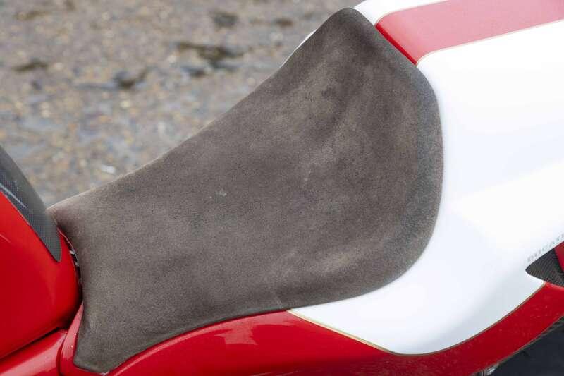 - Recommission included engine removal with Desmo valve tolerances set, repainted cases, new cambelts, new oils, brake service with new lines, new brake pads, new tyres, wheel repaint to original colour, fork service with new seals, rear shock service, new chain, new battery, NOS new front brake master cylinder, bearings replaced or regreased and single seat conversion with a suede pad, Ducati Performance foot pegs, JHP steering damper, carbon front mud guard and chain guard, 45mm Termignoni exhaust system, Casoli clocks and Brembo floating discs
