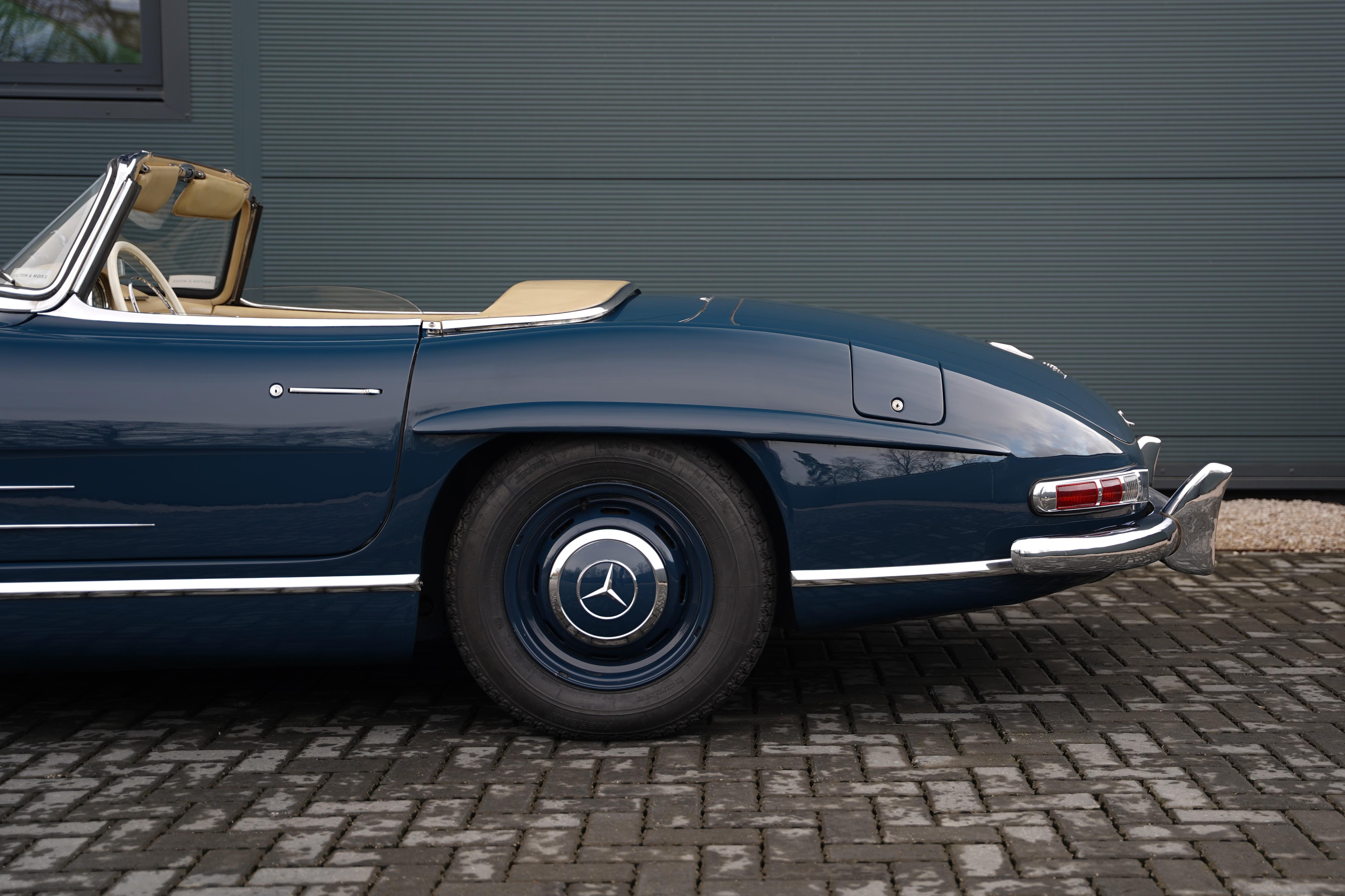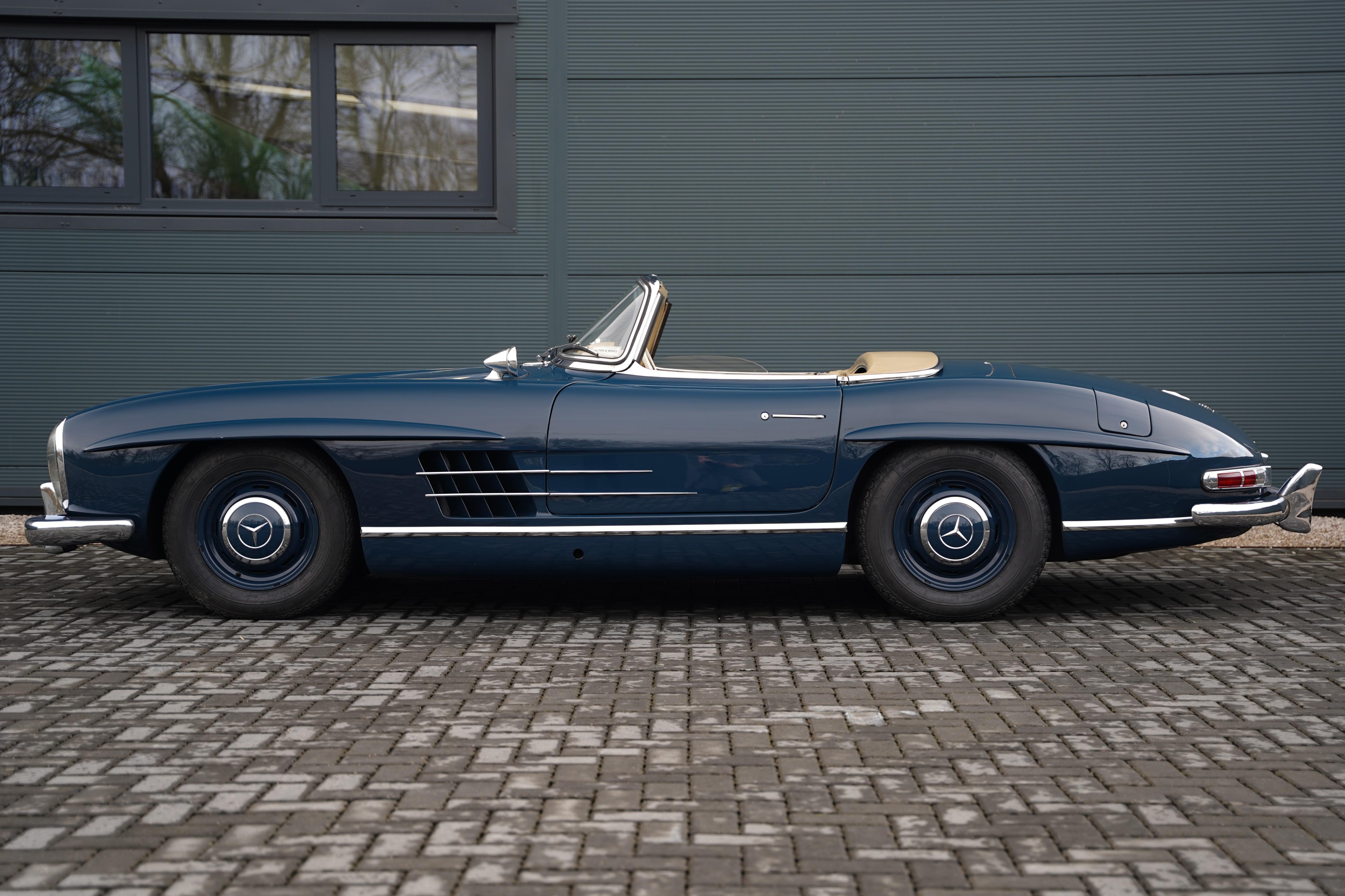 More than 80% of the SL’s total production was shipped to the United States, with this particular example being delivered in October 1958. As per the data card, the car was originally finished in DB180 Silver Grey Metallic with a striking 1079 Red leather interior. By 1988, it had returned to Germany under the care of a collector who commissioned a restoration by Borm Autolackiererei. This would see a bare metal restoration completed, with the car then being finished in Konigs Blau over a Biscuit leather interior which the car retains today. The restoration would be complete by August 1988 and the car would remain in Germany until its importation into the UK by Antony Cluck, who owned the car until 2002, at which point it was sold via auction.