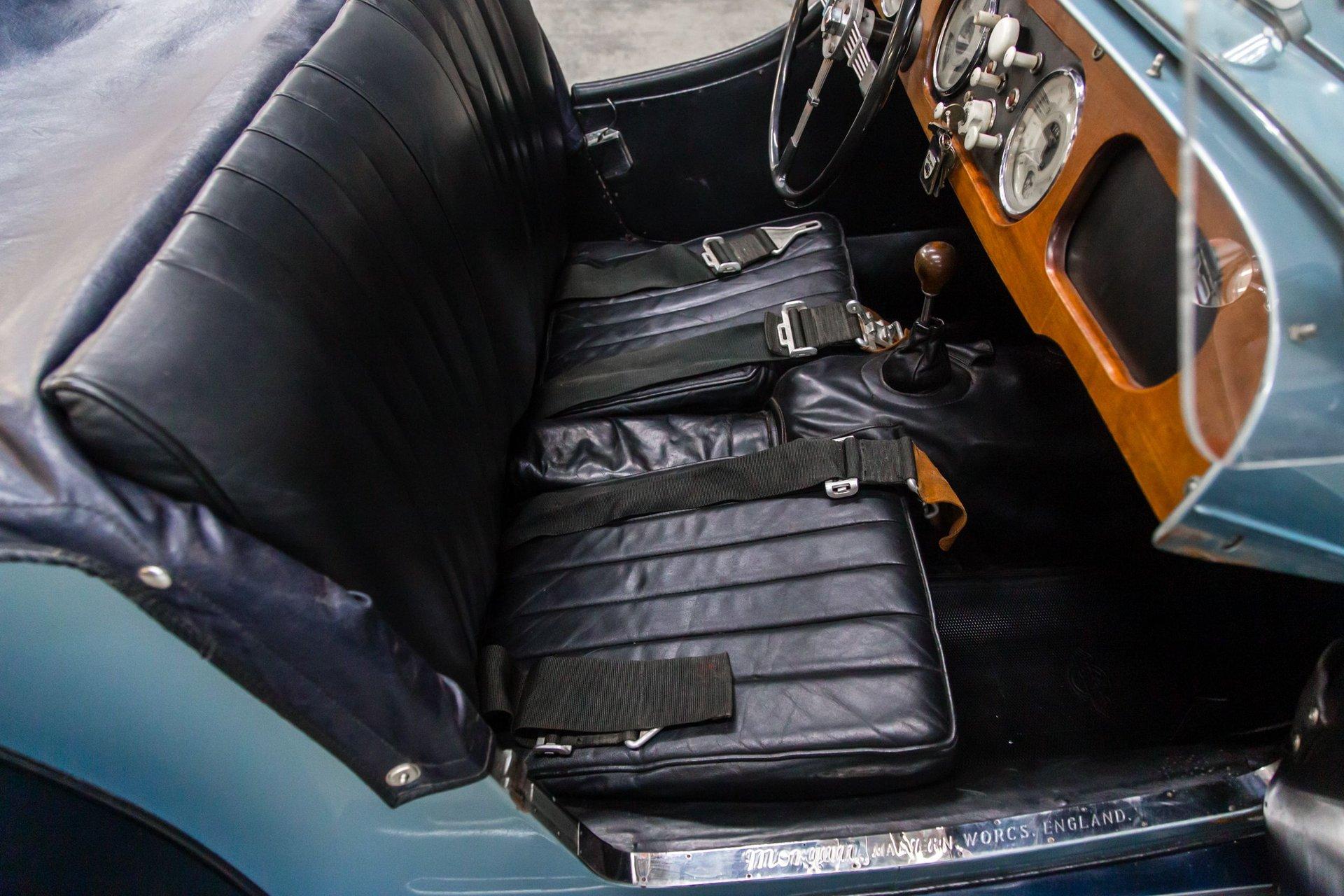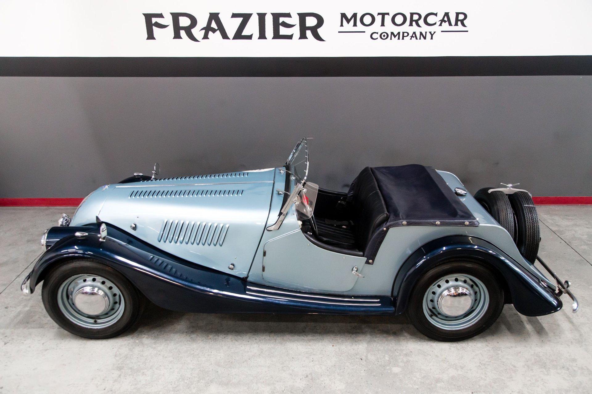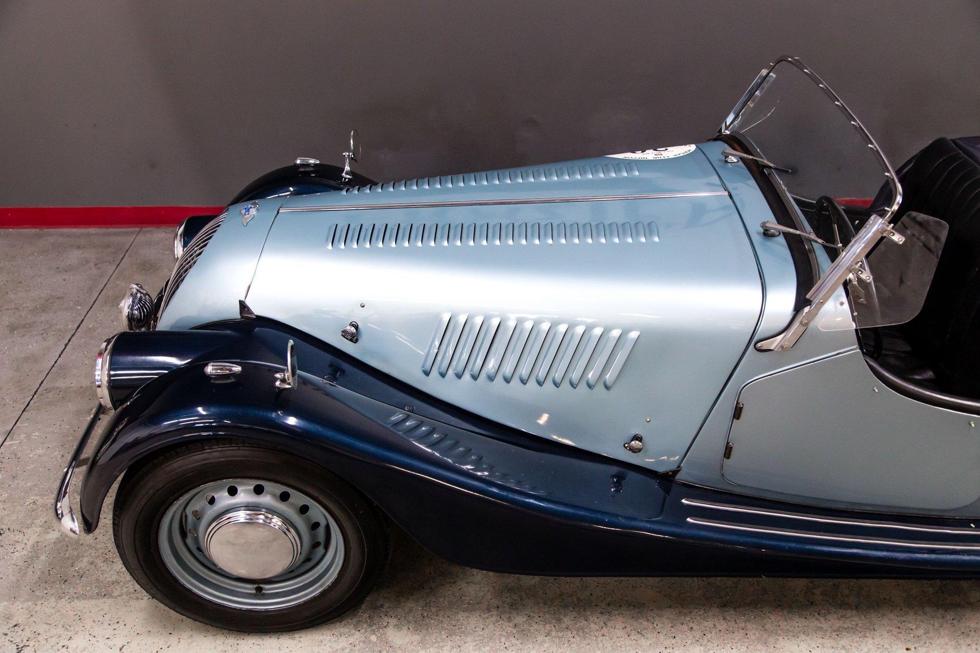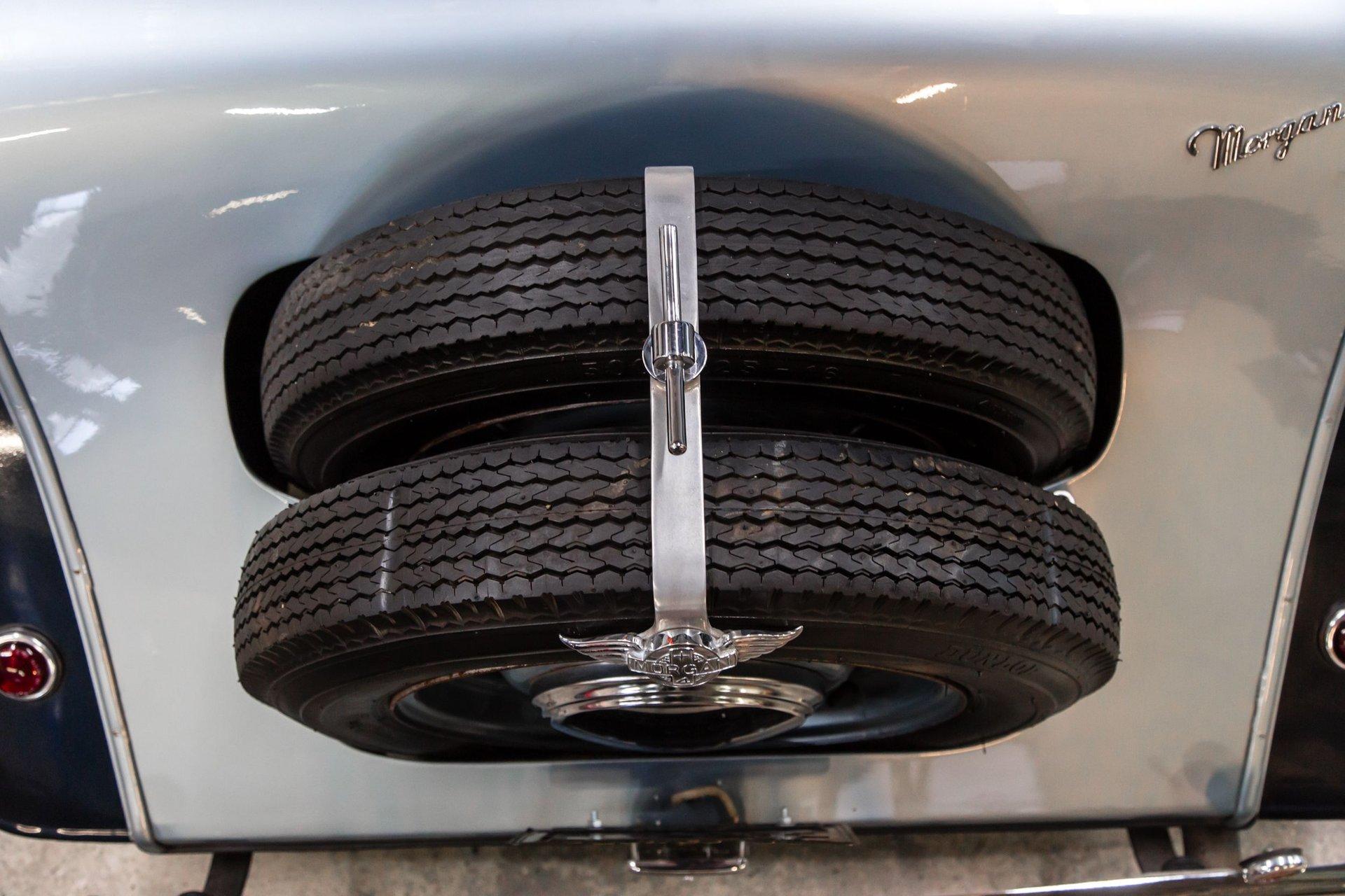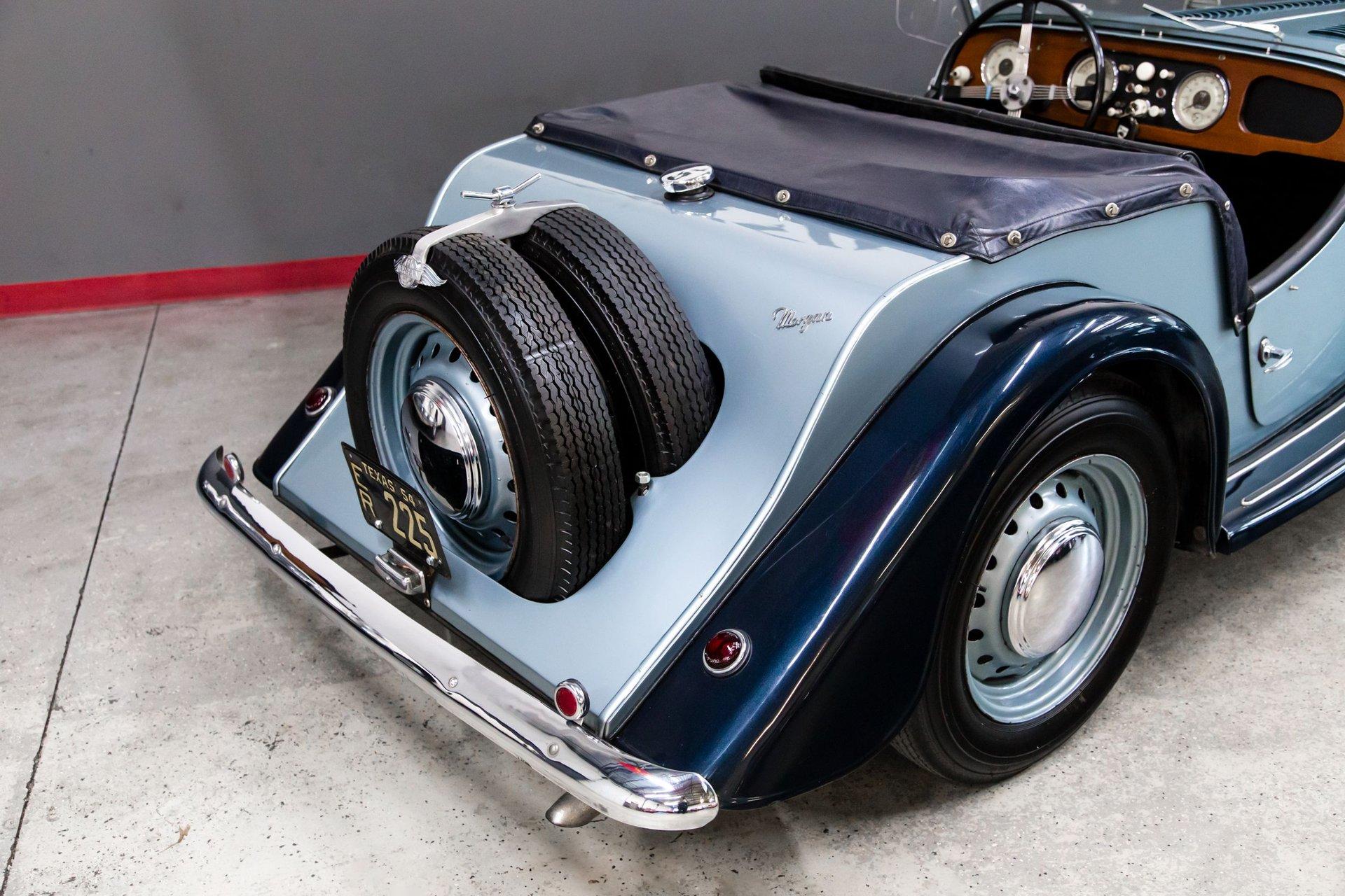 Powered by a replacement 1,991cc inline-four paired with a four-speed manual transmission, the car is finished in two-tone blue over black leather. Equipment includes a black soft top, a tonneau cover, 16″ steel wheels, hubcaps, dual spare wheels and tires, dual SU carburetors, louvered hood panels, a wood dashboard, a Bluemels Brooklands steering wheel, and seatbelts. The car comes with the Morgan Motor Company Chassis Record and a tool kit.