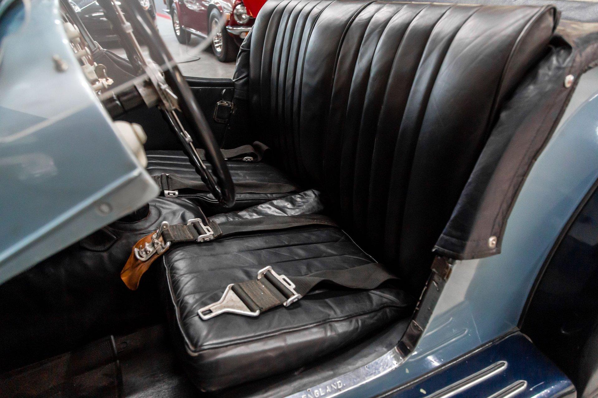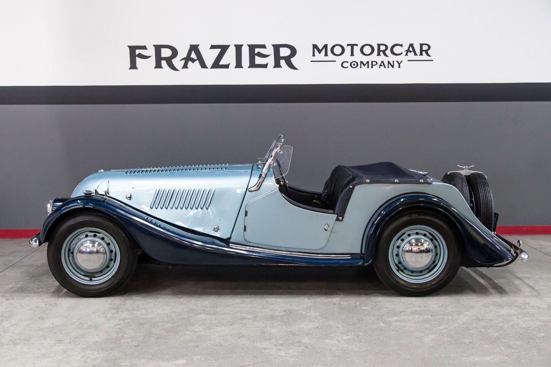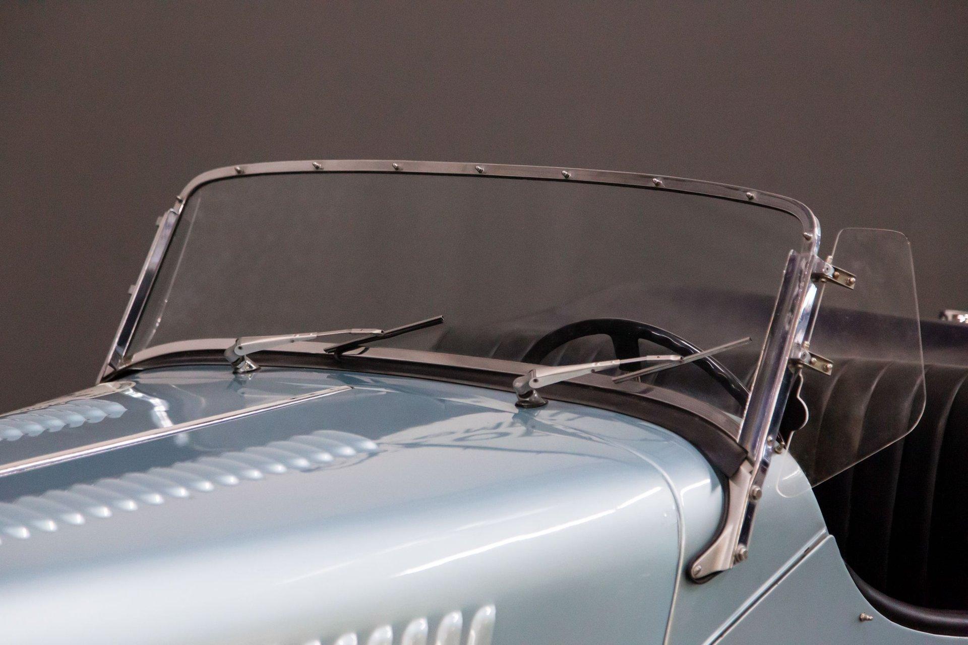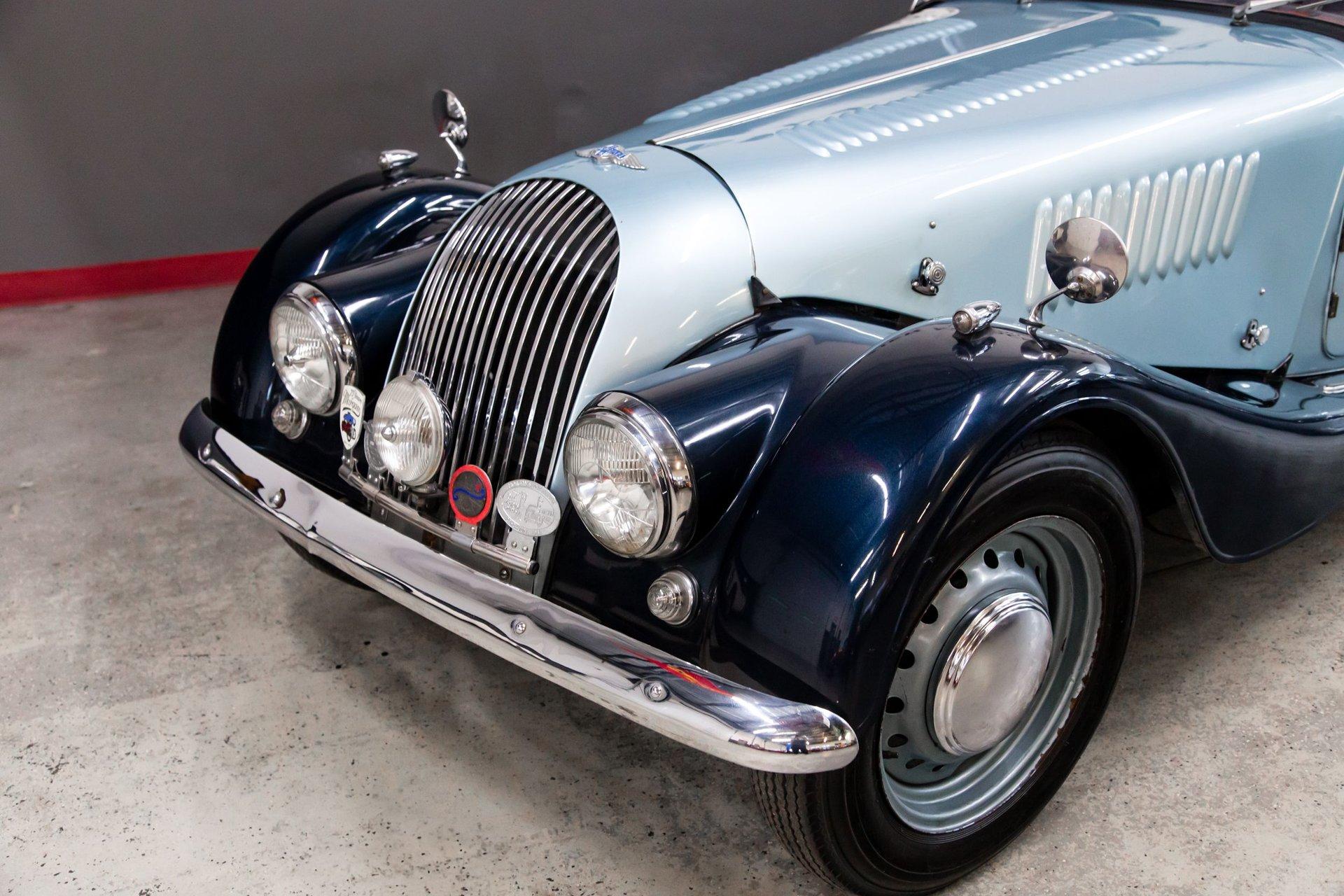 Powered by a replacement 1,991cc inline-four paired with a four-speed manual transmission, the car is finished in two-tone blue over black leather. Equipment includes a black soft top, a tonneau cover, 16″ steel wheels, hubcaps, dual spare wheels and tires, dual SU carburetors, louvered hood panels, a wood dashboard, a Bluemels Brooklands steering wheel, and seatbelts. The car comes with the Morgan Motor Company Chassis Record and a tool kit.