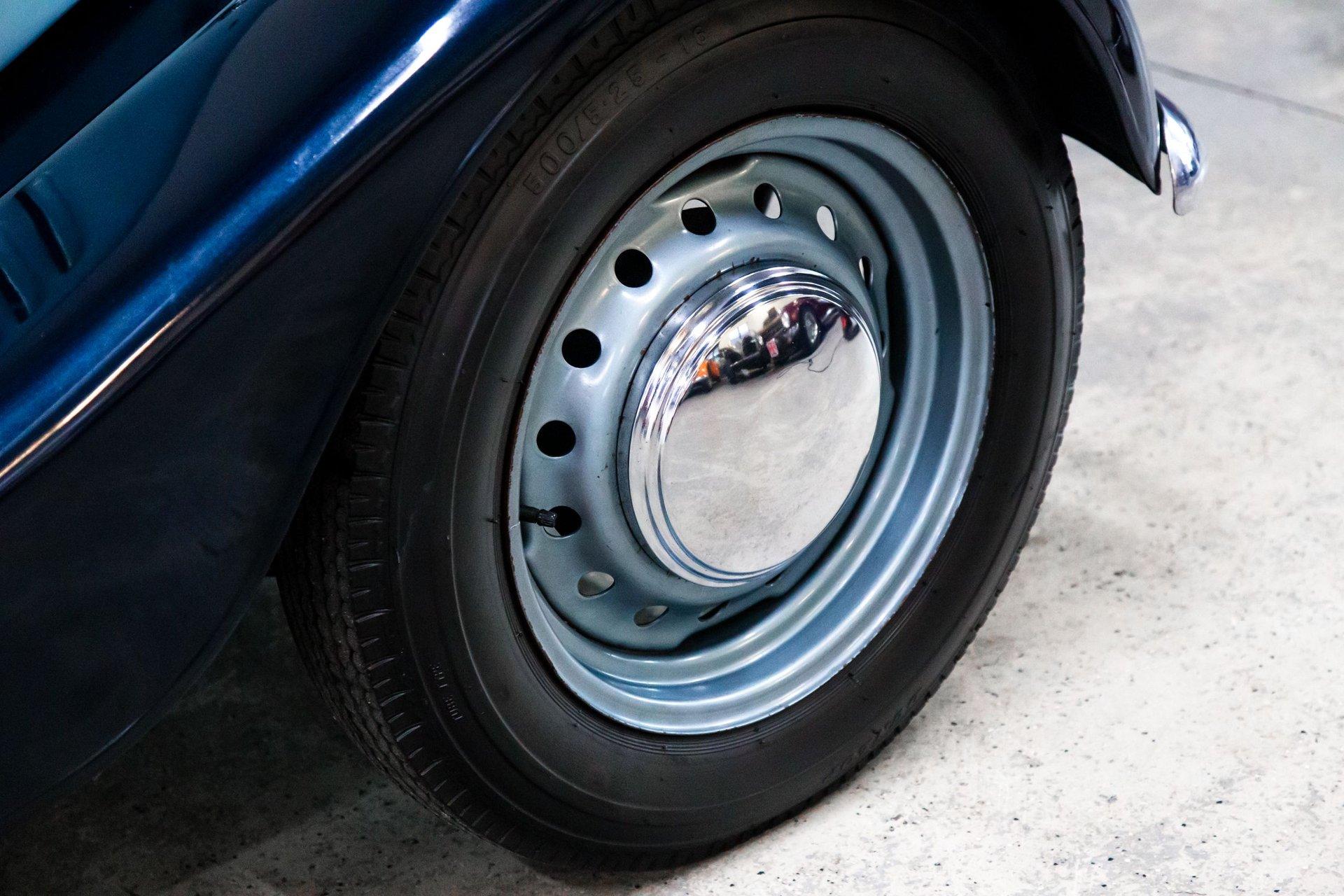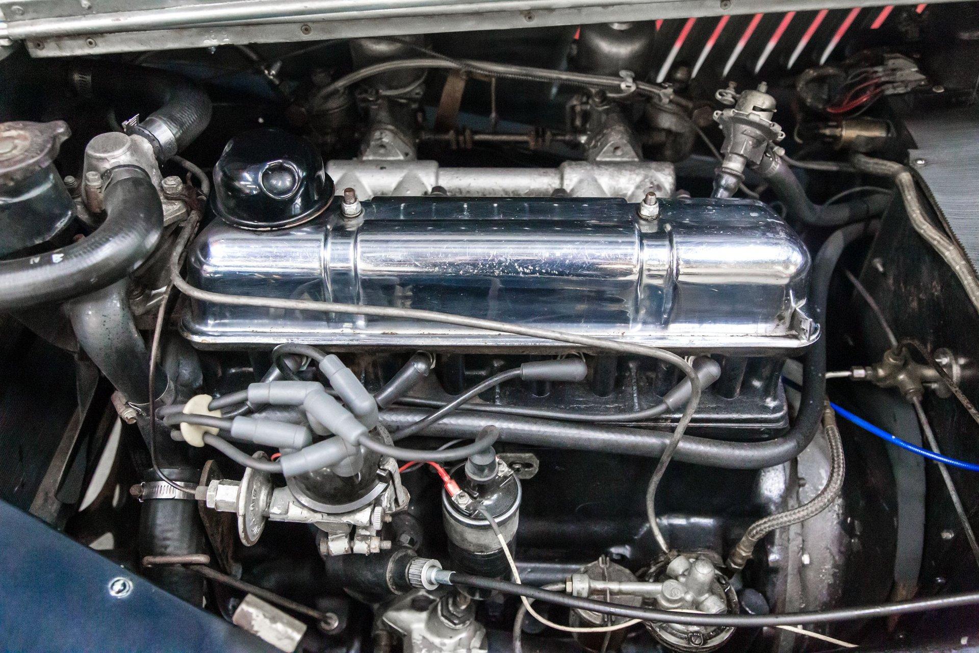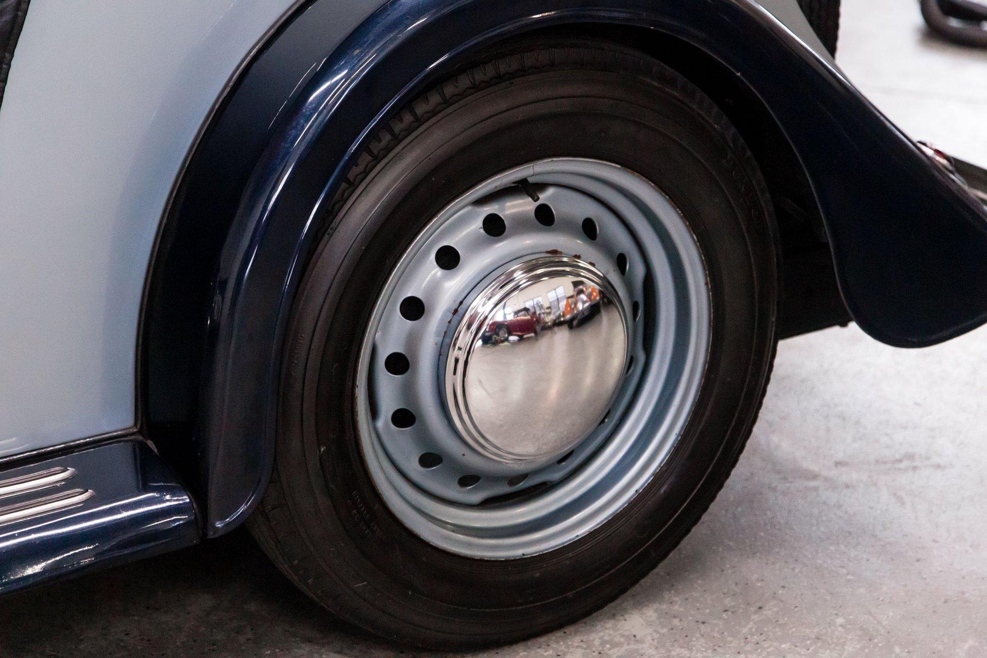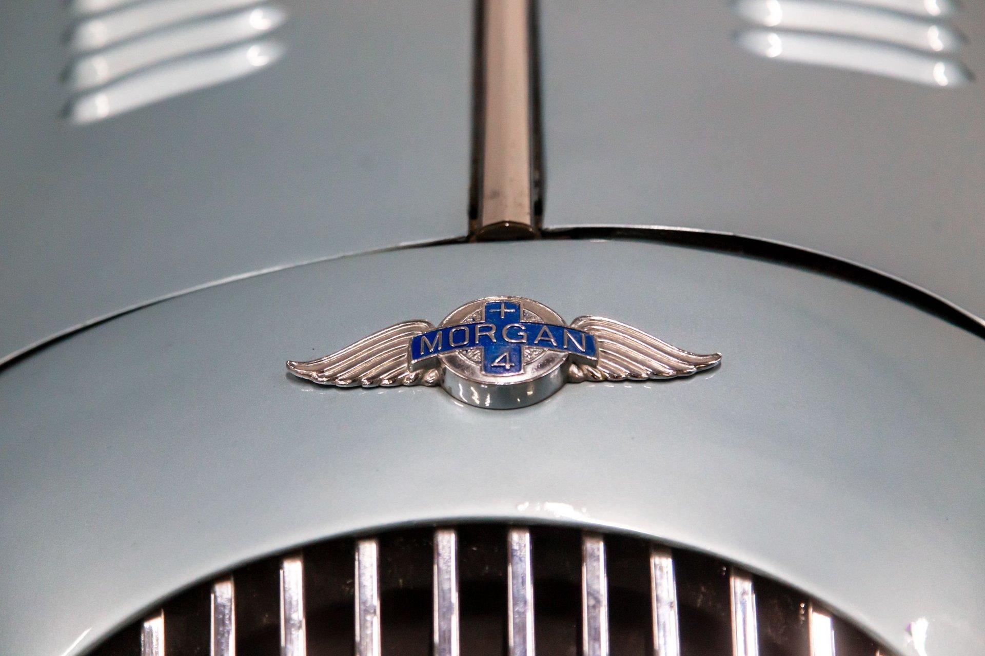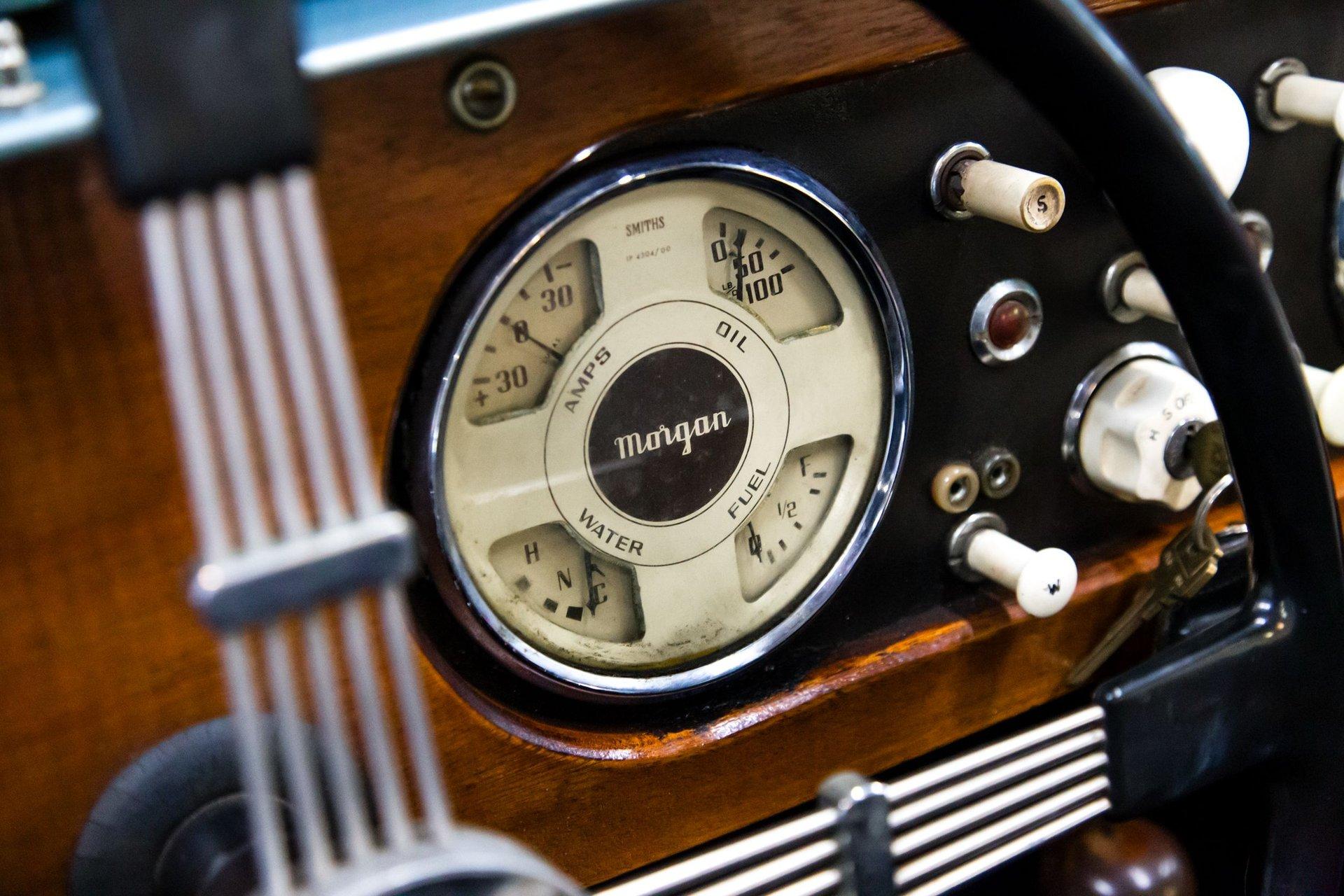 Powered by a replacement 1,991cc inline-four paired with a four-speed manual transmission, the car is finished in two-tone blue over black leather. Equipment includes a black soft top, a tonneau cover, 16″ steel wheels, hubcaps, dual spare wheels and tires, dual SU carburetors, louvered hood panels, a wood dashboard, a Bluemels Brooklands steering wheel, and seatbelts. The car comes with the Morgan Motor Company Chassis Record and a tool kit.