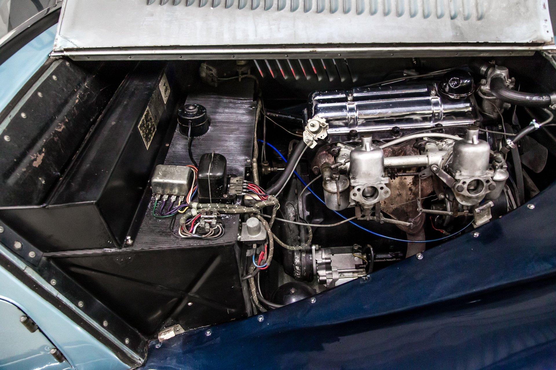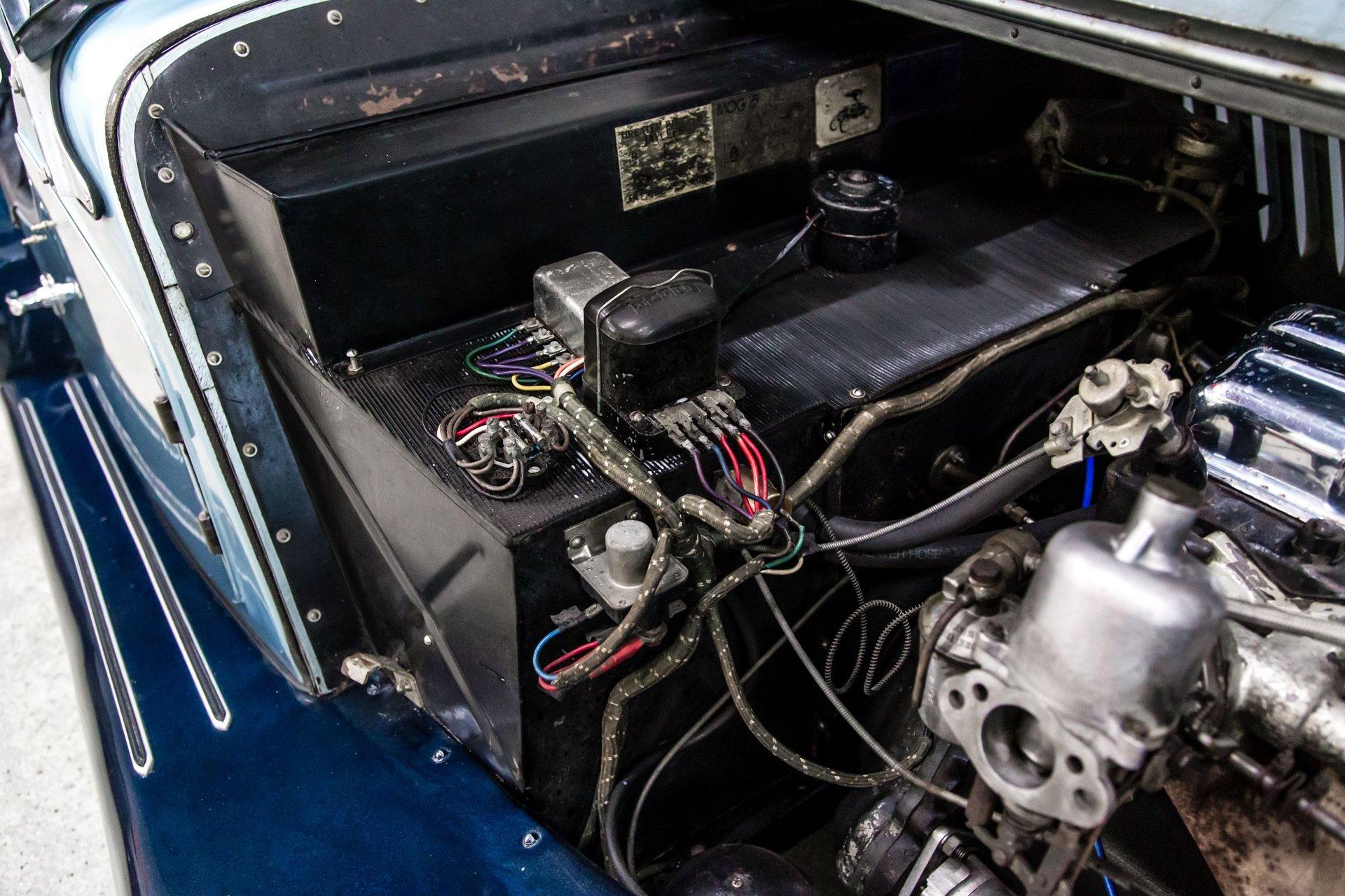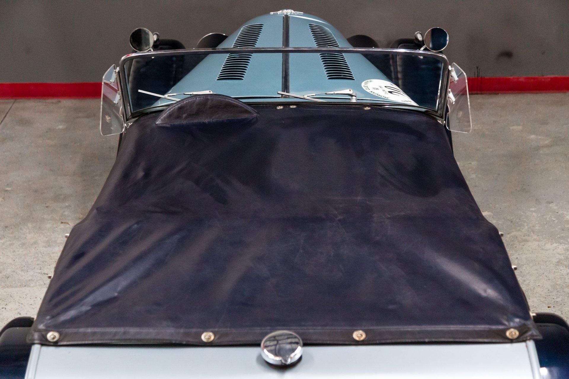 Finished from the factory in a non-standard shade of cream, the car was repainted in two-tone metallic blue prior to 2004. Features include a black soft top, a black tonneau cover, a badge bar, a single Lucas driving light, louvered hood panels, fender-mounted side mirrors, wind wings, running boards, a flip-up fuel cap, and chrome bumpers.