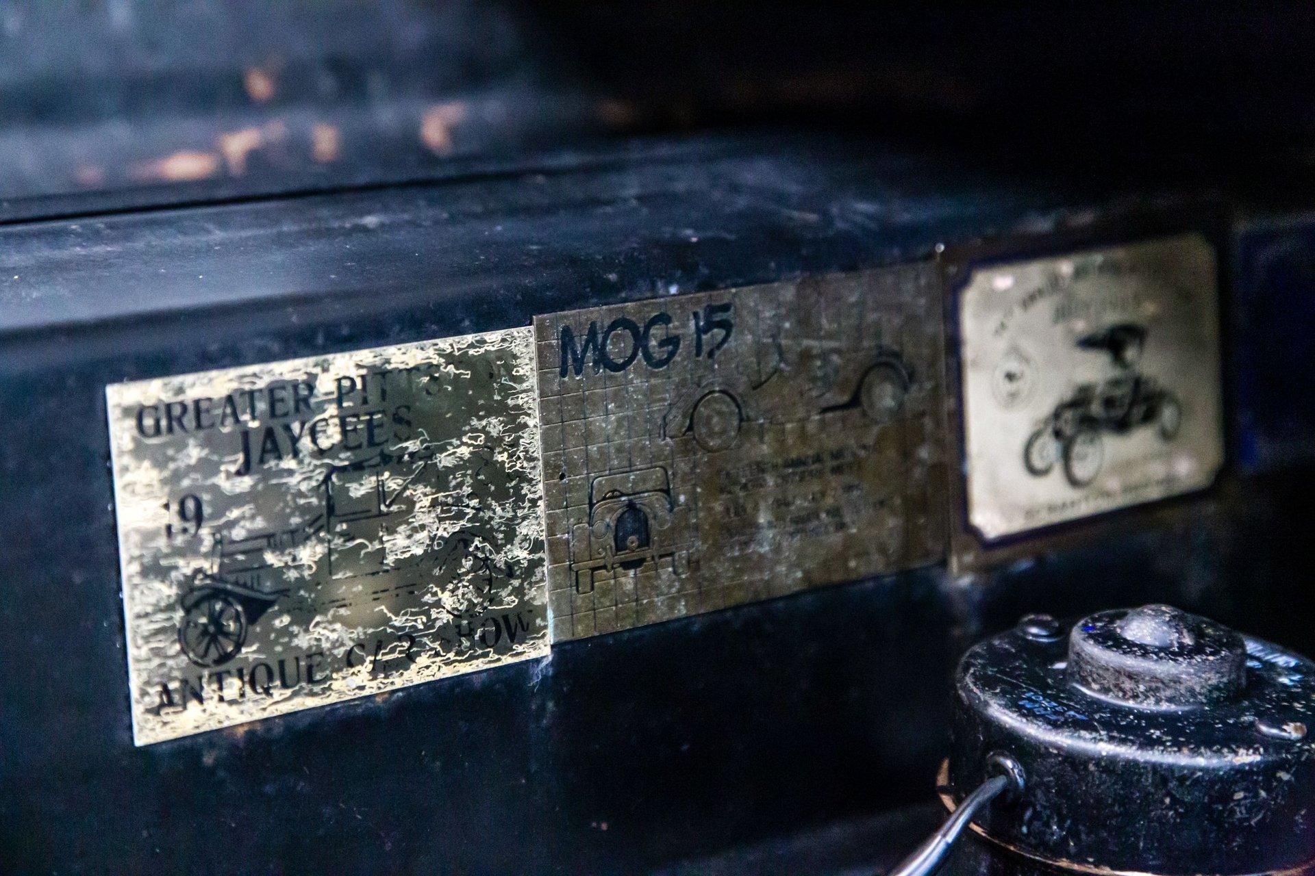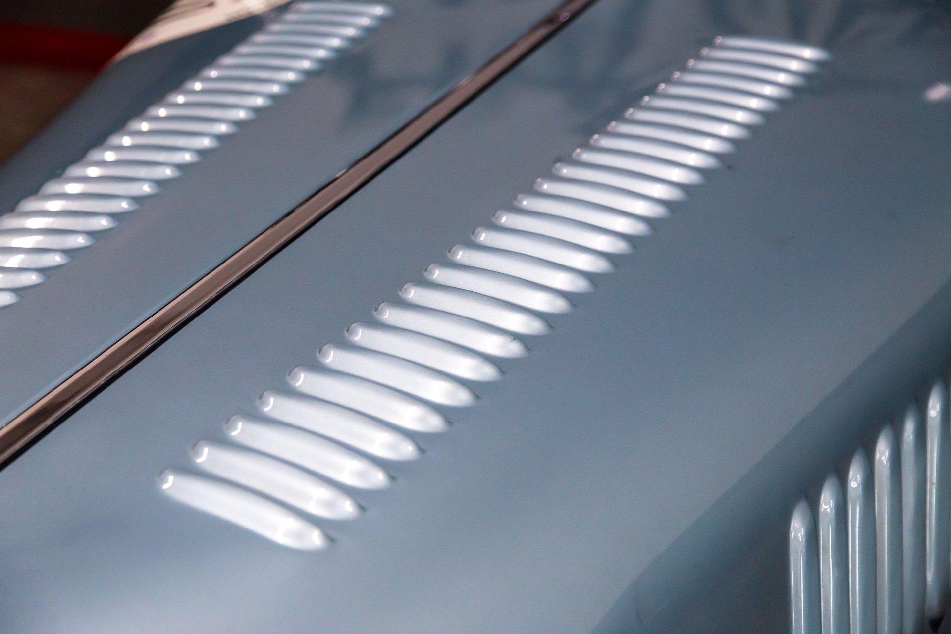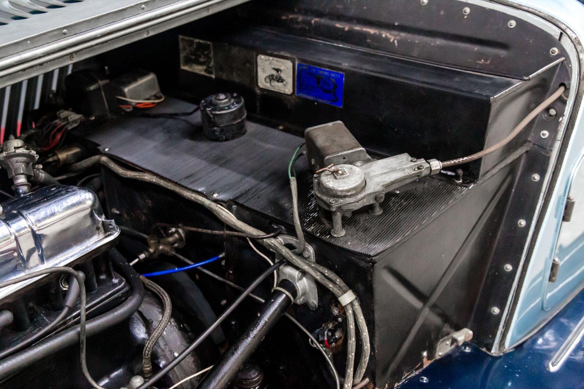 Finished from the factory in a non-standard shade of cream, the car was repainted in two-tone metallic blue prior to 2004. Features include a black soft top, a black tonneau cover, a badge bar, a single Lucas driving light, louvered hood panels, fender-mounted side mirrors, wind wings, running boards, a flip-up fuel cap, and chrome bumpers.