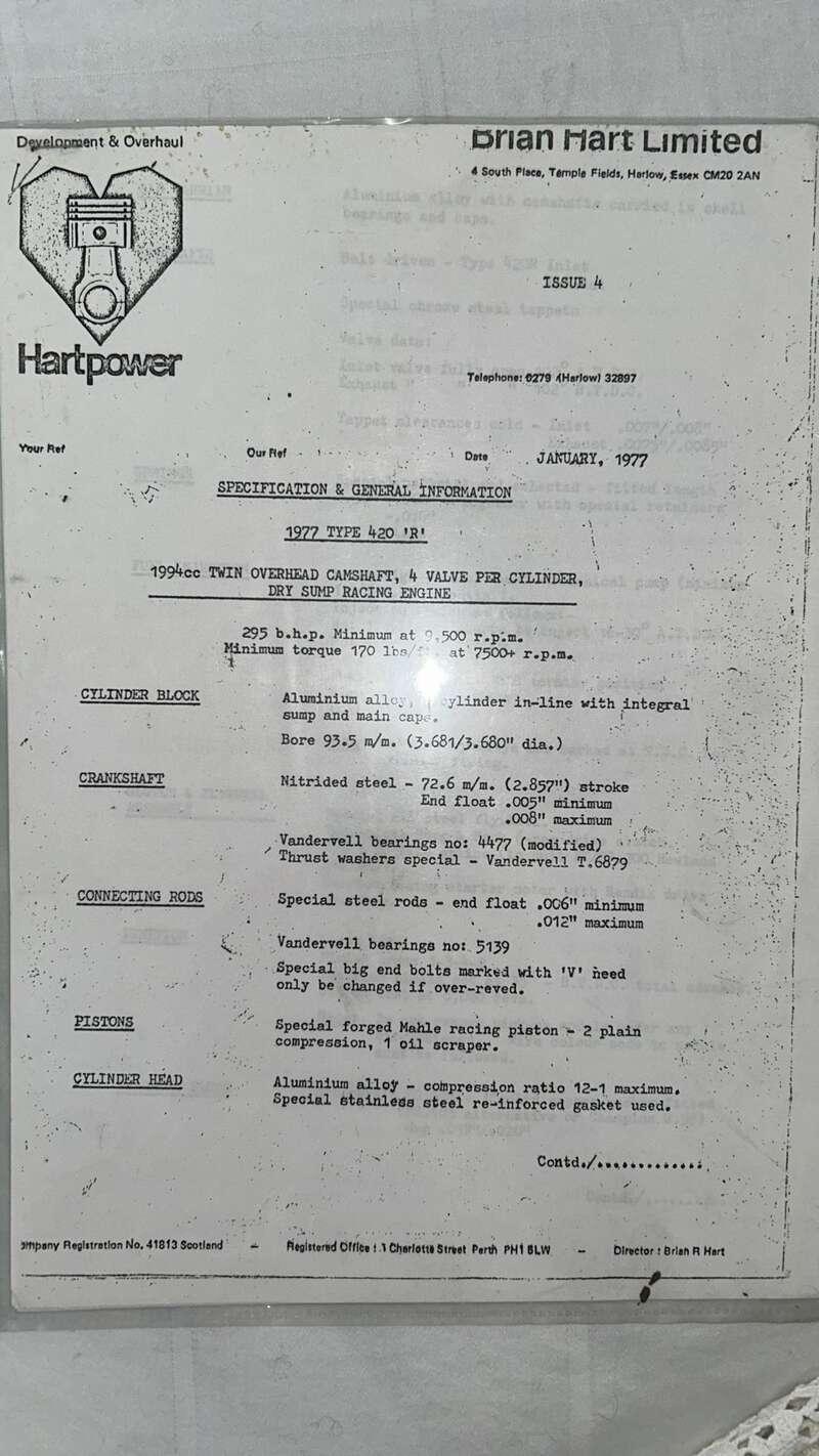 In more recent times, the car has been with diligent privateer owners, amongst them, Chris Lillington-Price and our vendor, who have maintained and campaigned B40-77-05 properly. It is currently race-ready, with a MSA/FIA Historic Technical Passport valid until 31st December 2028, having benefitted from a full rebuild by Retro Track & Air (UK) Ltd of Gloucestershire in 2018, with only limited use since, and its Hart 420 engine has covered only 350 miles since a full rebuild (costing £15,815, invoice in history file) by expert Geoff Richardson of GR Engineering in Cambridgeshire. The car is accompanied by a spare wheel set, a spare splitter and silencer.