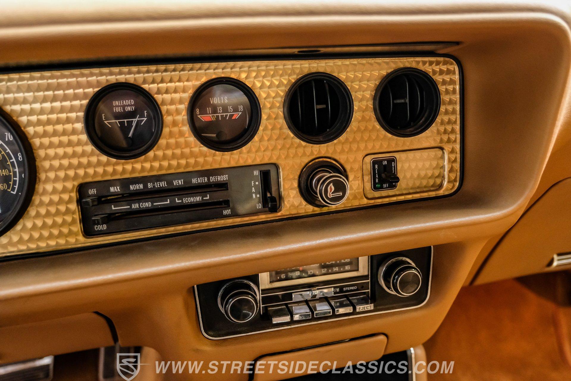 The interior features a correct Camel-colored optional deluxe velour interior, with a set of plush bucket seats separated by a combination storage console/armrest. A three-gold spoke steering wheel, featuring the Firebird logo on its center cap, sits in front of a shimmering gold engine-turned dashboard, highlighted by a large tachometer and complemented by a matching speedometer, with a trio of ancillary gauges located nearby. Other interior options include power windows, rear defogger, interior lamp group, and a factory AM/FM/8-track stereo, adding entertainment beyond the big motor under the hood.