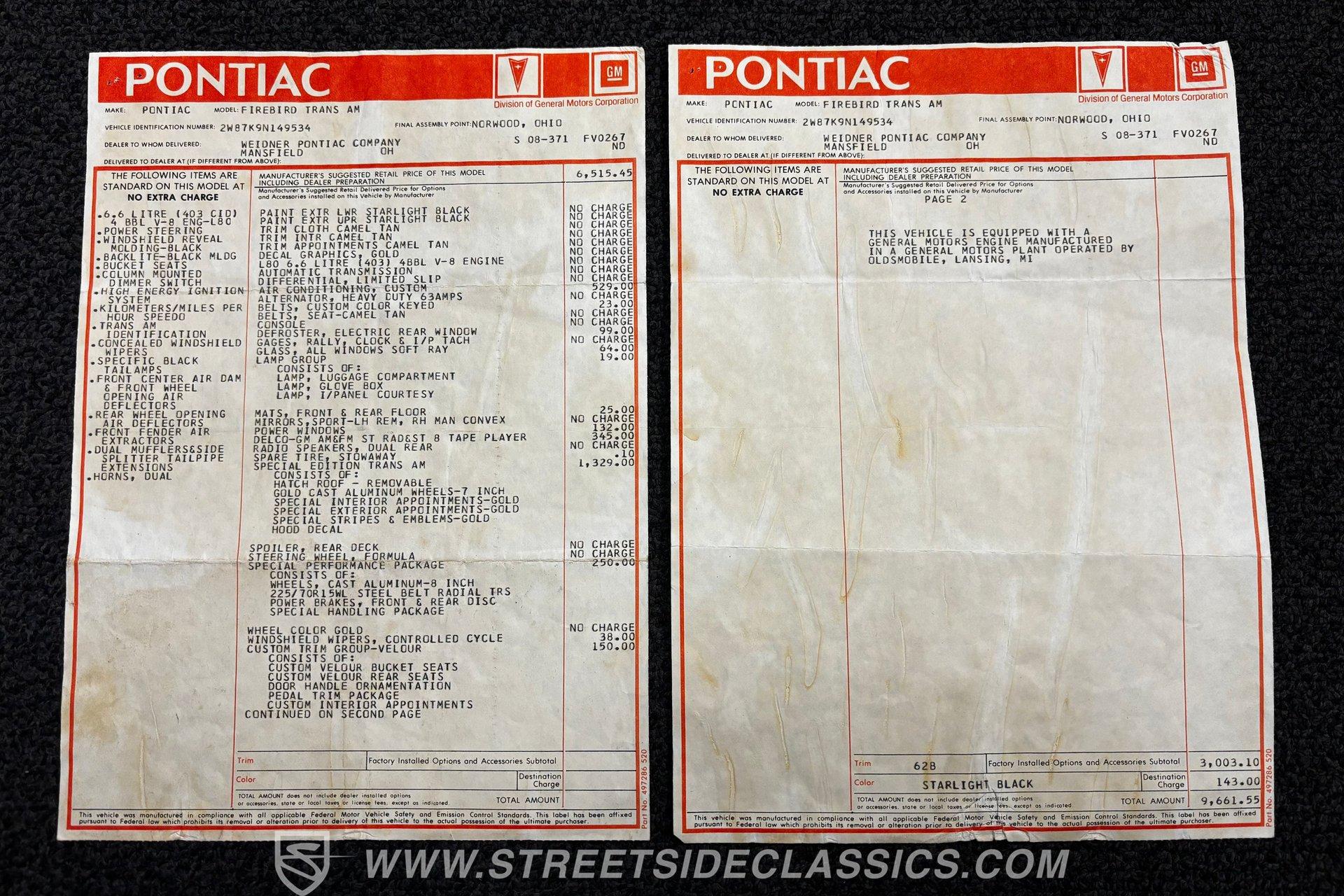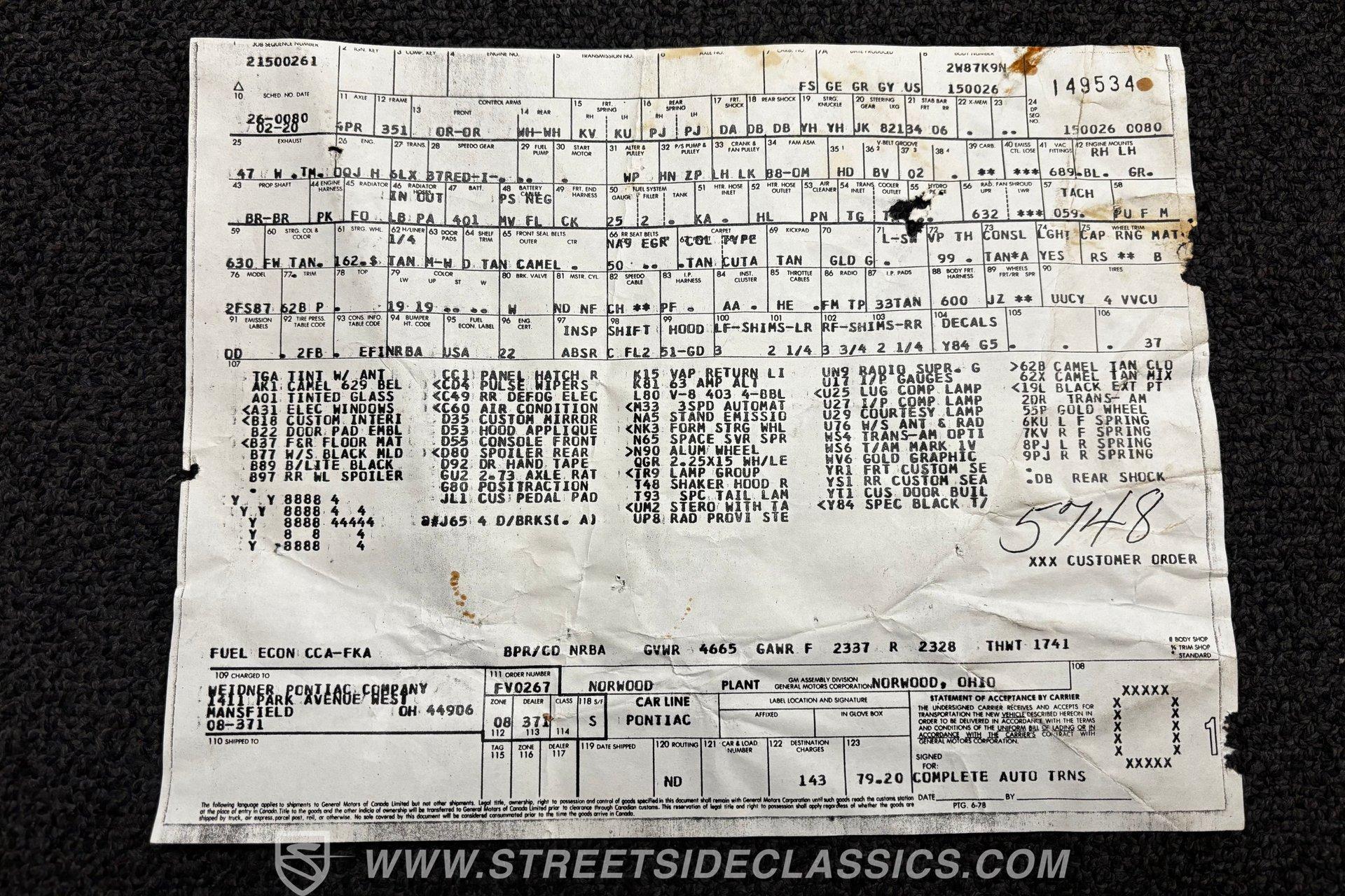 Included with the car is the original window sticker, build sheet and owner's manual, as well as a car cover and T-top bags. If you have been searching for a truly sought-after classic muscle car, this exciting, documented 1979 Pontiac Trans Am SE WS6 is worthy of consideration. Call today!