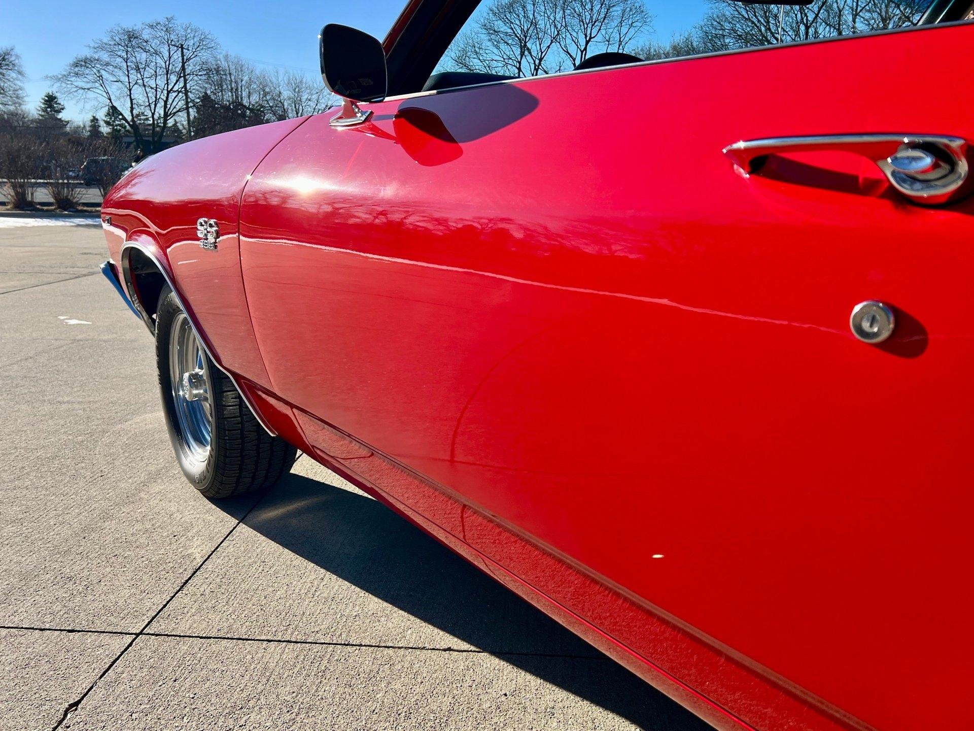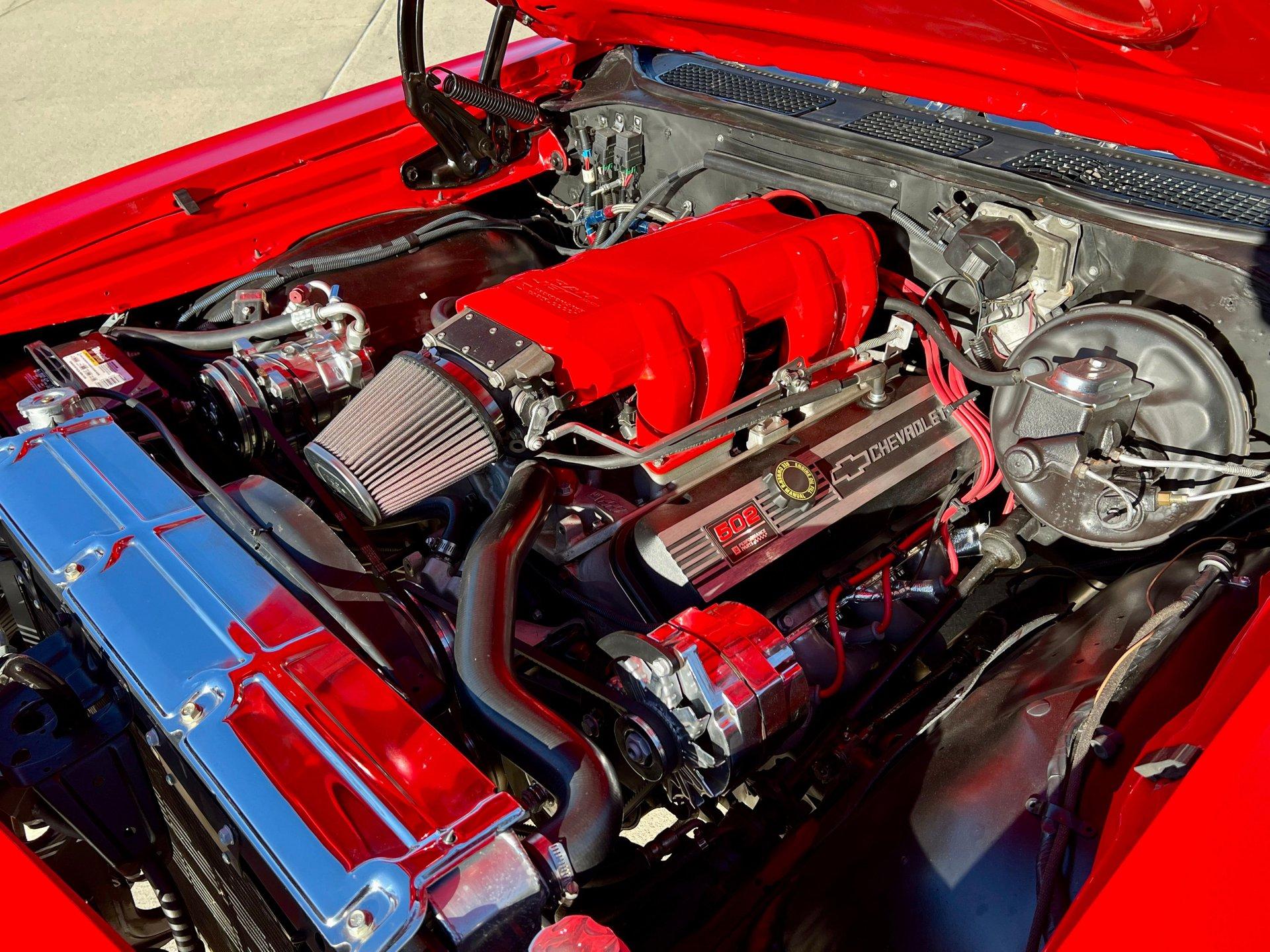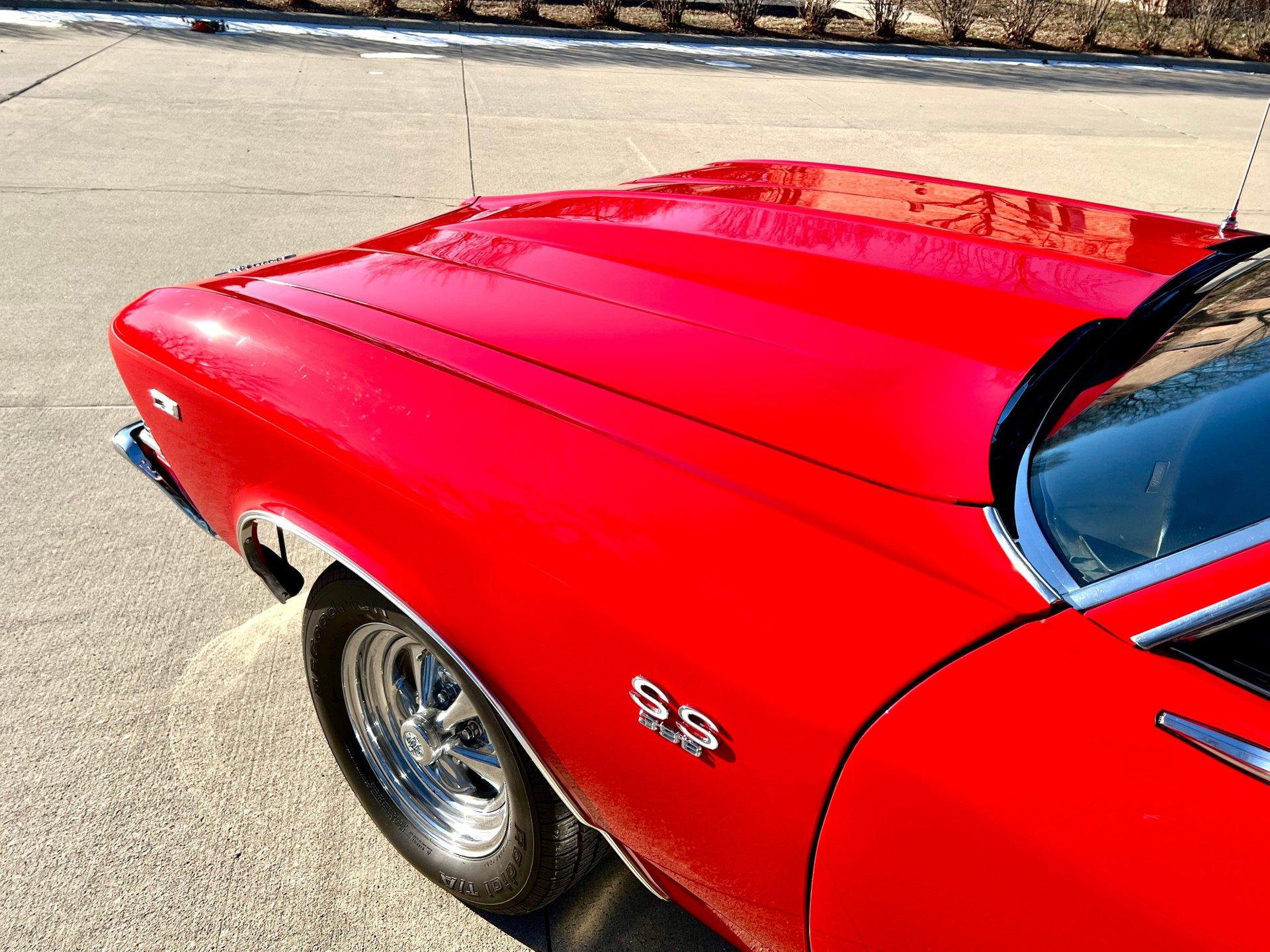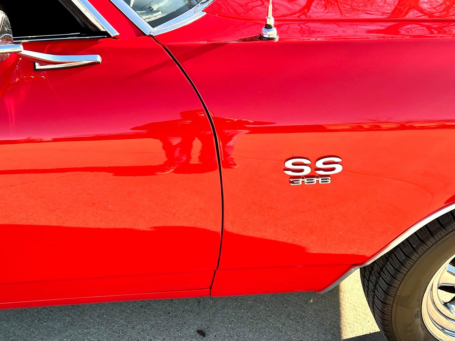 Originally Garnet red now Torch red. Great looking classic Chevelle with all the SS upgrades and fuel injected 502CI V8. Air conditioning blows cold for cruising all Summer. Clean and solid undercarriage. Trunk finished with spare/jack. Engine bay all detailed and ready to go.
