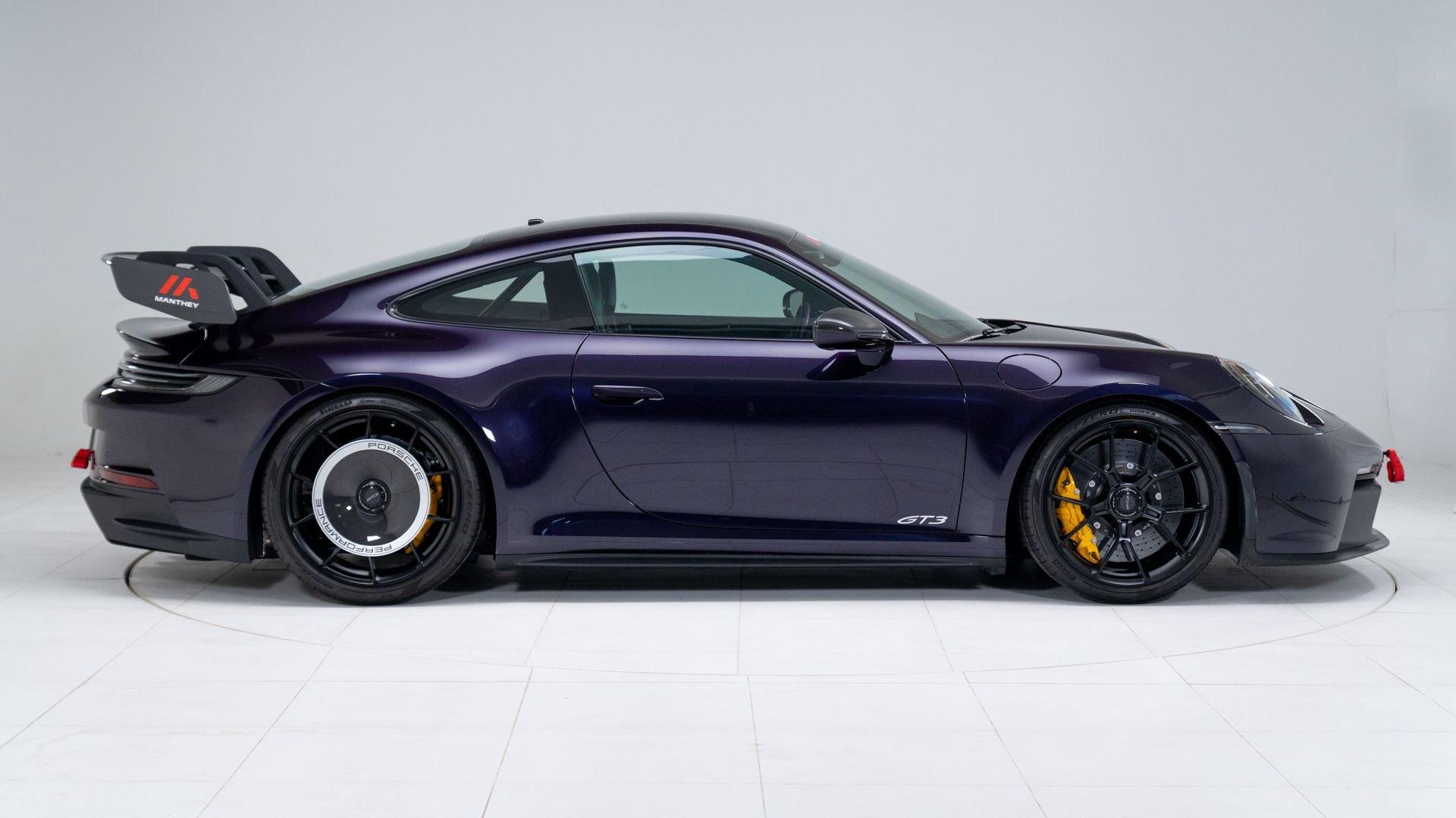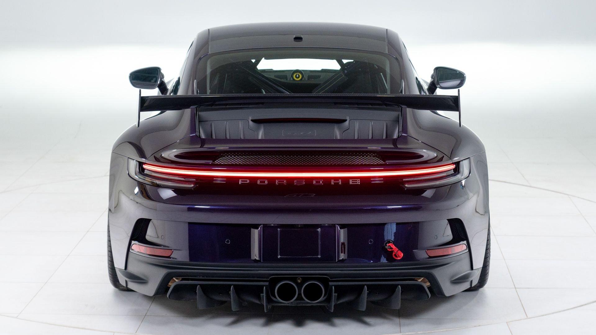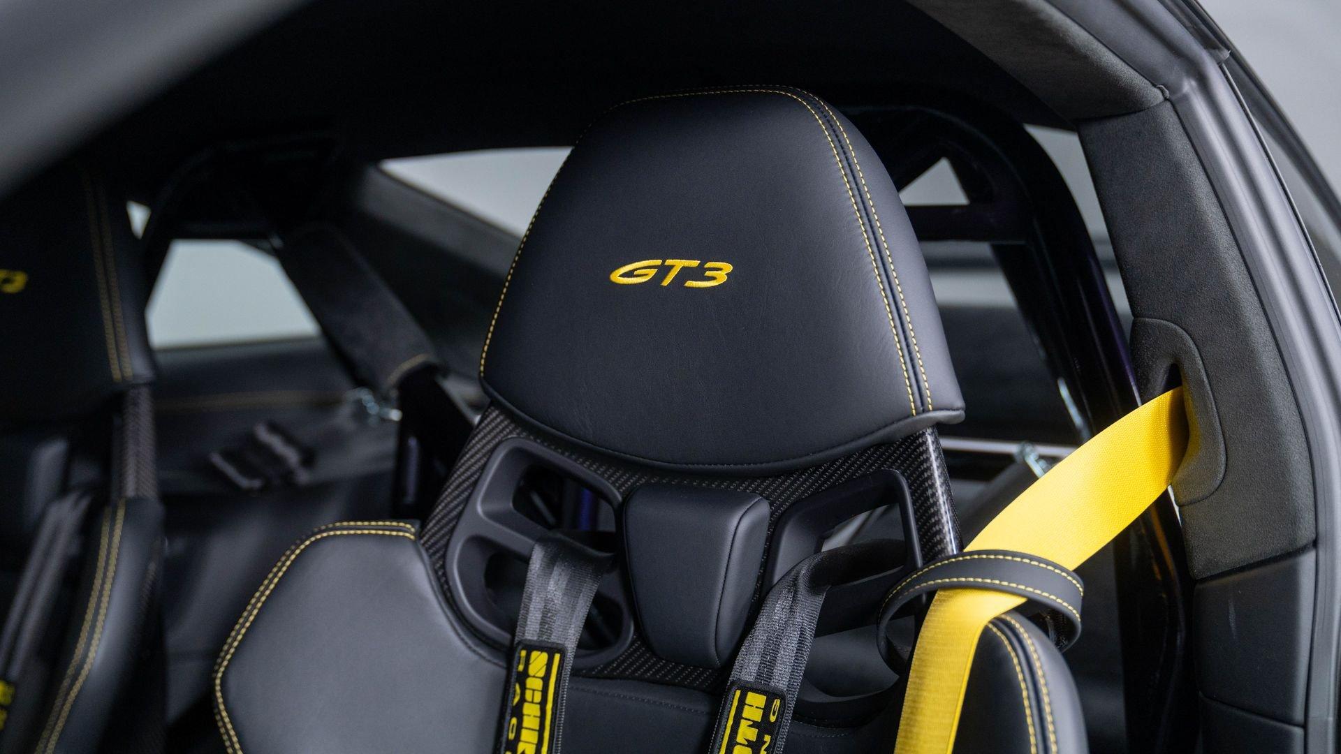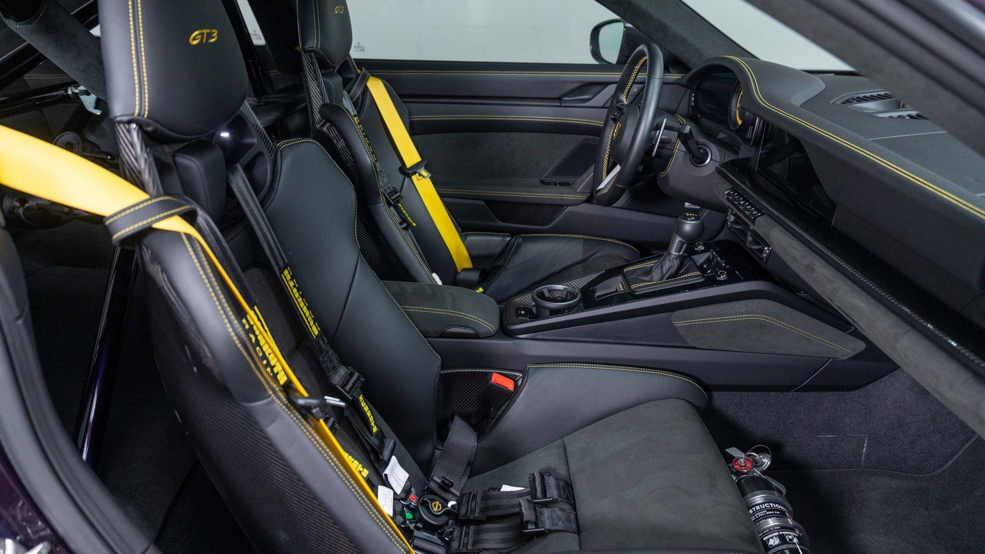 Completed on 9 December 2021, chassis number 69359 was specified in Paint to Sample Viola Metallic with a matching roof, paired with a Black Leather/Race-Tex interior stitched in GT Silver. The exterior color scheme was complemented by contrasting Deviated Stitching Interior Package and a suite of deviated-stitching Z-options, while Racing Yellow seat belts, central tachometer, and Sport Chrono stopwatch dial added further color accents. The GT3's exterior was sharpened by satin Black wheels, carbon-fiber mirror upper trims, and Exclusive Design taillights, with high-gloss carbon-fiber trim inlays and door-sill guards continuing the theme inside.
