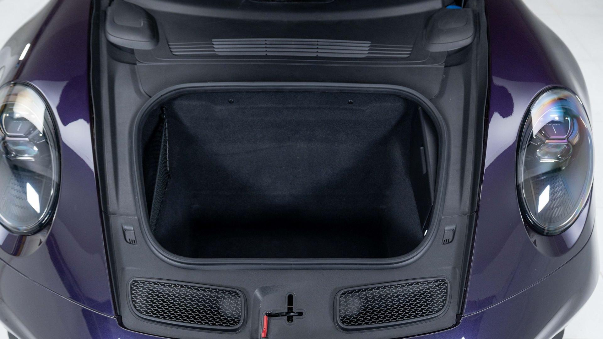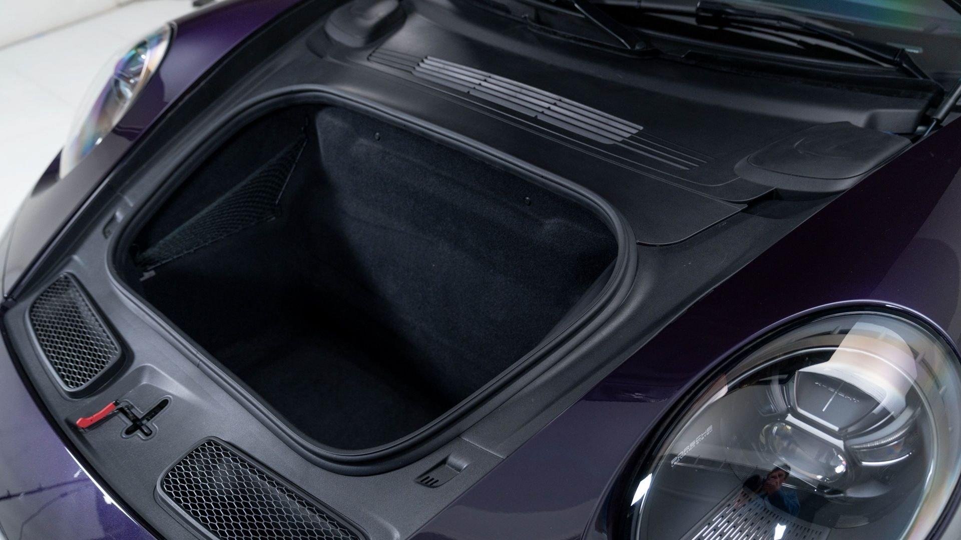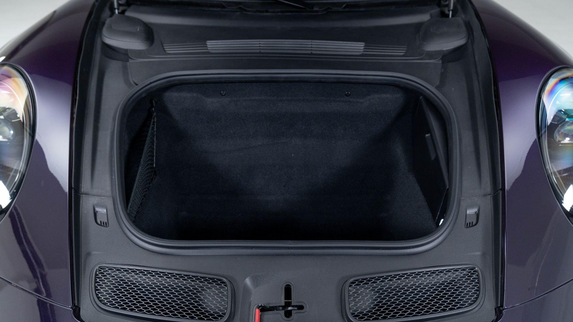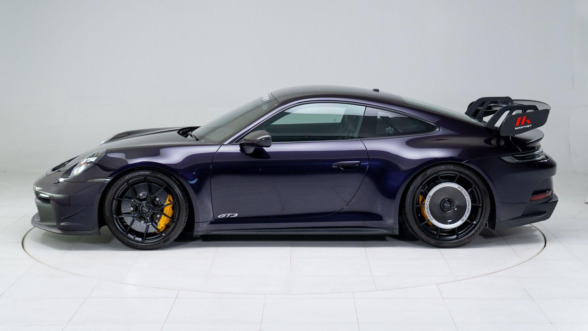 Completed on 9 December 2021, chassis number 69359 was specified in Paint to Sample Viola Metallic with a matching roof, paired with a Black Leather/Race-Tex interior stitched in GT Silver. The exterior color scheme was complemented by contrasting Deviated Stitching Interior Package and a suite of deviated-stitching Z-options, while Racing Yellow seat belts, central tachometer, and Sport Chrono stopwatch dial added further color accents. The GT3's exterior was sharpened by satin Black wheels, carbon-fiber mirror upper trims, and Exclusive Design taillights, with high-gloss carbon-fiber trim inlays and door-sill guards continuing the theme inside.