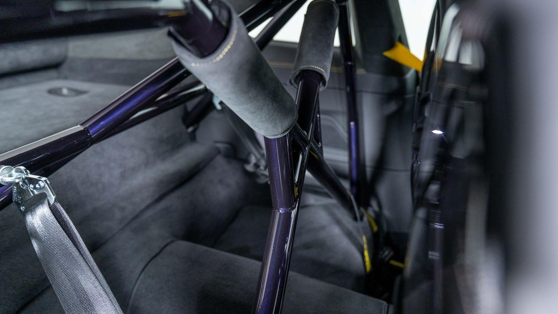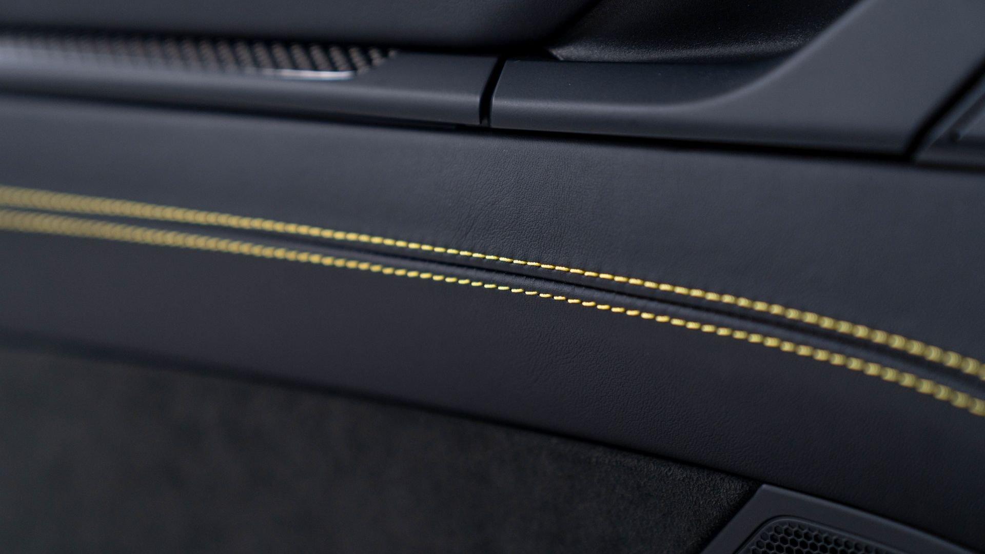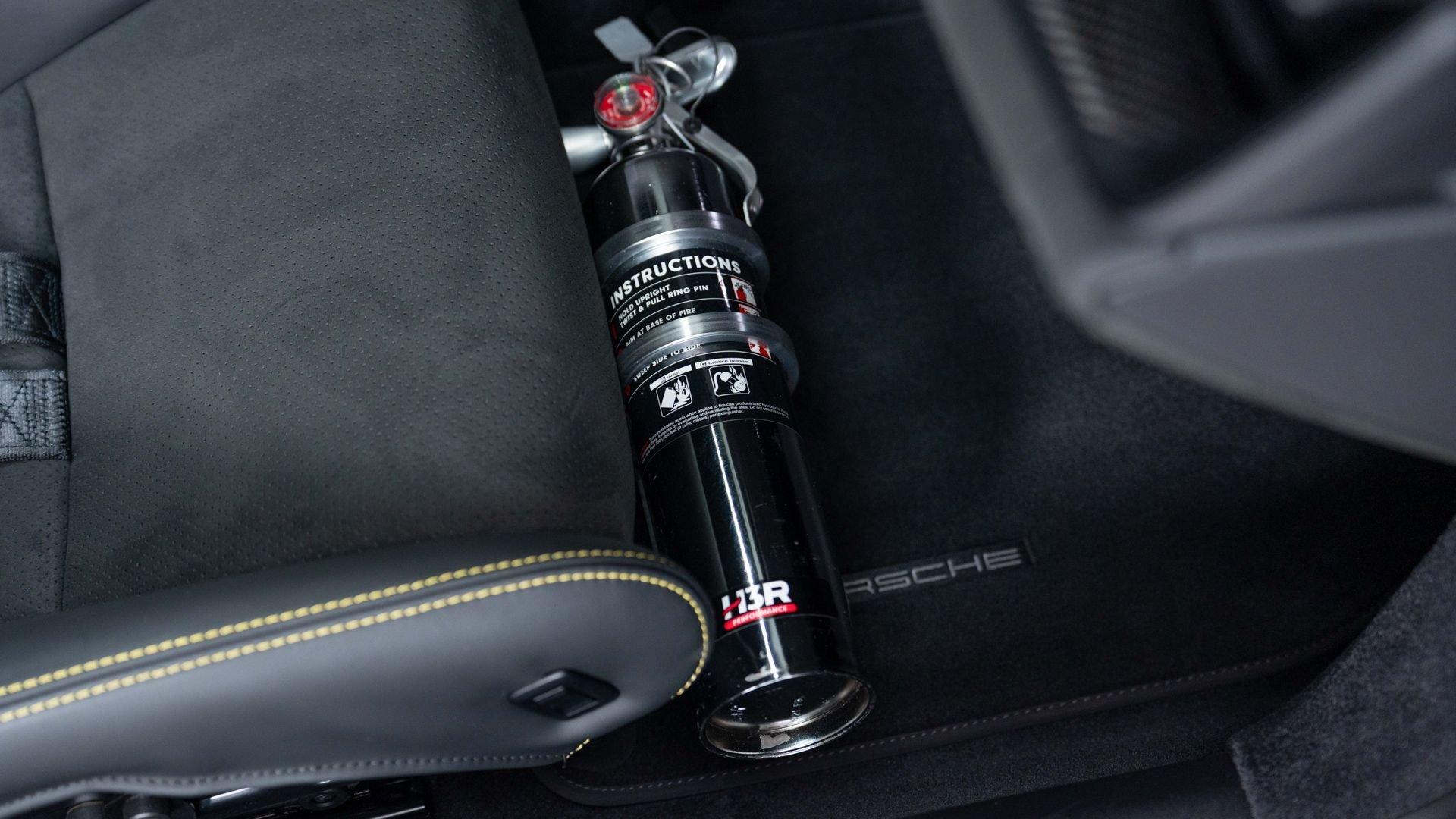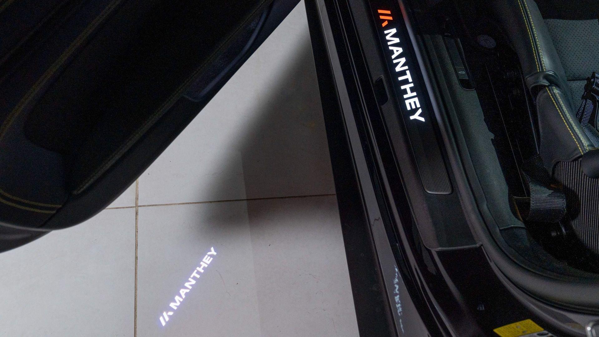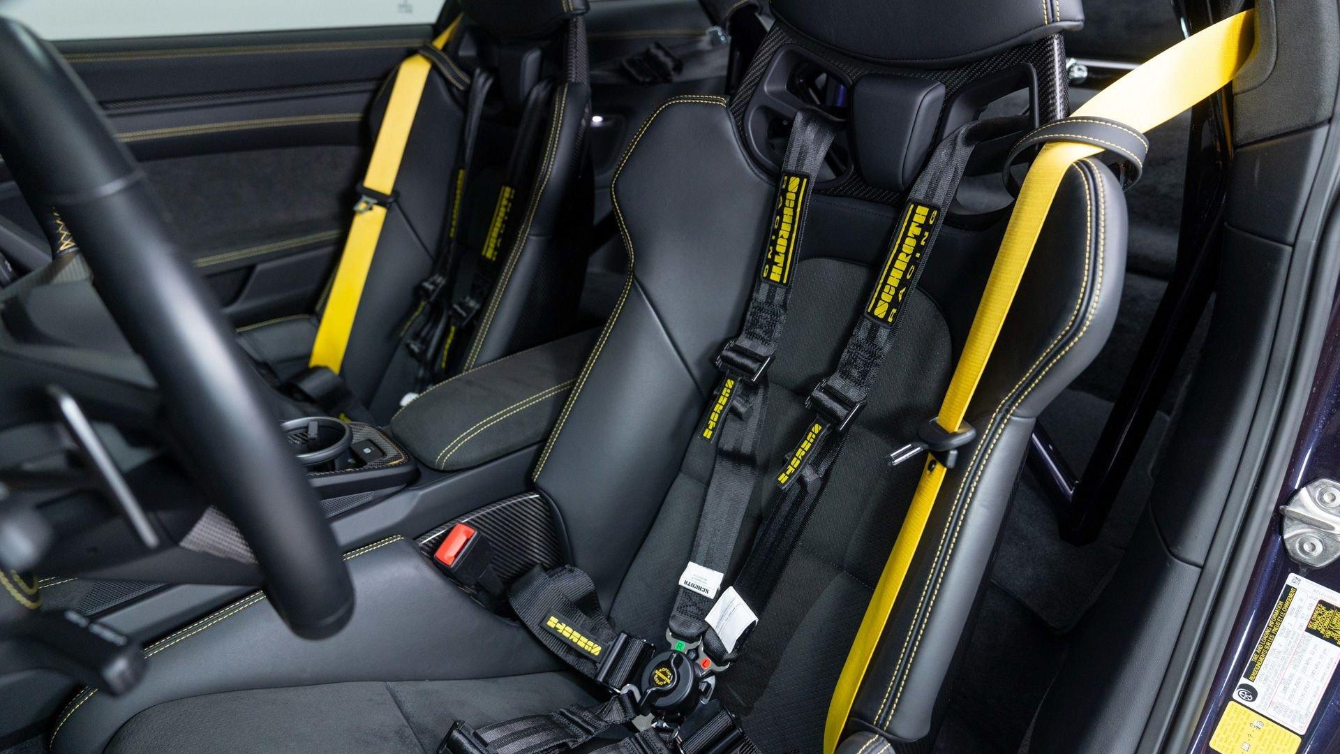 Equipped on this example, the kit encompasses a new four-way adjustable suspension, Manthey OM-1 lightweight wheels with detachable aerodiscs, and a brake upgrade featuring braided brake lines and upgraded brake pads, complemented by an aerodynamic package comprising a revised front splitter/lip, front flics, a new rear diffuser, and a carbon-fiber rear wing with Manthey side plates. Safety enhancements include a Manthey paint-matched roll bar with Schroth five-point harnesses and a Manthey fire extinguisher. Notably, the Manthey upgrades do not compromise the factory warranty, which remains valid on this example until 15 February 2028.