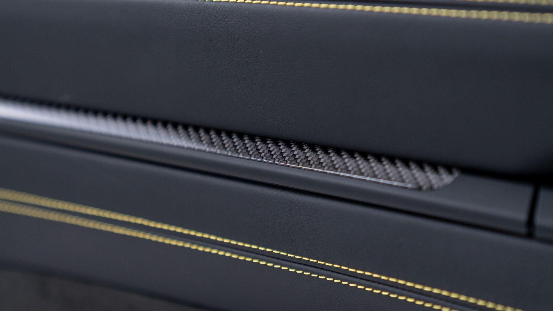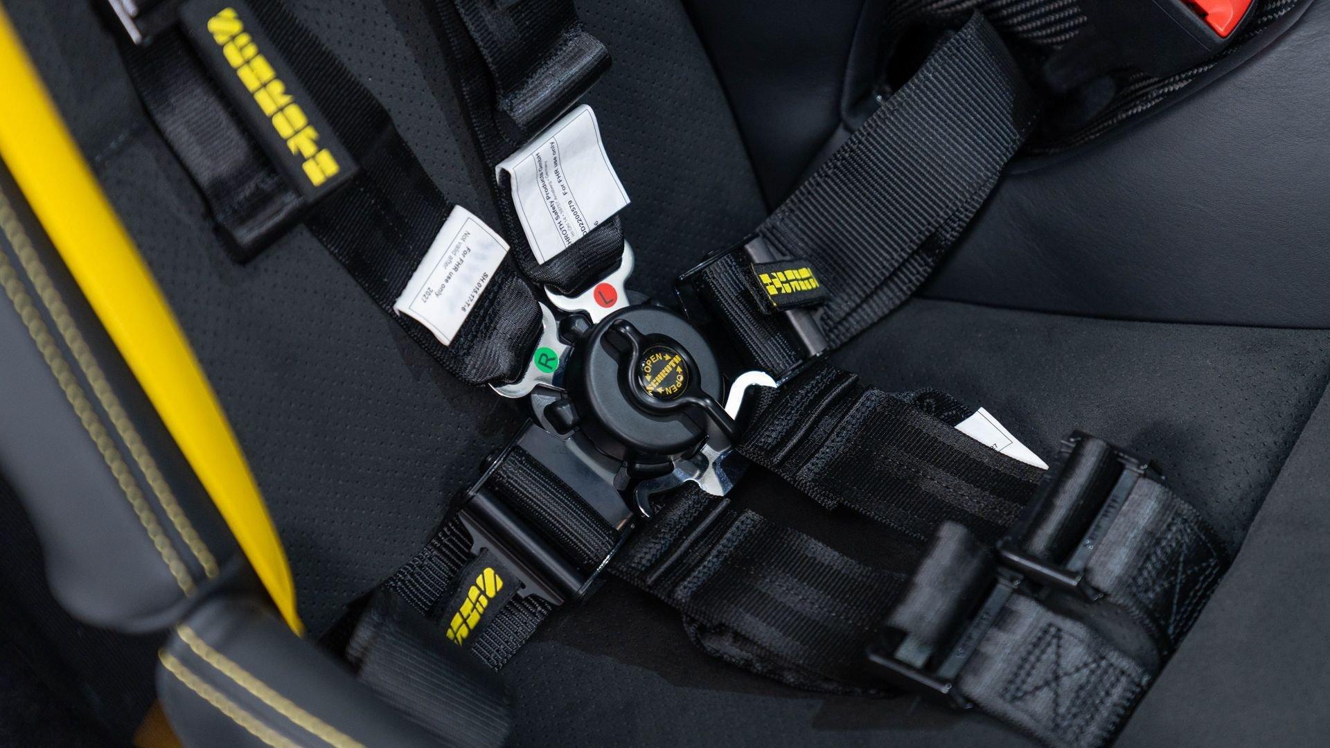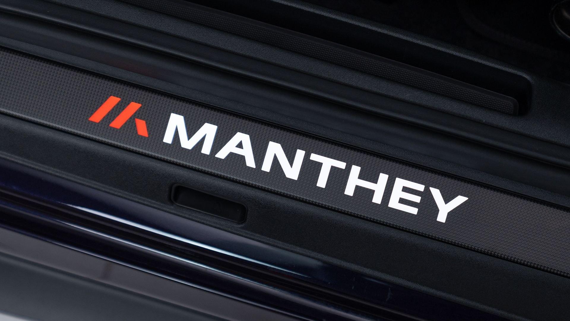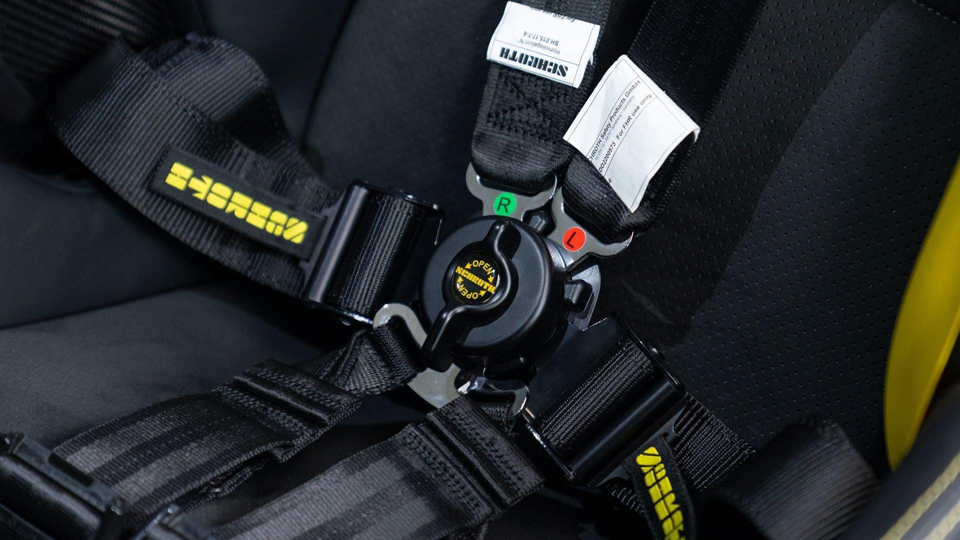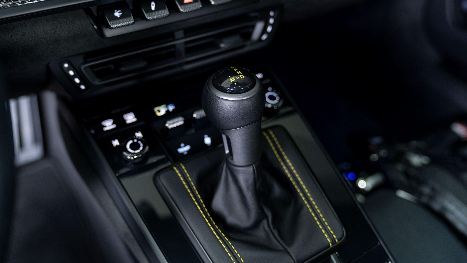 Equipped on this example, the kit encompasses a new four-way adjustable suspension, Manthey OM-1 lightweight wheels with detachable aerodiscs, and a brake upgrade featuring braided brake lines and upgraded brake pads, complemented by an aerodynamic package comprising a revised front splitter/lip, front flics, a new rear diffuser, and a carbon-fiber rear wing with Manthey side plates. Safety enhancements include a Manthey paint-matched roll bar with Schroth five-point harnesses and a Manthey fire extinguisher. Notably, the Manthey upgrades do not compromise the factory warranty, which remains valid on this example until 15 February 2028.