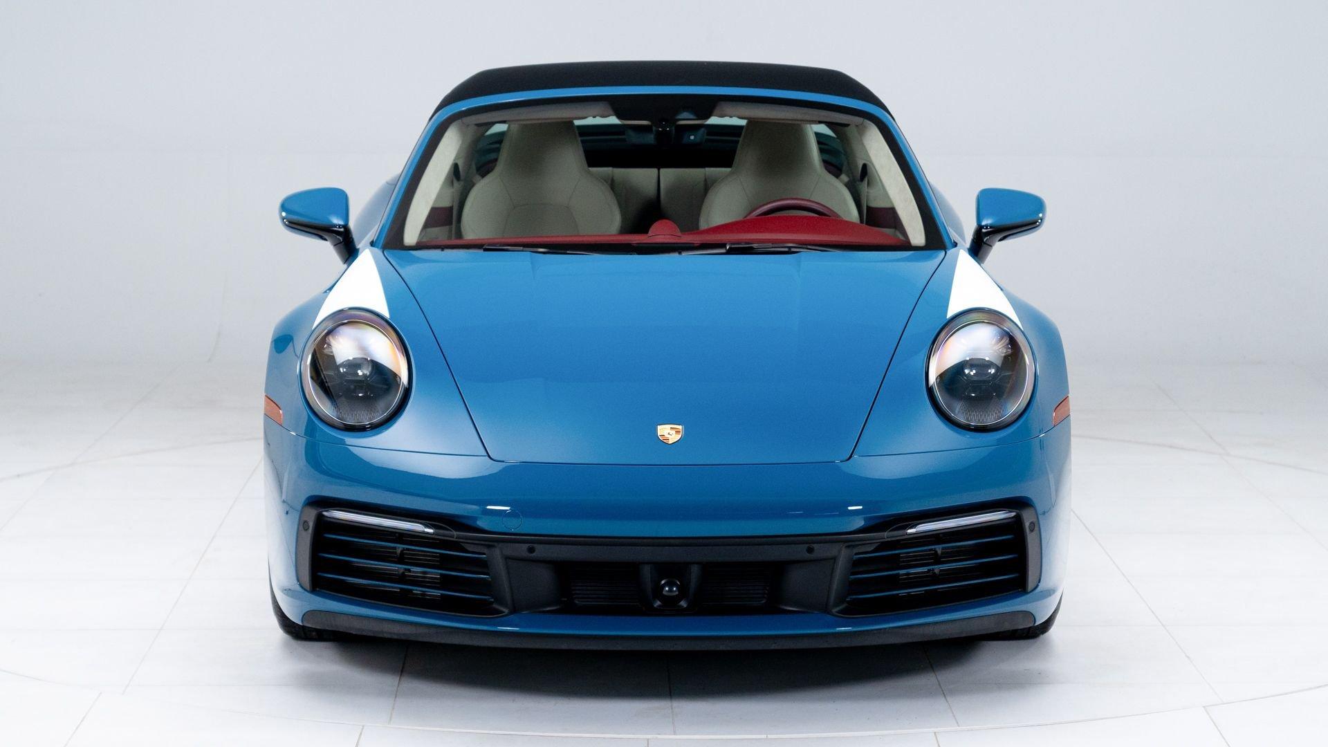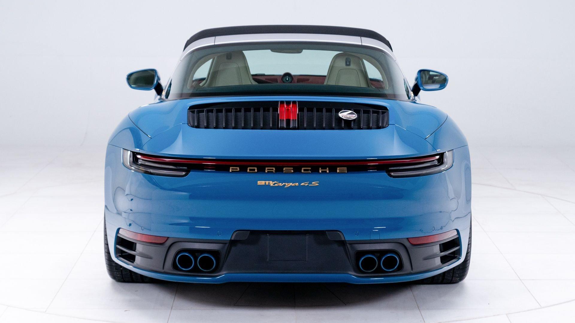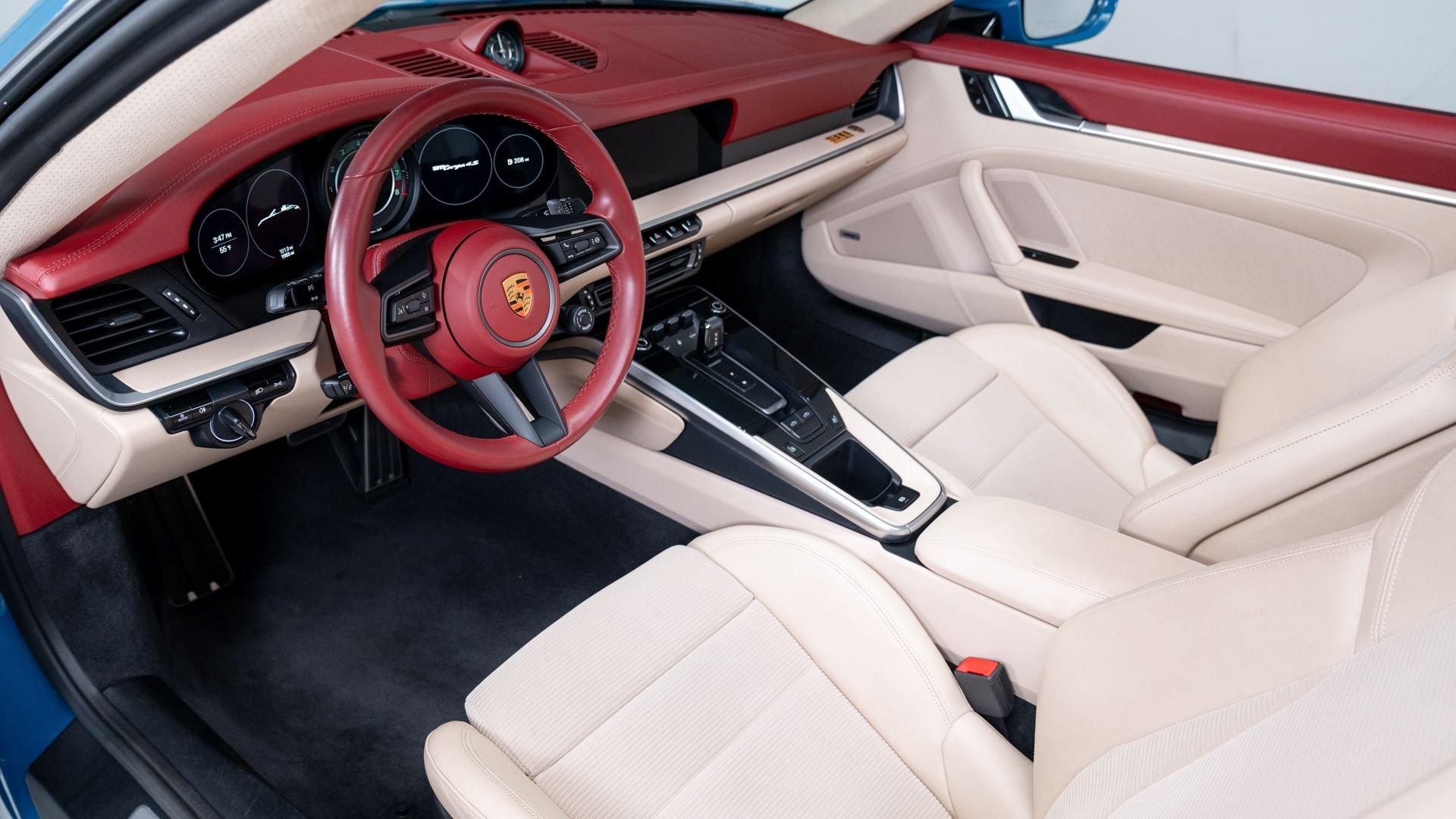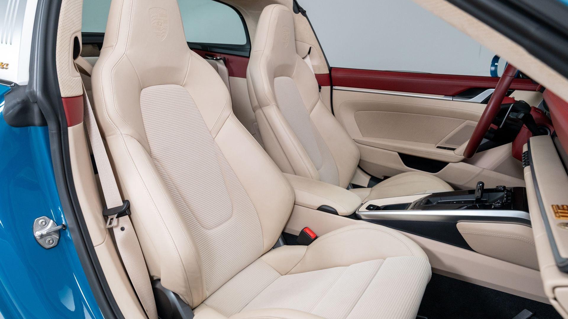 This particular 911 Targa 4S Heritage Design Edition, limitation number 625, is likely among the more custom examples of Heritage Editions to emerge from the Porsche Exclusive Manufaktur workshops. The original owner was not only fortunate enough to secure a Heritage Design allocation but a coveted Paint to Sample (PTS) slot with Porsche noting that the PTS program special requests are integral to satisfying the individual demands that are the core of Porsche. It is finished in the rarely seen historical PTS color of Oslo Blue that harkens back to the 356 B-era of 1962 and 1963. The shade suits the historical nature of the model with aplomb. Porsche describes the interior, here selected in two-tone Bordeaux Red/Atacama Beige OLEA club leather as “Expressive and harmonious and above all timeless.” Furthermore, corduroy fabric makes a return to the interior of the 911, used on the door panels and the seat centers.