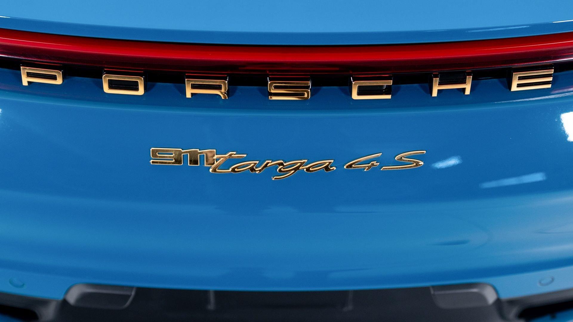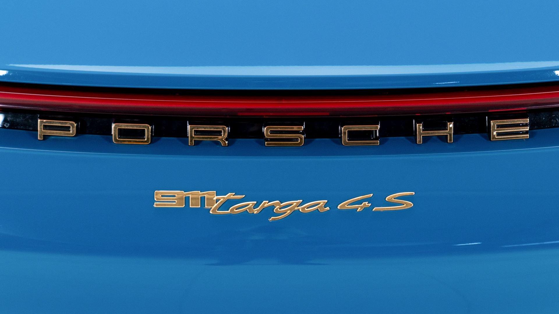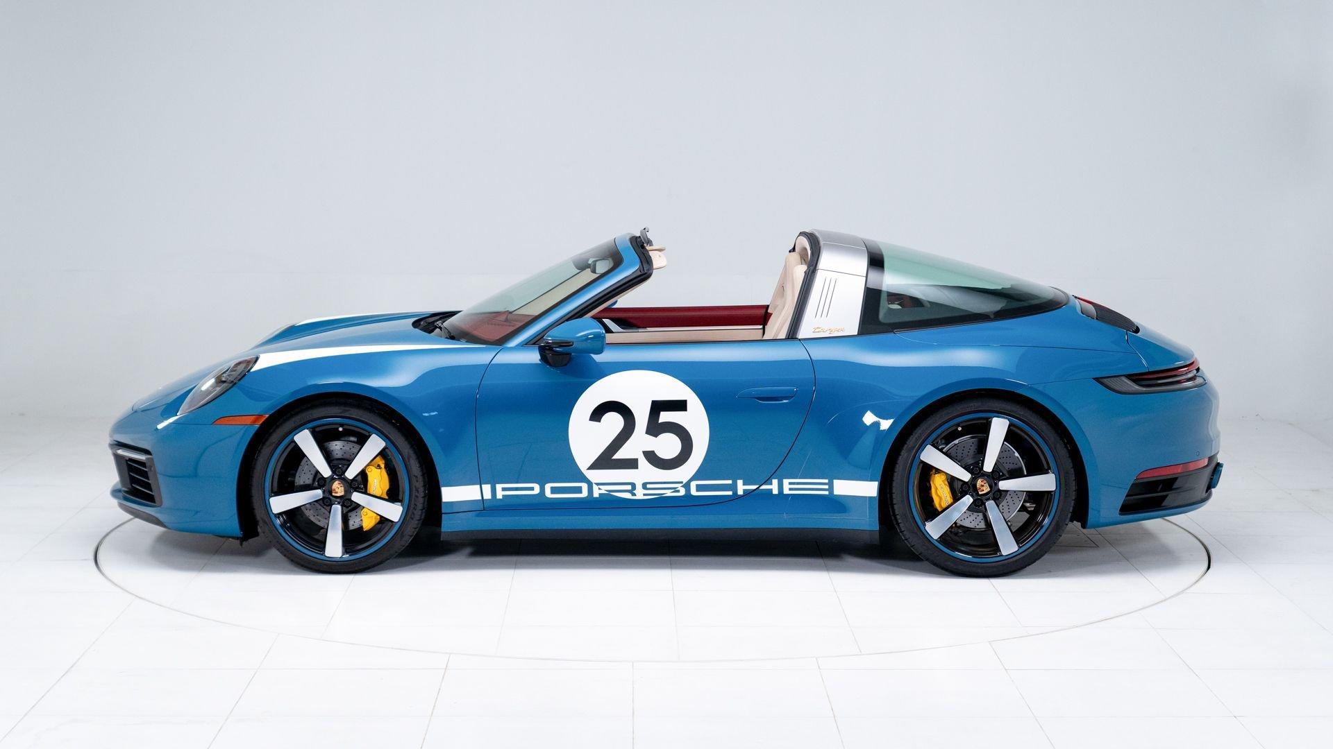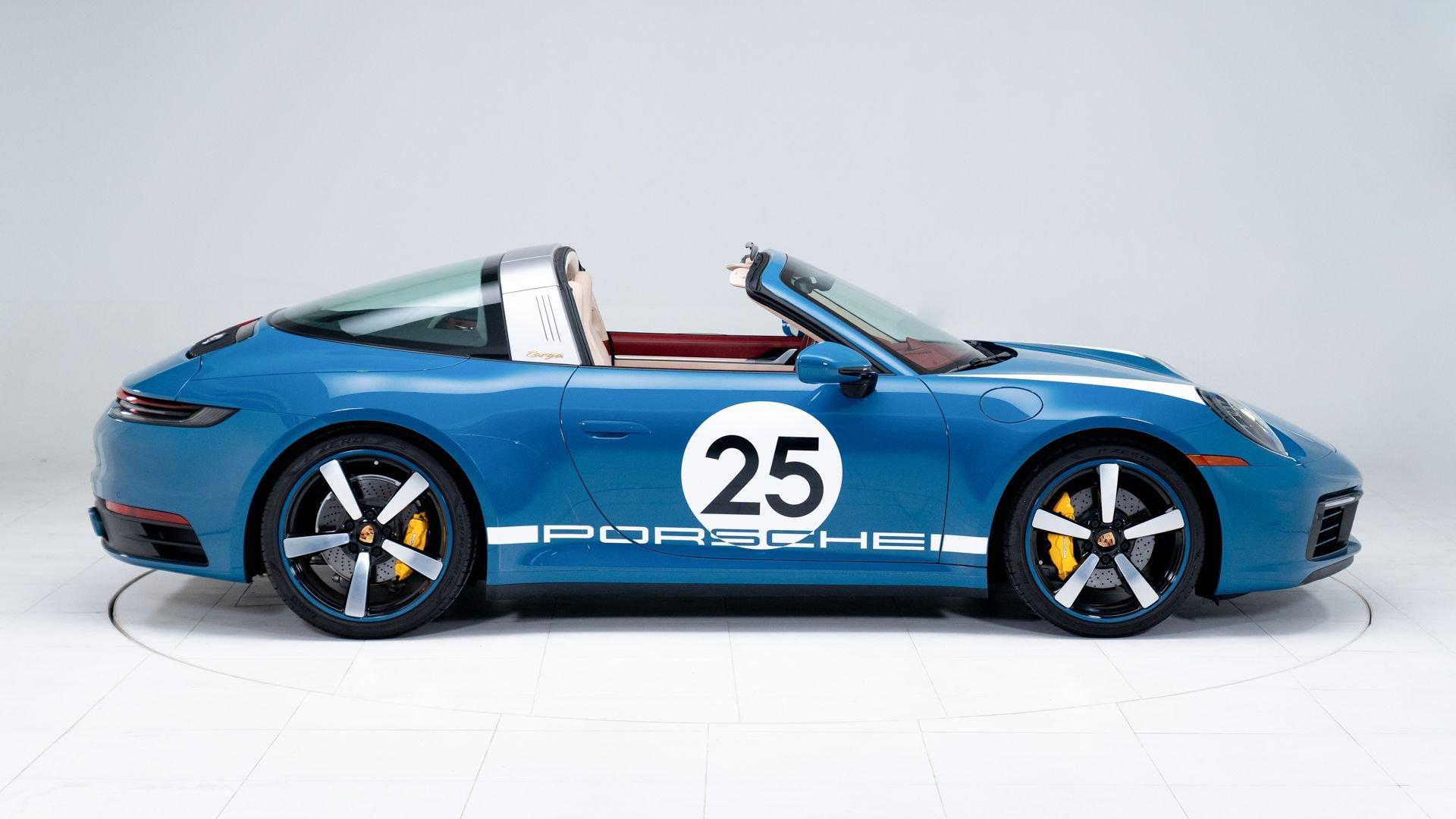 This particular 911 Targa 4S Heritage Design Edition, limitation number 625, is likely among the more custom examples of Heritage Editions to emerge from the Porsche Exclusive Manufaktur workshops. The original owner was not only fortunate enough to secure a Heritage Design allocation but a coveted Paint to Sample (PTS) slot with Porsche noting that the PTS program special requests are integral to satisfying the individual demands that are the core of Porsche. It is finished in the rarely seen historical PTS color of Oslo Blue that harkens back to the 356 B-era of 1962 and 1963. The shade suits the historical nature of the model with aplomb. Porsche describes the interior, here selected in two-tone Bordeaux Red/Atacama Beige OLEA club leather as “Expressive and harmonious and above all timeless.” Furthermore, corduroy fabric makes a return to the interior of the 911, used on the door panels and the seat centers.