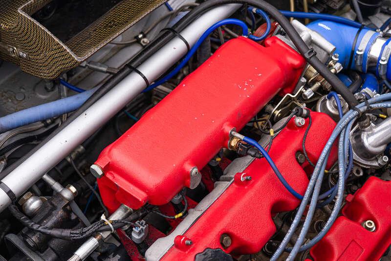 Engine: Twin-Cam (Lambredi), Type 831C5.000, straight 4-cylinder, CPS forged pistons. CR 7.6:1; Fully ported and gas-flowed head, Nimonic inlet and exhaust valves; two valves/cylinder - eight valves total. 43.7mm inlet valve diameter, 36.4mm exhaust valve diameter. 32.5° angle between inlet valve axis and vertical, 32.5° angle between exhaust valve axis and vertical; Garrett Turbo Gr. A, roller bearings on intake and exhaust. 500 bhp+ capable; Group A uprated aluminium intercooler; Twin Bosch 44 uprated fuel pump 235l/h; ATL foam-filled 55-litre fuel tank on an aluminium case. FIA approved 73mm inox exhaust.