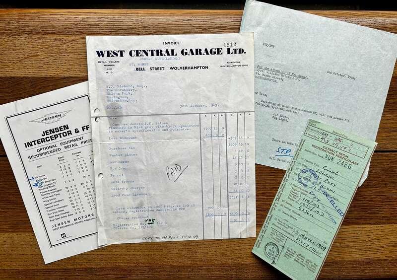 It was ordered new by Mr S.T. Pickard Esq. on the 30th January 1969, specified in Mist Grey paintwork with black upholstery, via West Central Garage Ltd of Wolverhampton, a local Jensen distributor. Mr Pickard specified air horns and a fog lamp, whilst also part-exchanging his 1962 Mercedes-Benz 220SE as part of the deal, paying £5,600 (the equivalent of £113,400 today) for his new FF. Originally registered as VUK 242G on the 7th March 1969, we are told that he wanted such a capable model to be able to drive out on a Friday afternoon to check on the work at the numerous local Staffordshire quarry sites that he owned and managed, no doubt utilising the air-horns with good effect!