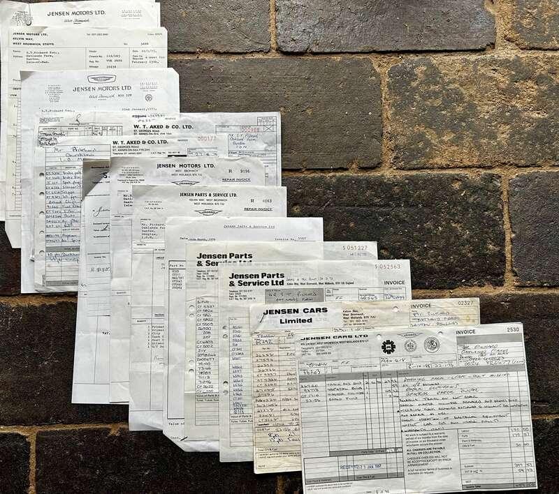 As we understand it, #119/103 has never been restored, painted, crashed, or damaged and surely must be one of the best-preserved FF examples remaining. The interior, although dusty and cobweb-strewn, looks complete, intact and in fine fettle. Likewise, the engine bay looks complete, apart from a battery, clearly showing chassis and engine numbers. We are fully aware of all the details appertaining to #119/103 because it’s original sales invoice, original green logbook and a series of Jensen services invoices all still accompany the car, being retained by our vendor. These documents show just how diligent Mr Pickard was about his FF, ensuring its mechanical health right up until it was laid-up.