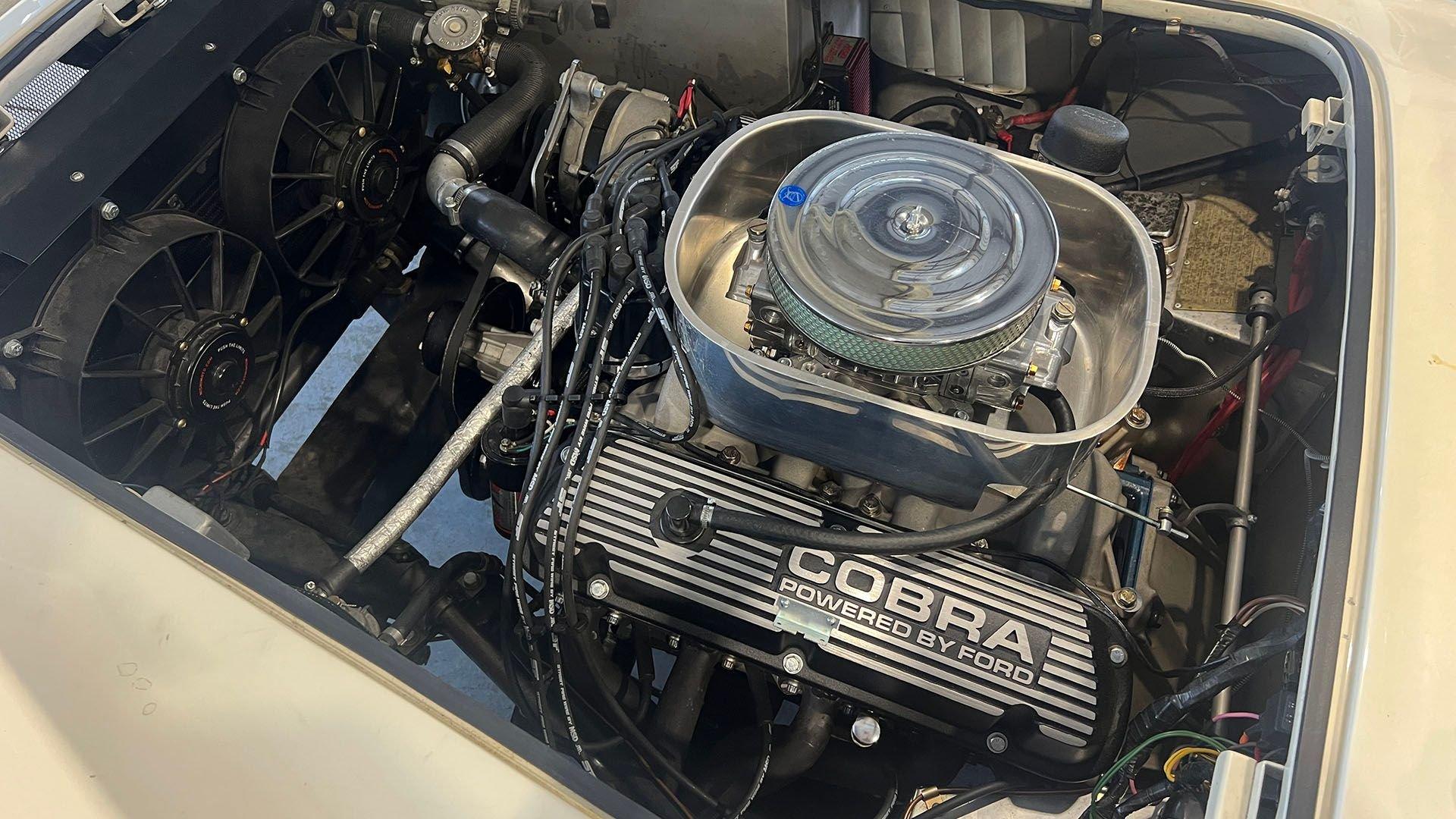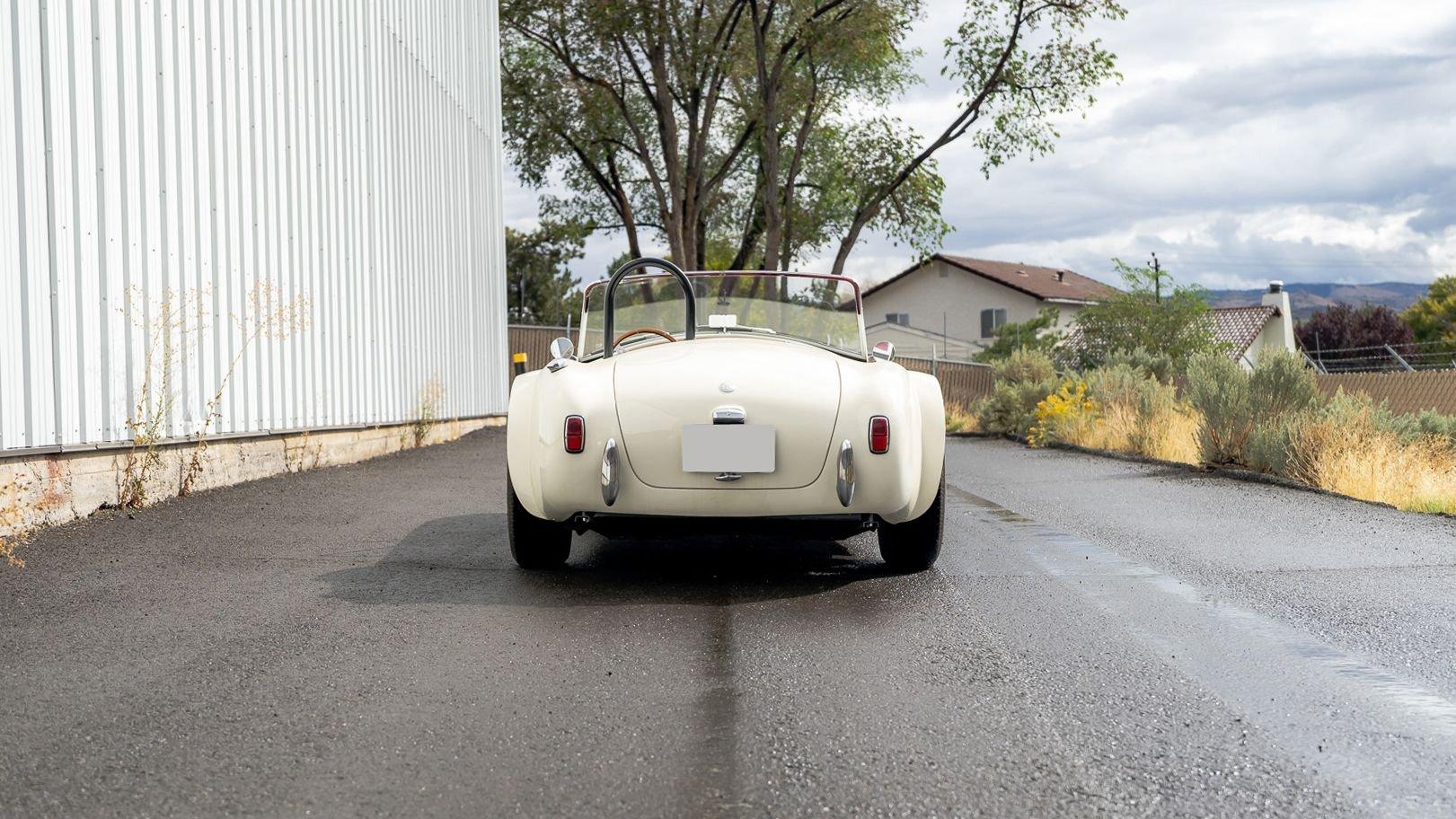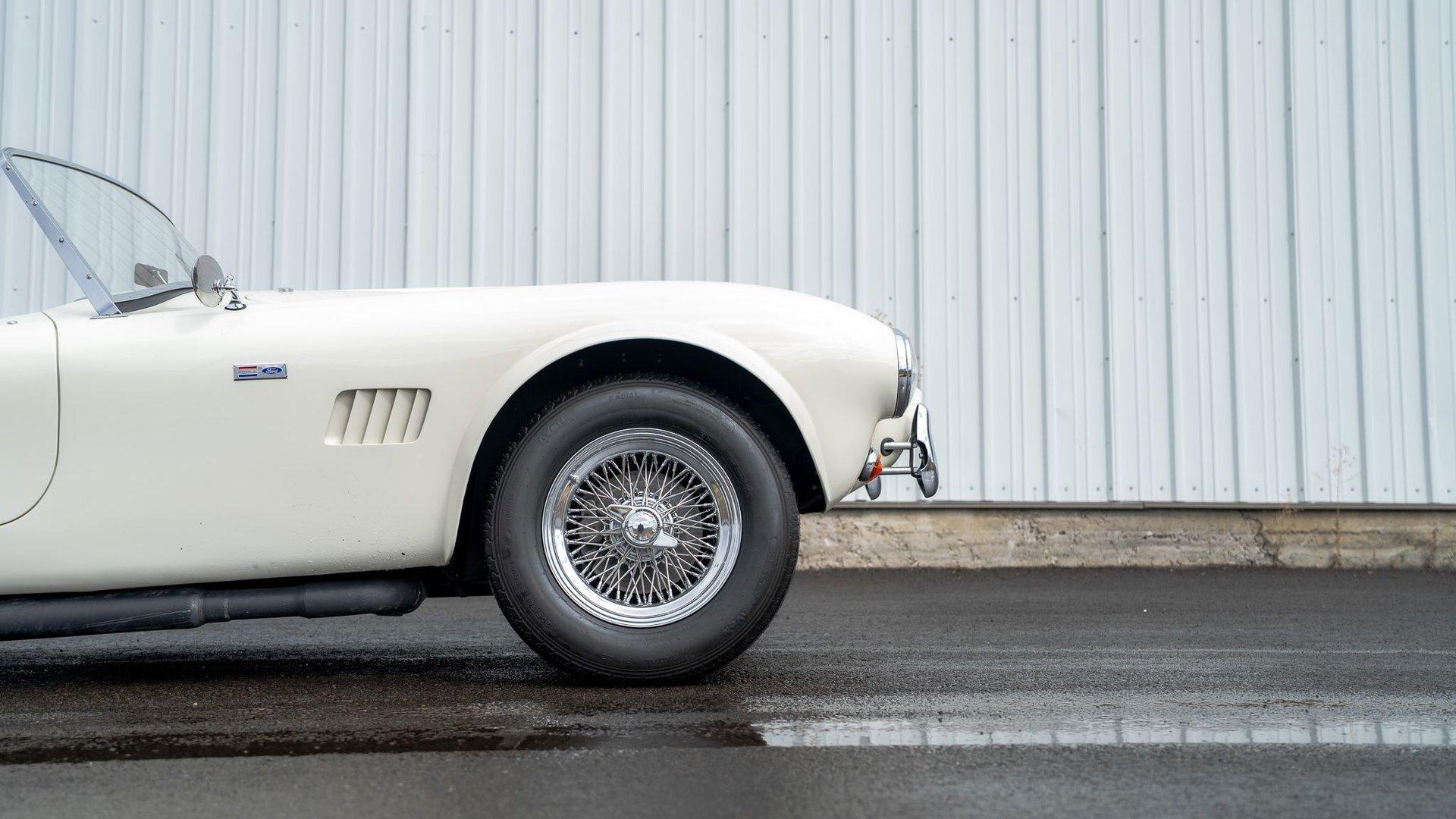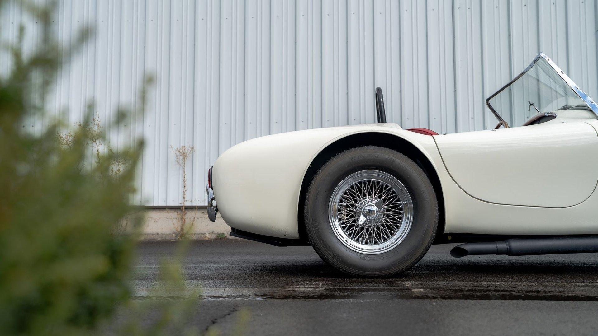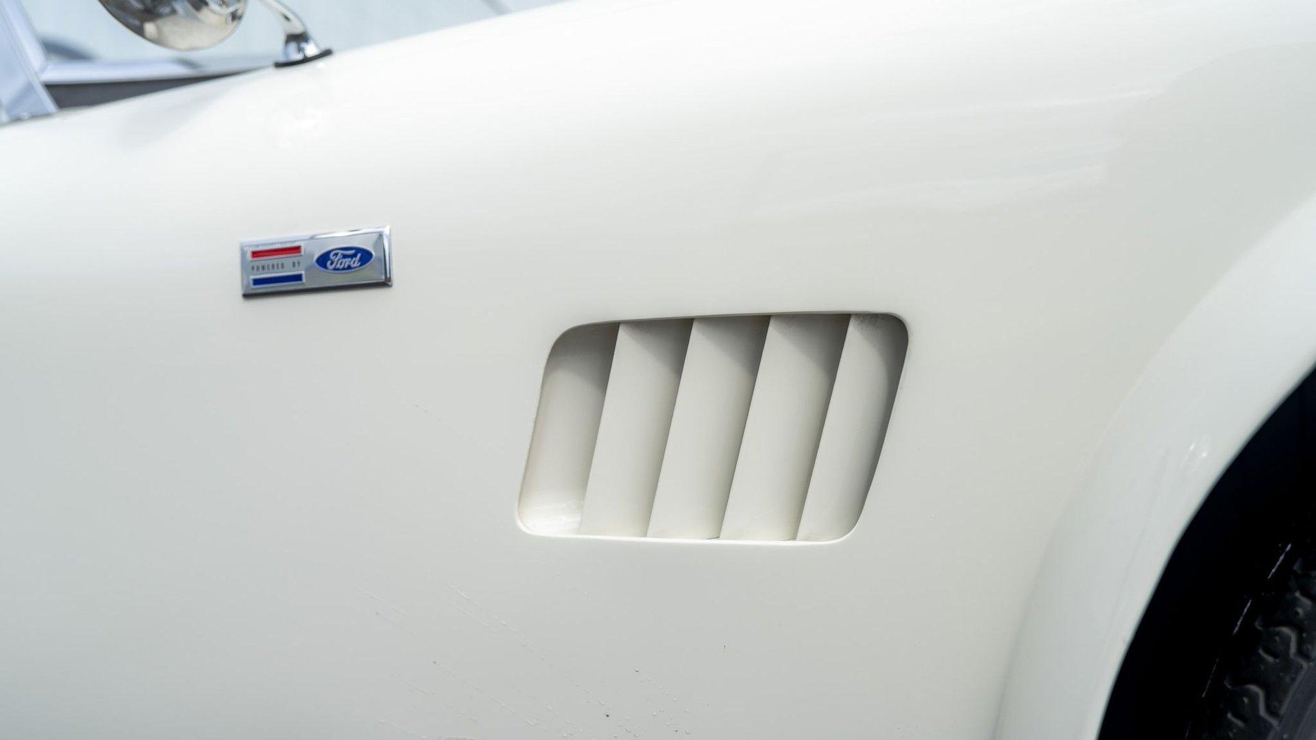 To accommodate-both visually and physically-the V8 swap, the car's styling was updated to reflect design cues found on early Shelby Cobra models. Its Wimbledon White paint hue comes right from the Ford catalog, and enthusiasts will no doubt appreciate the Cobra-style nose, hood scoop, and side vents. Period-style chromed wire wheels wrapped in Avon classic tires sit under its subtly flared fender arches-a nod to the car's English past. The roll hoop sitting aft of the driver's seat serves to complete the package.