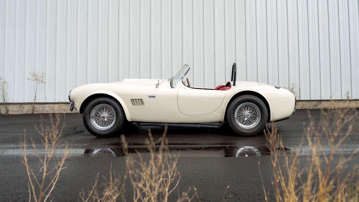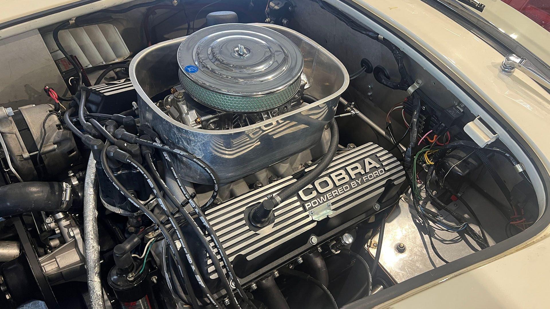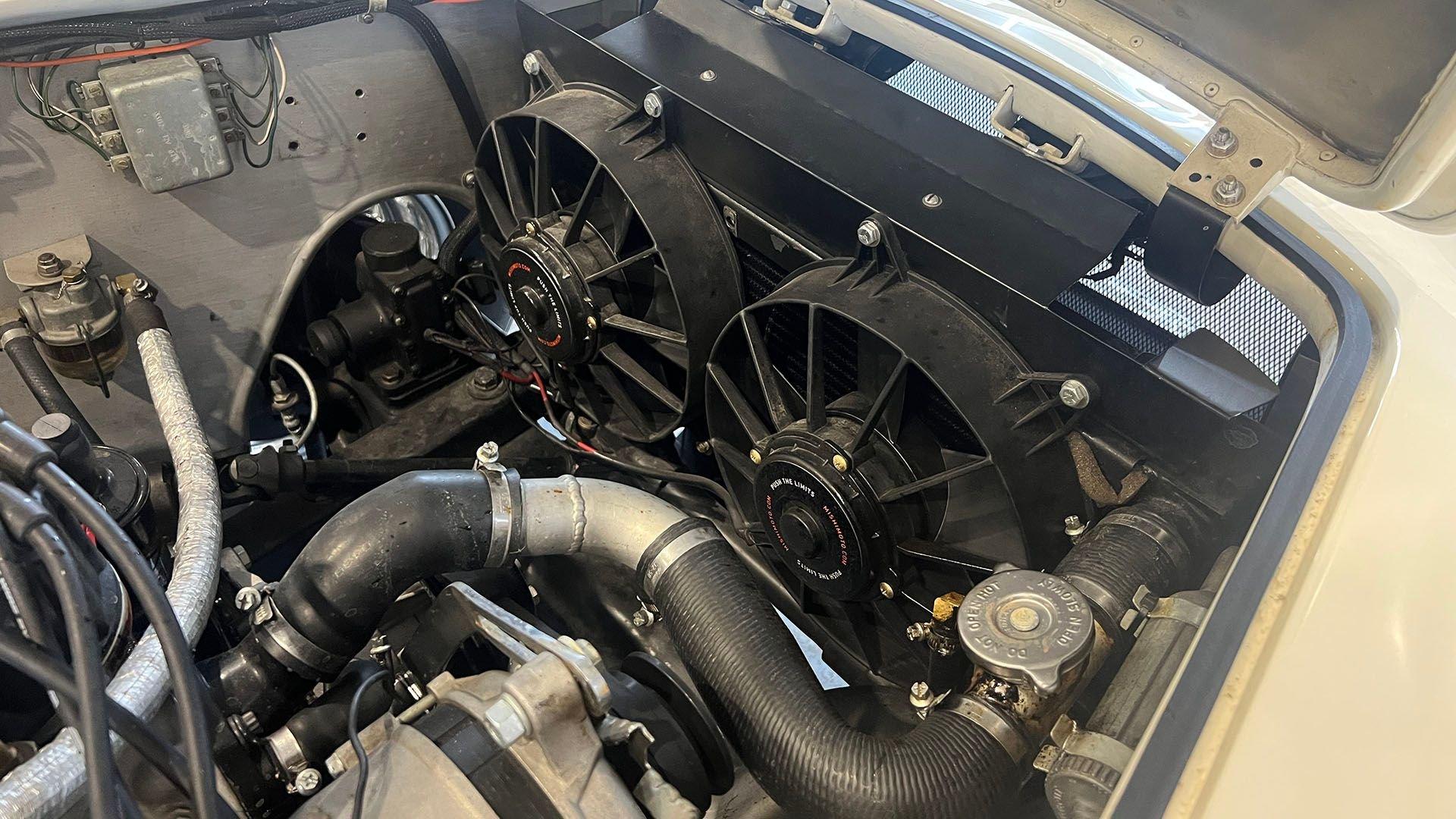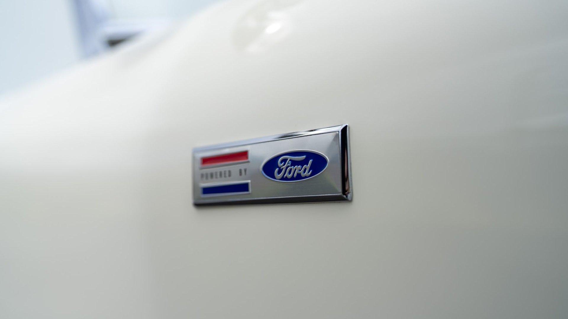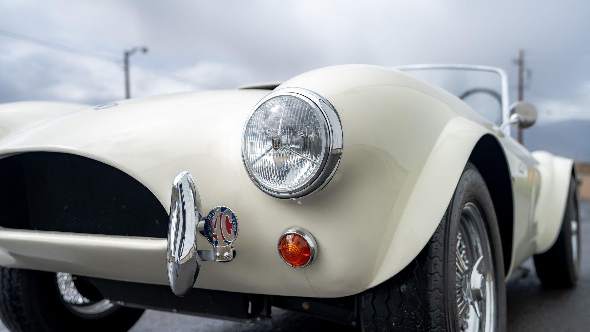 To accommodate-both visually and physically-the V8 swap, the car's styling was updated to reflect design cues found on early Shelby Cobra models. Its Wimbledon White paint hue comes right from the Ford catalog, and enthusiasts will no doubt appreciate the Cobra-style nose, hood scoop, and side vents. Period-style chromed wire wheels wrapped in Avon classic tires sit under its subtly flared fender arches-a nod to the car's English past. The roll hoop sitting aft of the driver's seat serves to complete the package.