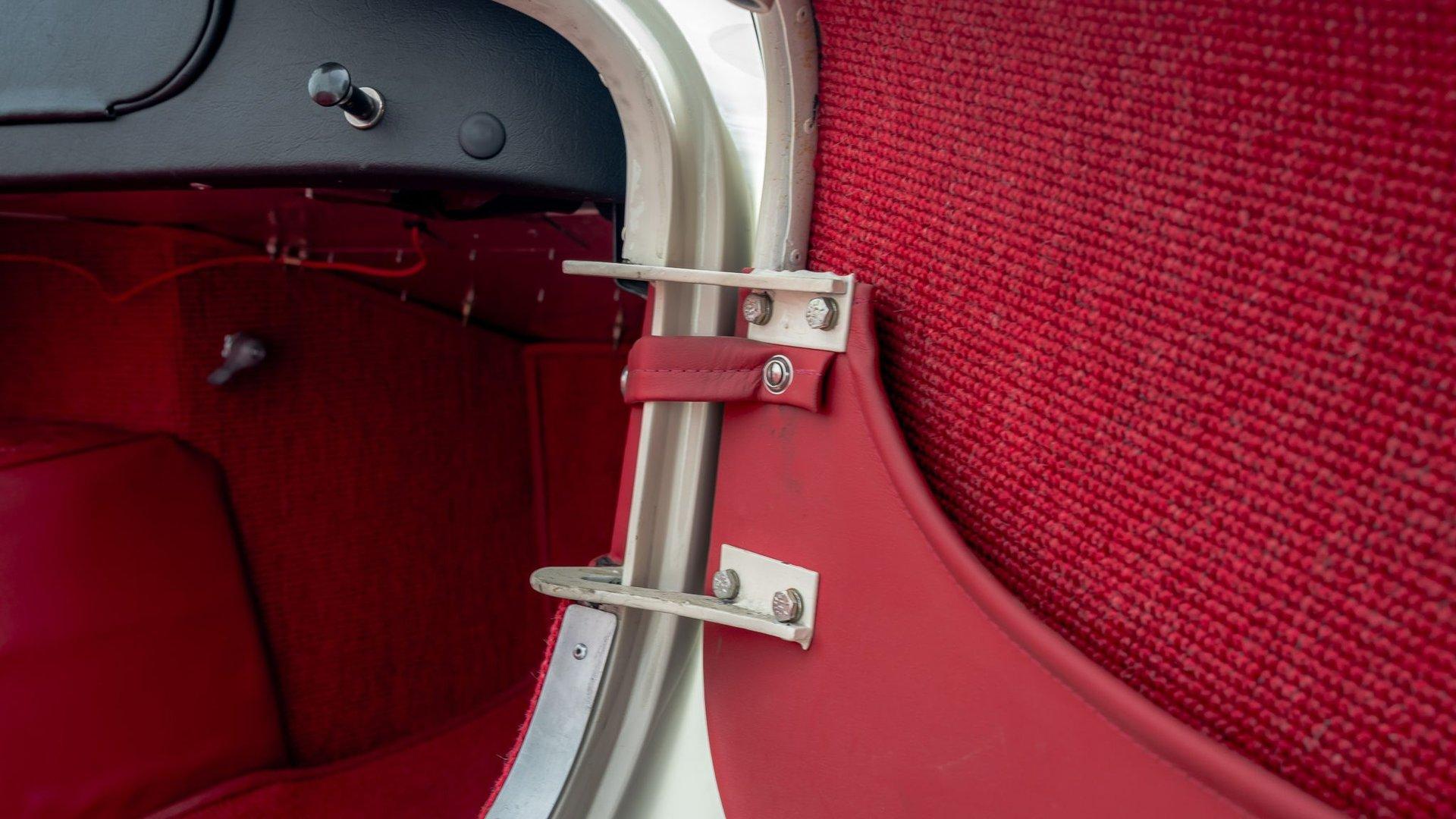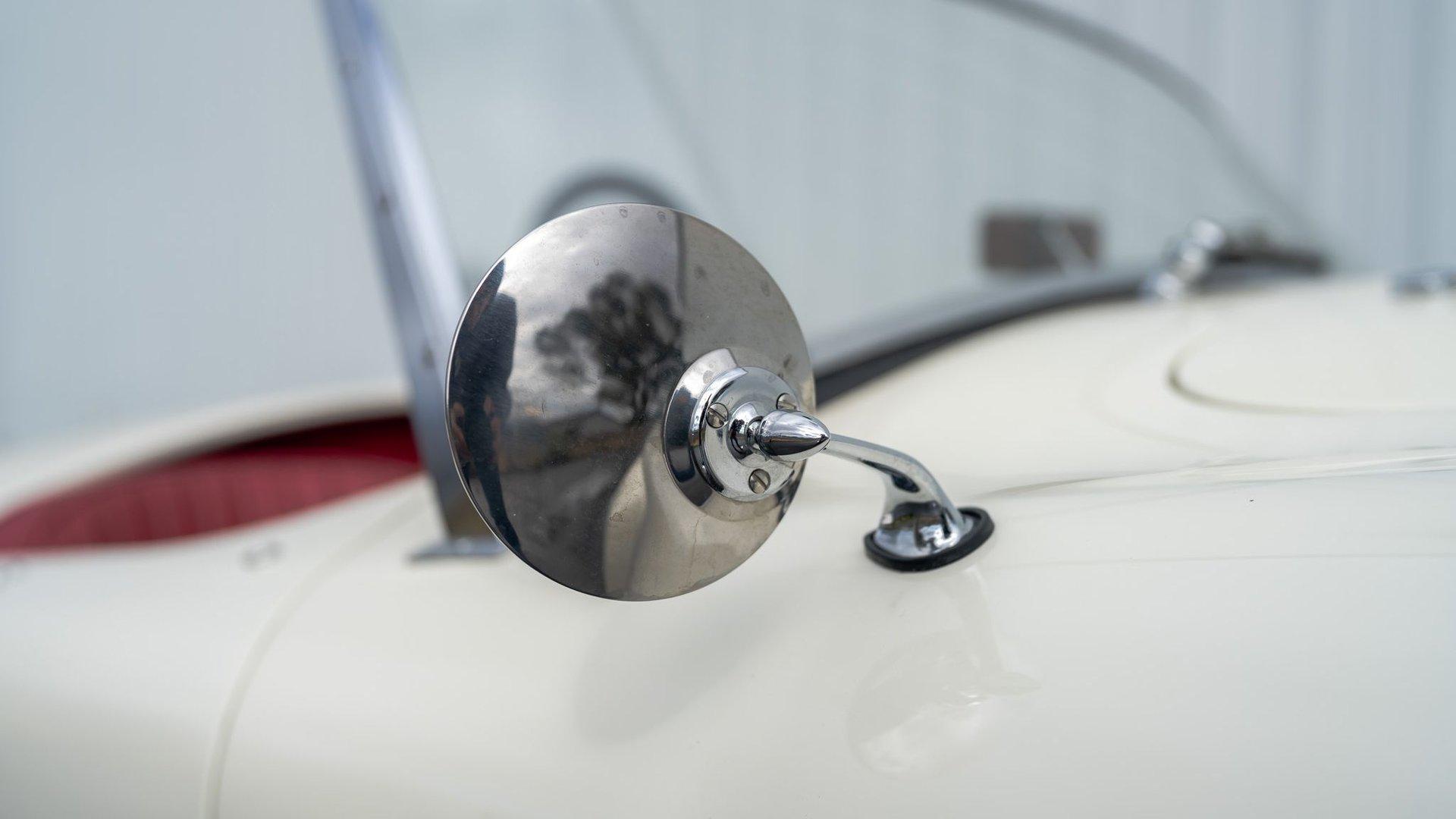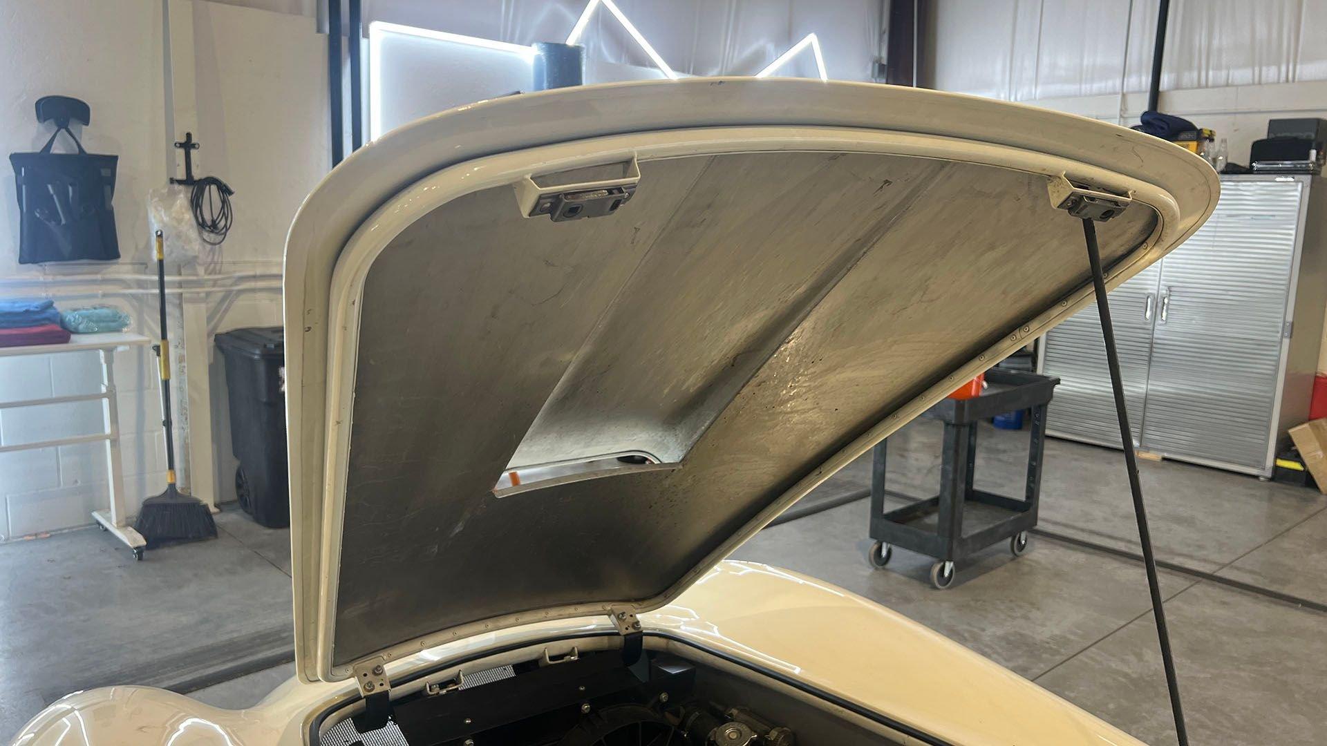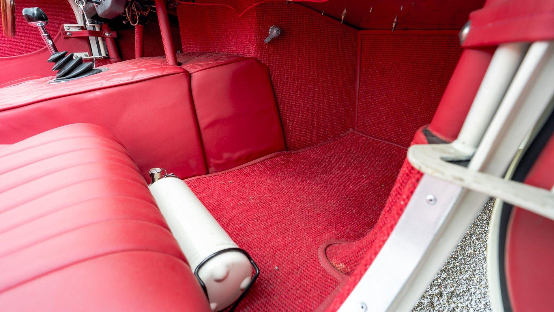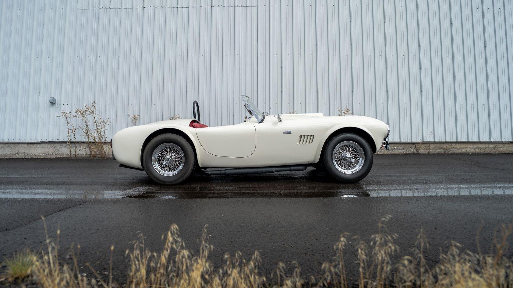 To accommodate-both visually and physically-the V8 swap, the car's styling was updated to reflect design cues found on early Shelby Cobra models. Its Wimbledon White paint hue comes right from the Ford catalog, and enthusiasts will no doubt appreciate the Cobra-style nose, hood scoop, and side vents. Period-style chromed wire wheels wrapped in Avon classic tires sit under its subtly flared fender arches-a nod to the car's English past. The roll hoop sitting aft of the driver's seat serves to complete the package.