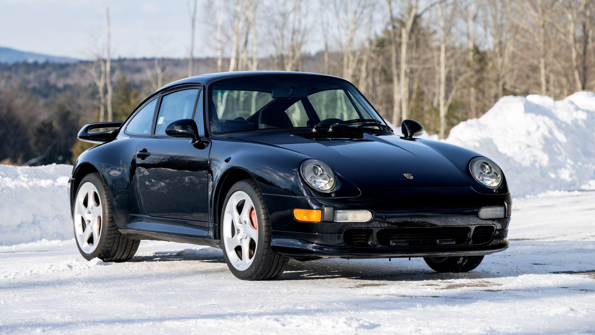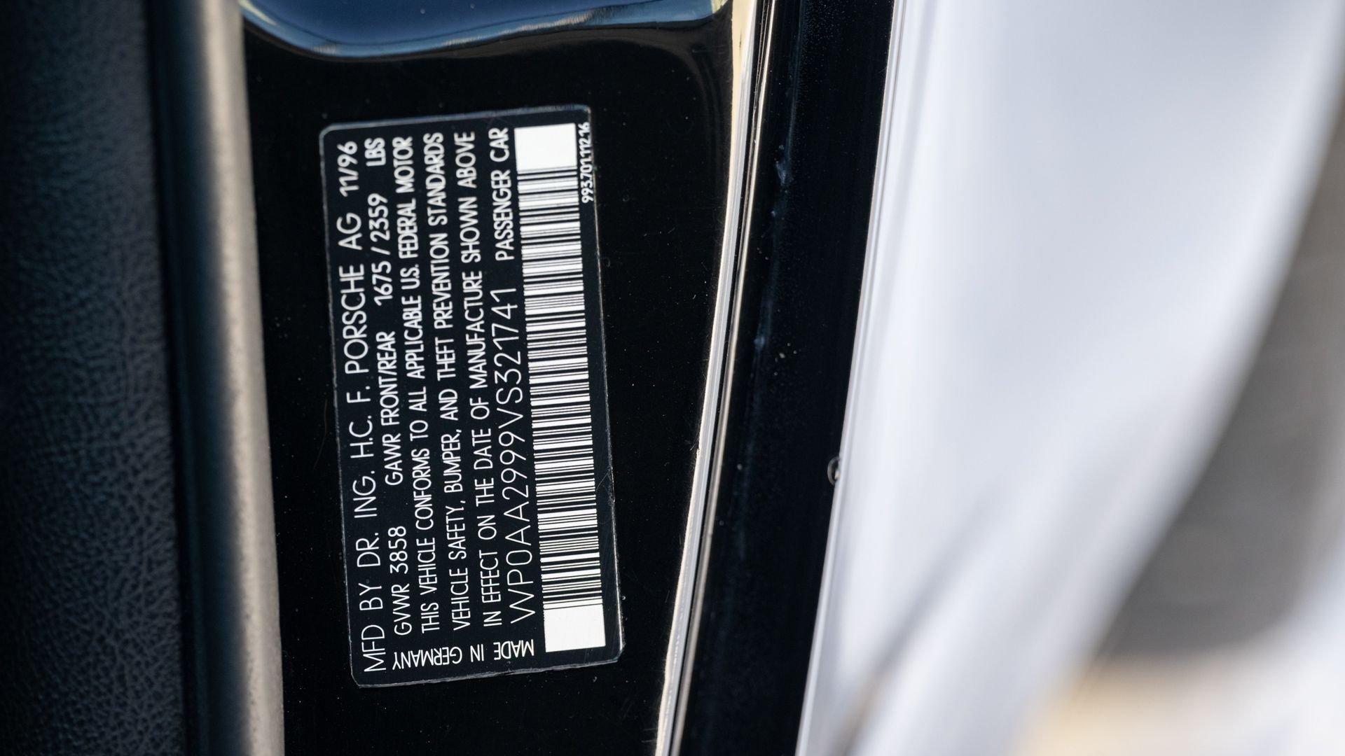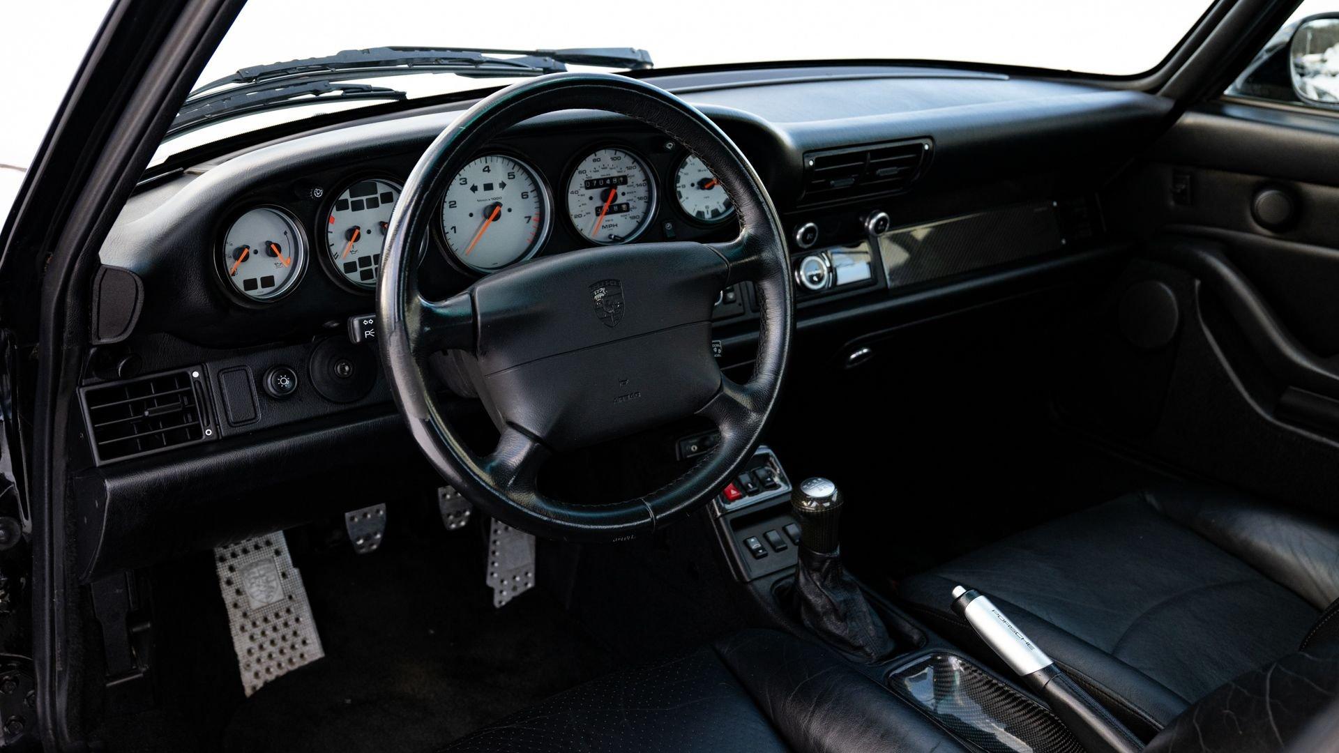Manufactured as U.S. market example on 14 November 1996, this 911 Carrera 4S is finished in its factory configuration of Black over a Black partial leather interior, desirable six-speed manual transmission, and limited-slip differential. Highlights include Aerokit front and rear spoilers (XD1 and XD2) which together form the coveted “Aero II” aerodynamics package. Additional sought-after options include aluminum instrument dials, motor sound package, aluminum and leather combination shifter and hand brake levers, and 10 speaker hi-fidelity sound package.