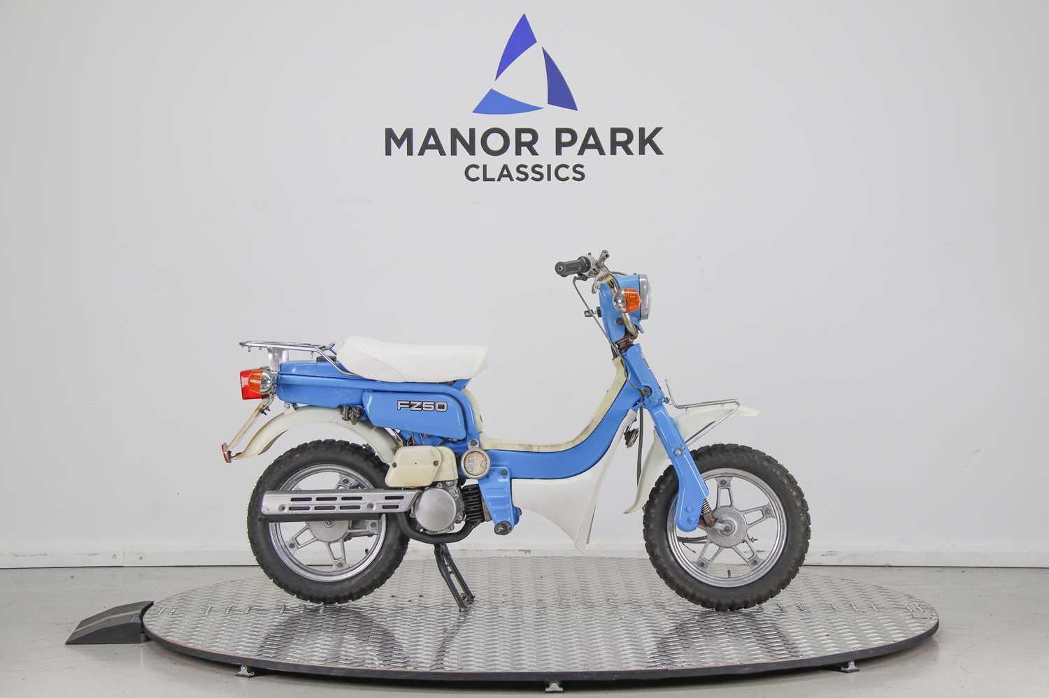 This honest little FZ50 seems to be a lightly restored example with fresh tyres and tidy plastics. The scooter kicks over with good compression, it has been dry stored so no smell of fuel in the tank meaning getting it recommissioned should be a lighter task. The bike has fresh tyres and rolls well. We have been supplied with only one key but no V5, although it is UK registered from the 70s!