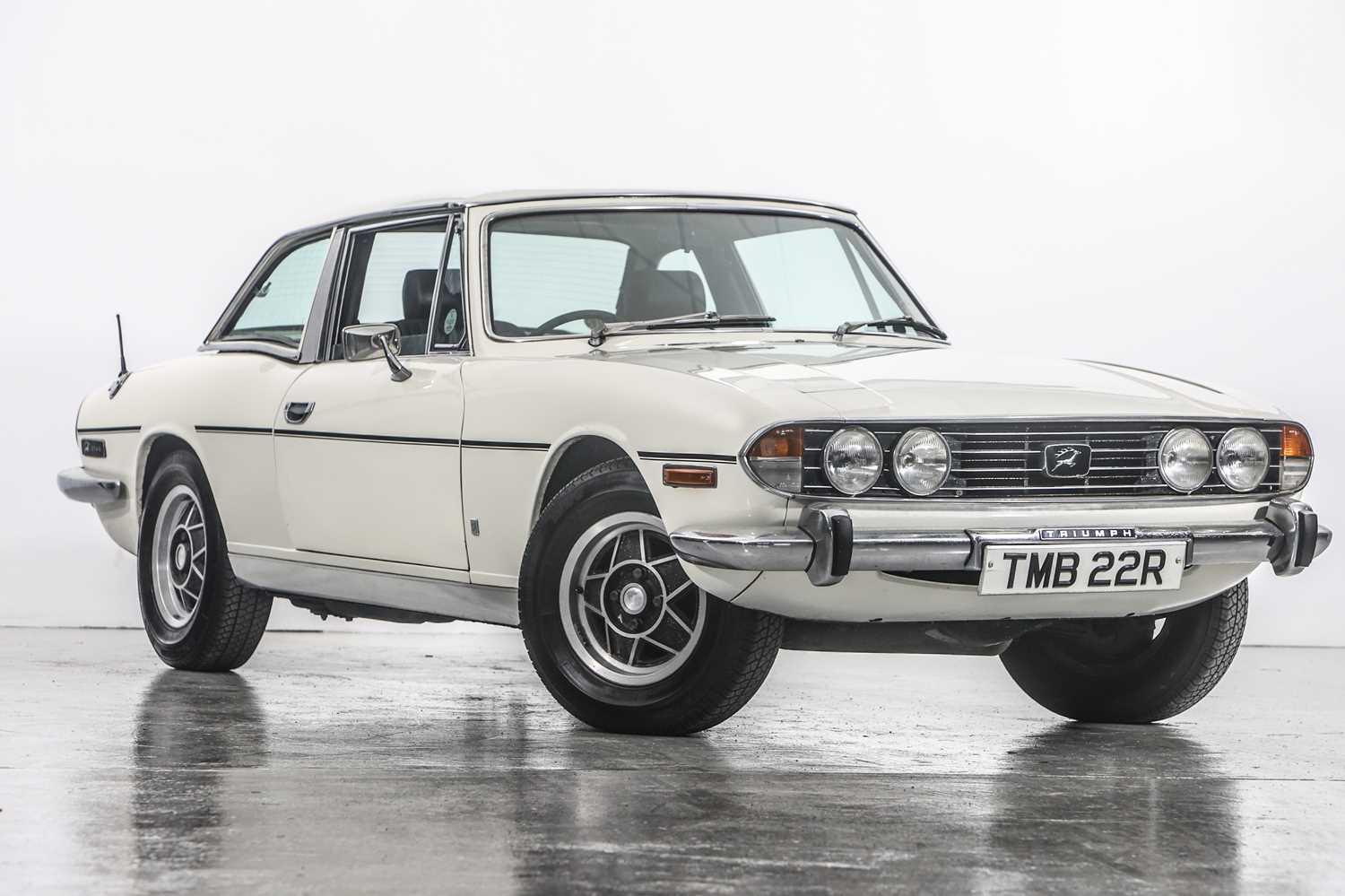 We are delighted to offer this 1976 Triumph Stag in Glacier White with black interior. First registered on 5th October 1976, the Stag was a demonstrator for James Edwards the Triumph dealer in Chester. In the summer of 1977 our vendor spotted the Stag revolving on a turntable in the showroom and fell in love with it. He has now owned it for over 48 years but sadly a combination of age and ill health has meant that it has been parked up since 2008. The original Passport to Service comes with the paperwork and contains 21 stamps, the last being in 1993 at 64,855 miles. There is a small bundle of invoices for parts and maintenance that follows and takes things up to 2007, shortly before it was laid up. The vendor tells us that the engine was rebuilt by James Paddock Ltd of Chester in the early Nineties but we have no documentation to support that. Given its long lay-up, we have not attempted to start it but we are told that when it was parked up it was running well. Clearly a full recommission will be required.