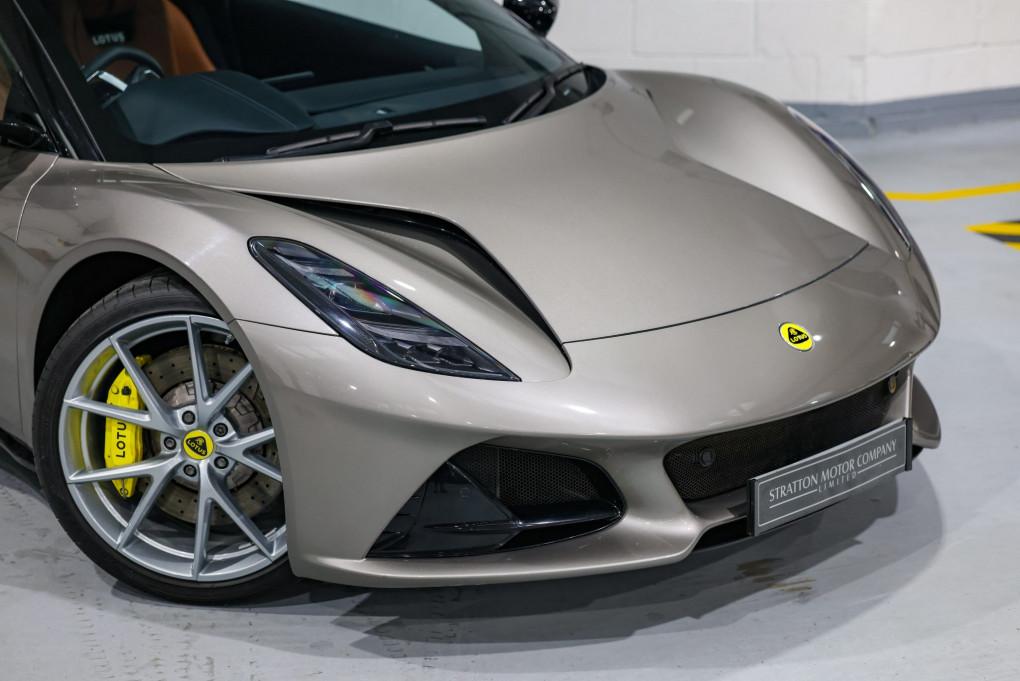 Stratton Motor Company are pleased to offer this stunning 2024 Lotus Emira First Edition 2.0Ltr Turbo DCT with the 8-Speed Automatic gearbox. Finished in Nimbus grey metallic with the optional exterior black pack and built with touring specified suspension. The interior cabin is trimmed with tan leather and highlighted throughout with black inlays stitching.
