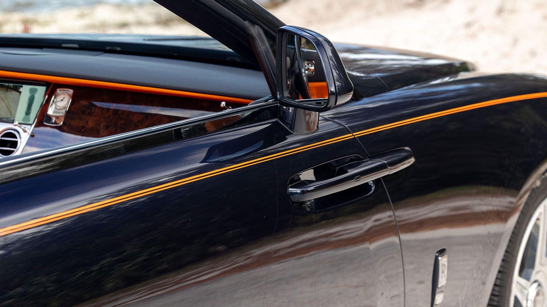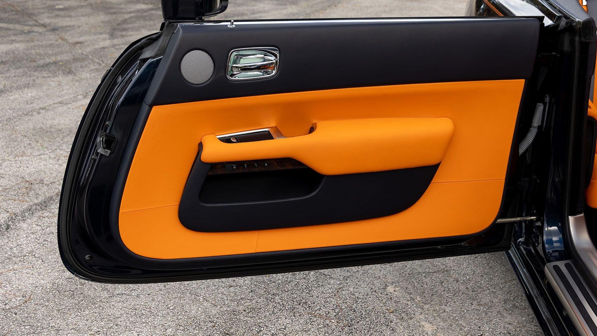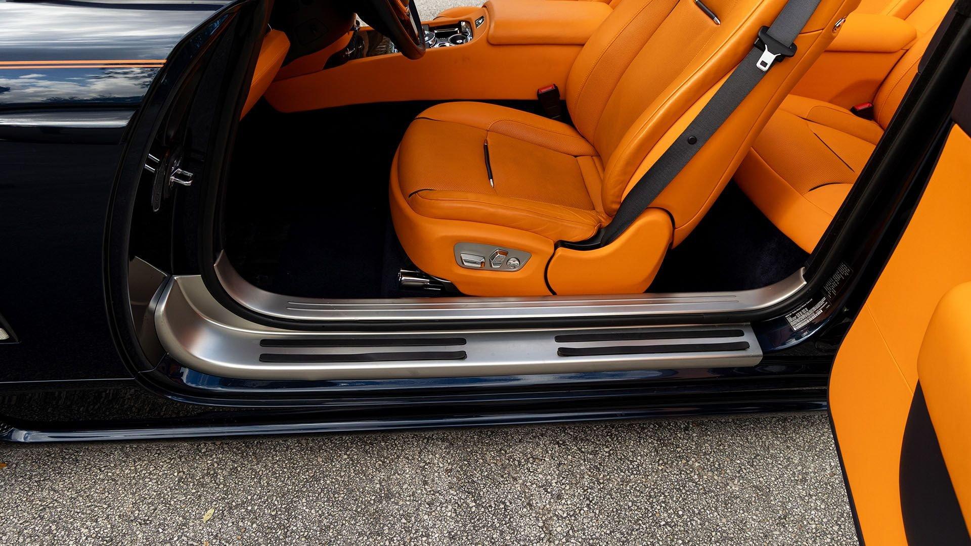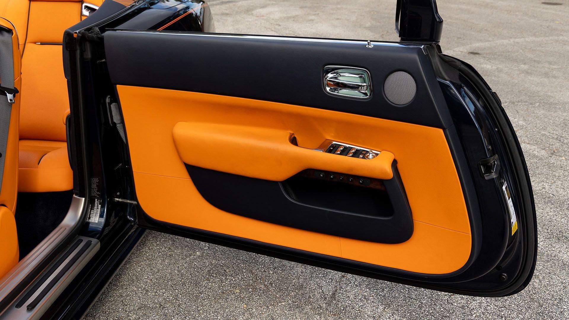 Per a copy of its window sticker, this striking Dawn was finished in Midnight Sapphire accented by a twin Mandarin coachline and originally specified with optional 21-inch Seven-Spoke Part Polished Wheels. Today, it sits on aftermarket 22-inch, seven-spoke wheels and a lowered suspension setup, lending a noticeably more aggressive stance than factory. The sumptuous Mandarin leather cabin was elevated by Bespoke Interior “Module Editing,” lambswool floormats, front ventilated seats, Navy Blue RR monograms embroidered to all headrests, matching Navy Blue seat piping, and a Navy Blue colored steering wheel. With the top lowered, a teak rear deck treatment added a yacht-like finishing touch aft of the cabin. Driver Assistance 3 completed the specification with Active Cruise Control with Stop & Go, a Head-Up Display, Night Vision with Pedestrian Recognition, High-Beam Assistance, and Lane Departure Warning. Both factory umbrellas remain stored in the doors, ready for unexpected weather.