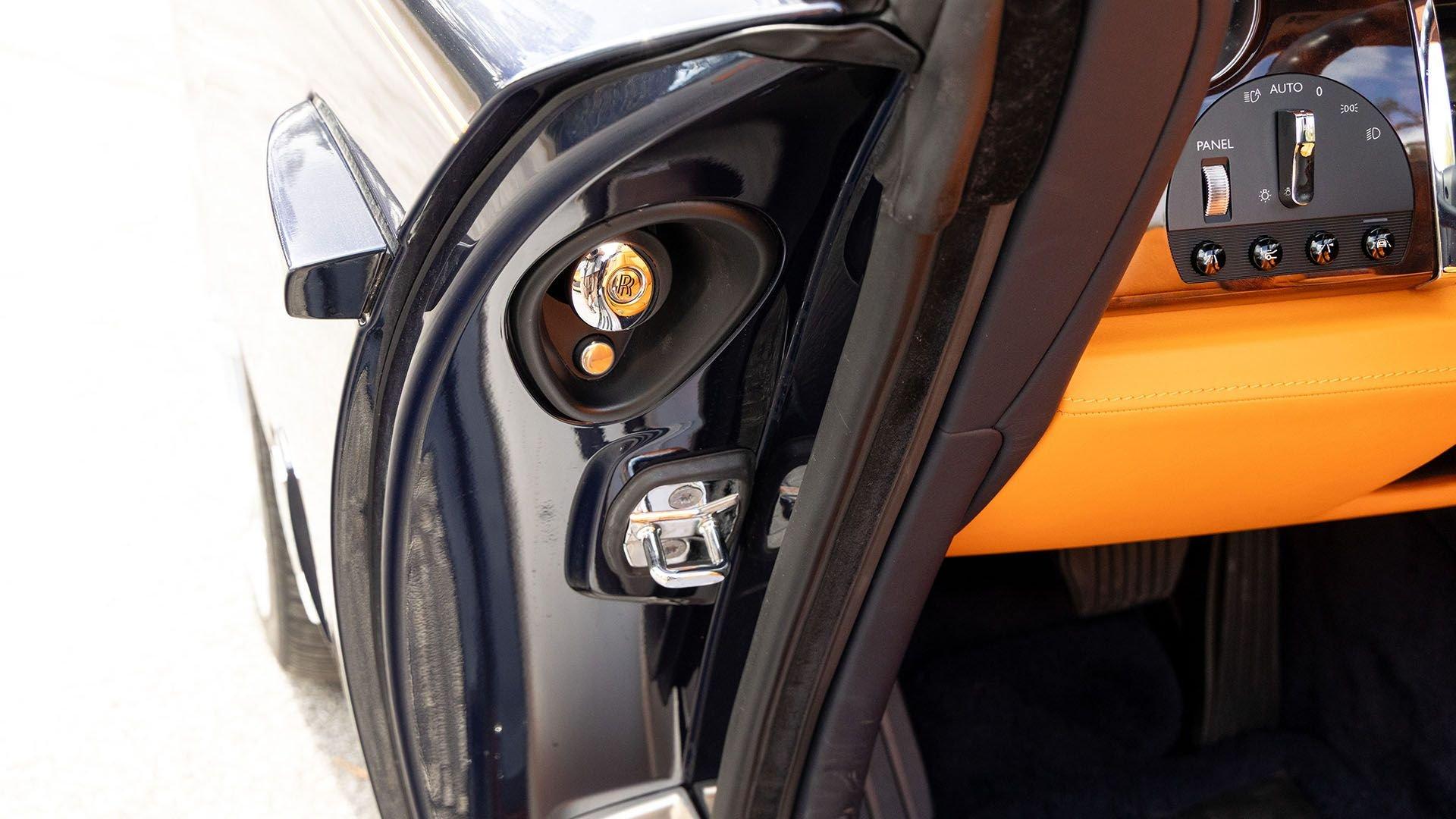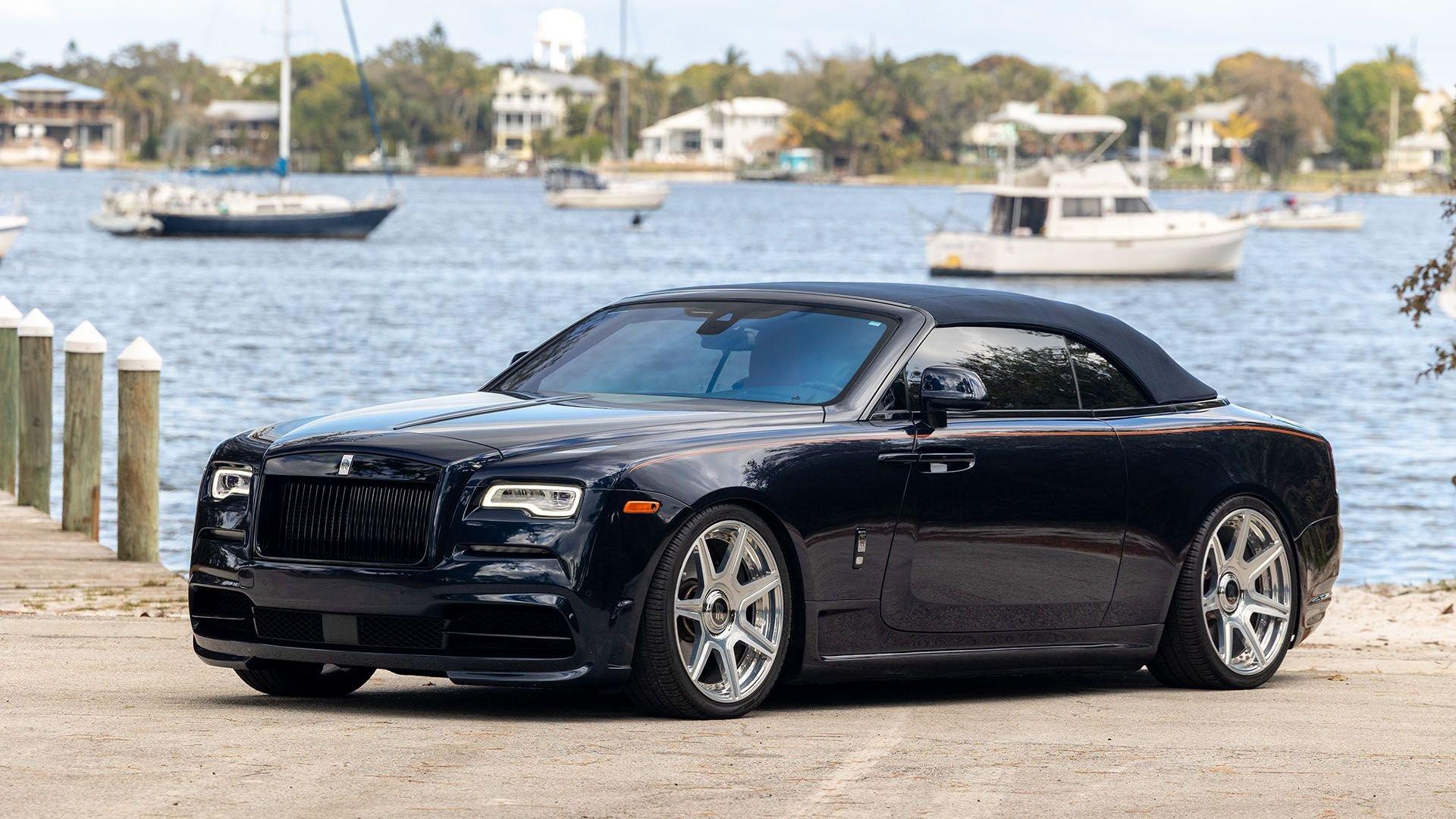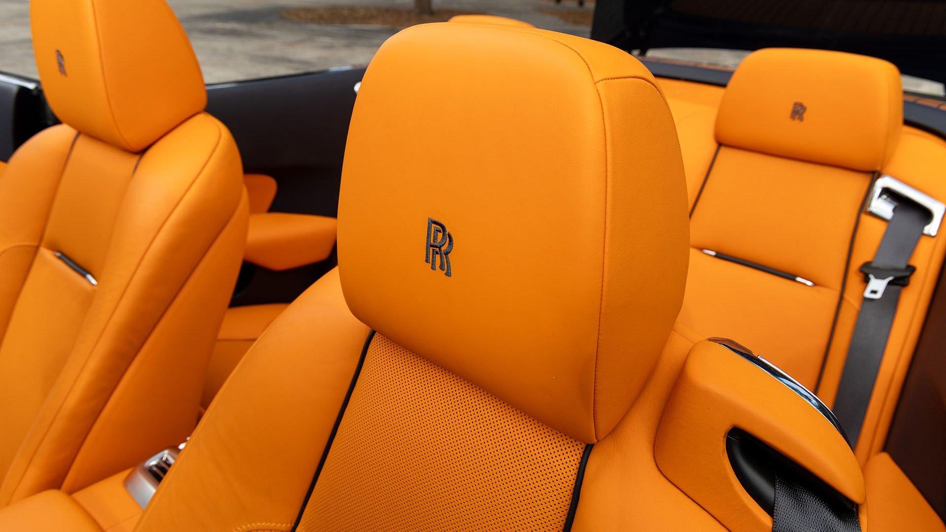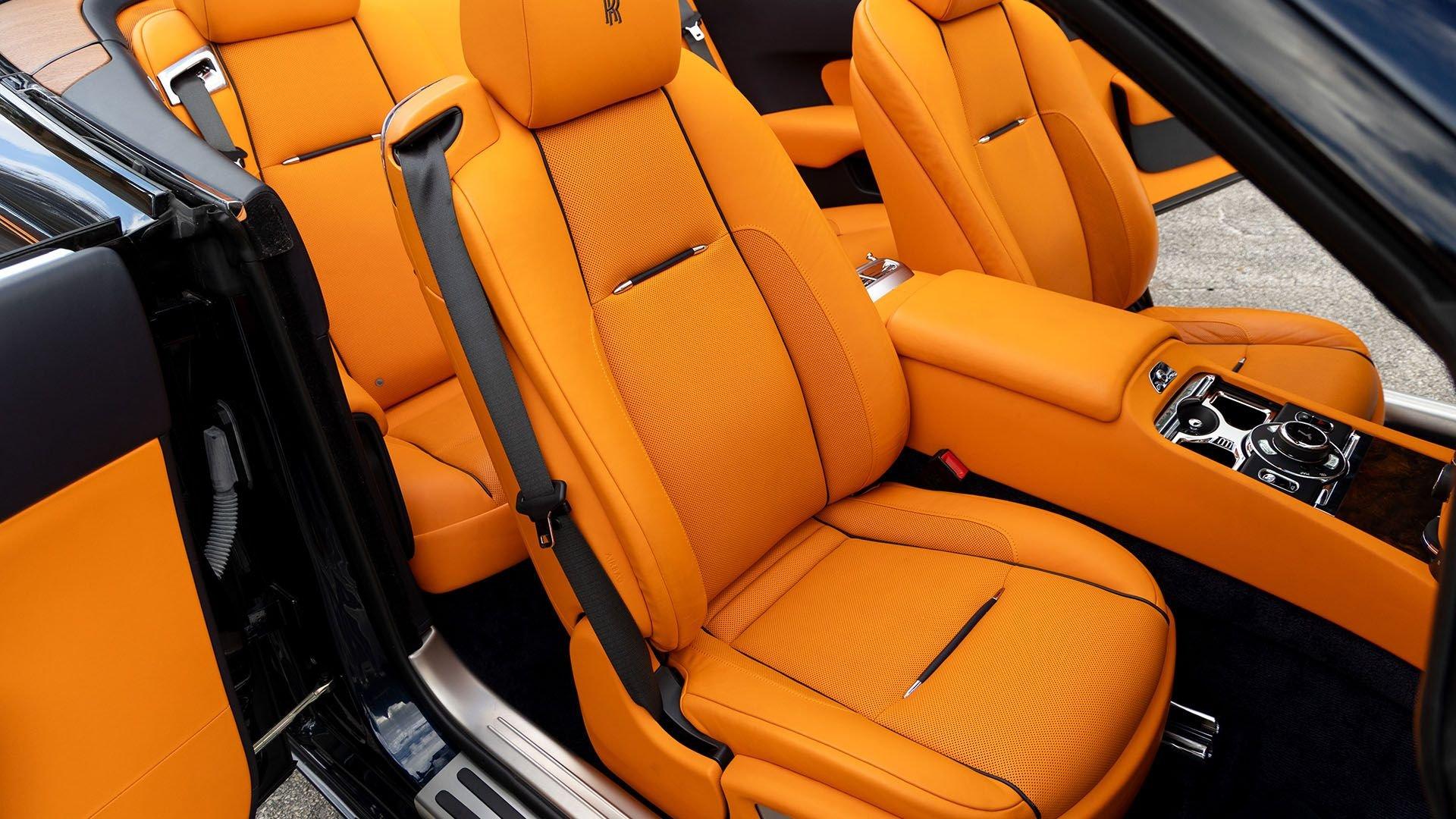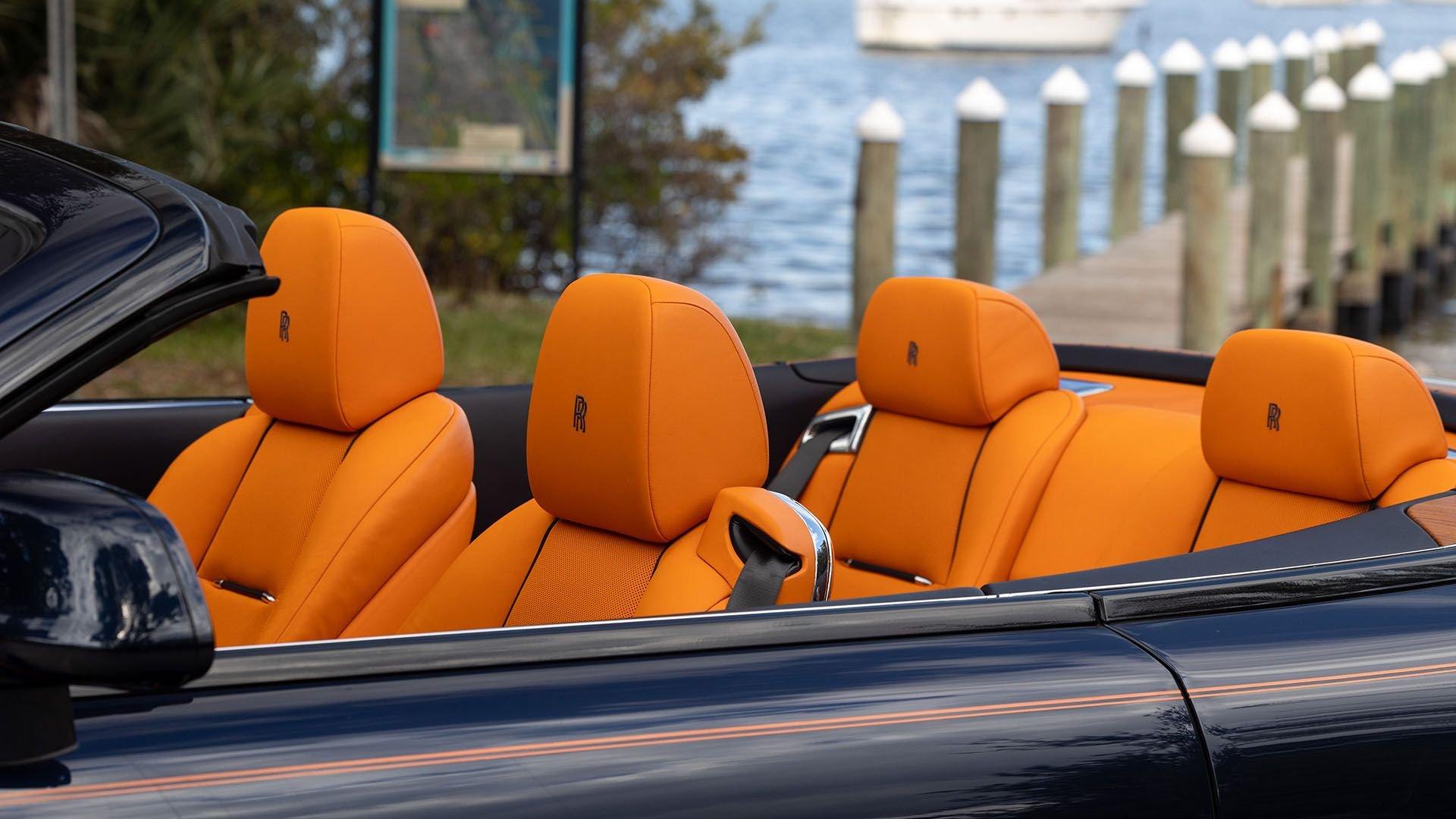 Per a copy of its window sticker, this striking Dawn was finished in Midnight Sapphire accented by a twin Mandarin coachline and originally specified with optional 21-inch Seven-Spoke Part Polished Wheels. Today, it sits on aftermarket 22-inch, seven-spoke wheels and a lowered suspension setup, lending a noticeably more aggressive stance than factory. The sumptuous Mandarin leather cabin was elevated by Bespoke Interior “Module Editing,” lambswool floormats, front ventilated seats, Navy Blue RR monograms embroidered to all headrests, matching Navy Blue seat piping, and a Navy Blue colored steering wheel. With the top lowered, a teak rear deck treatment added a yacht-like finishing touch aft of the cabin. Driver Assistance 3 completed the specification with Active Cruise Control with Stop & Go, a Head-Up Display, Night Vision with Pedestrian Recognition, High-Beam Assistance, and Lane Departure Warning. Both factory umbrellas remain stored in the doors, ready for unexpected weather.