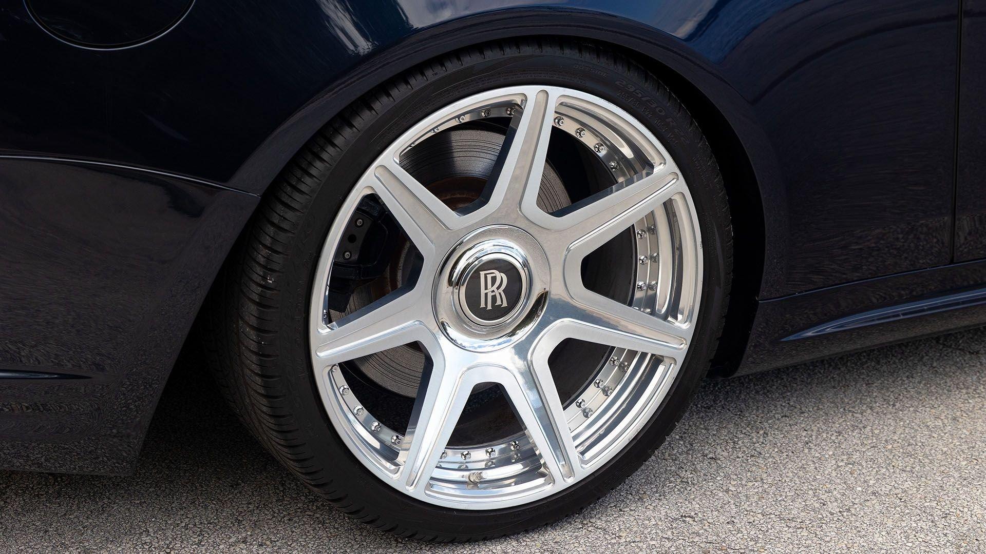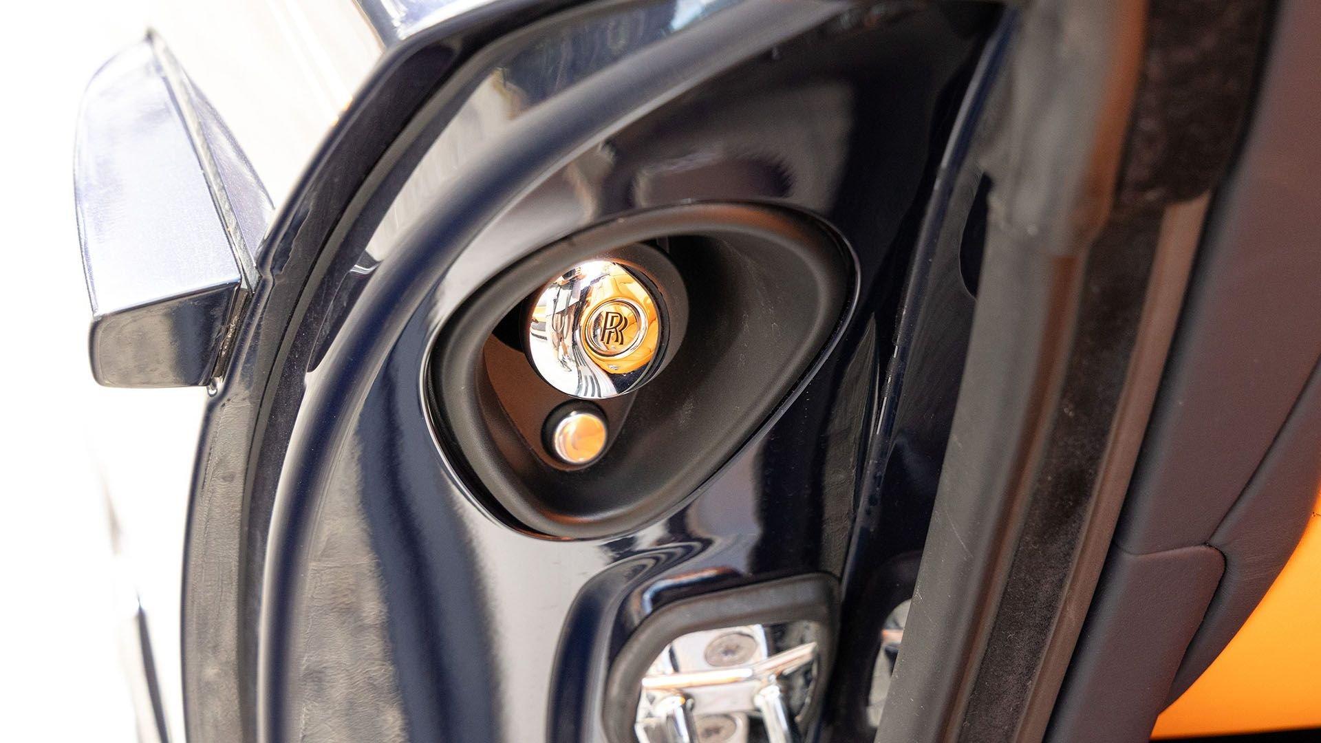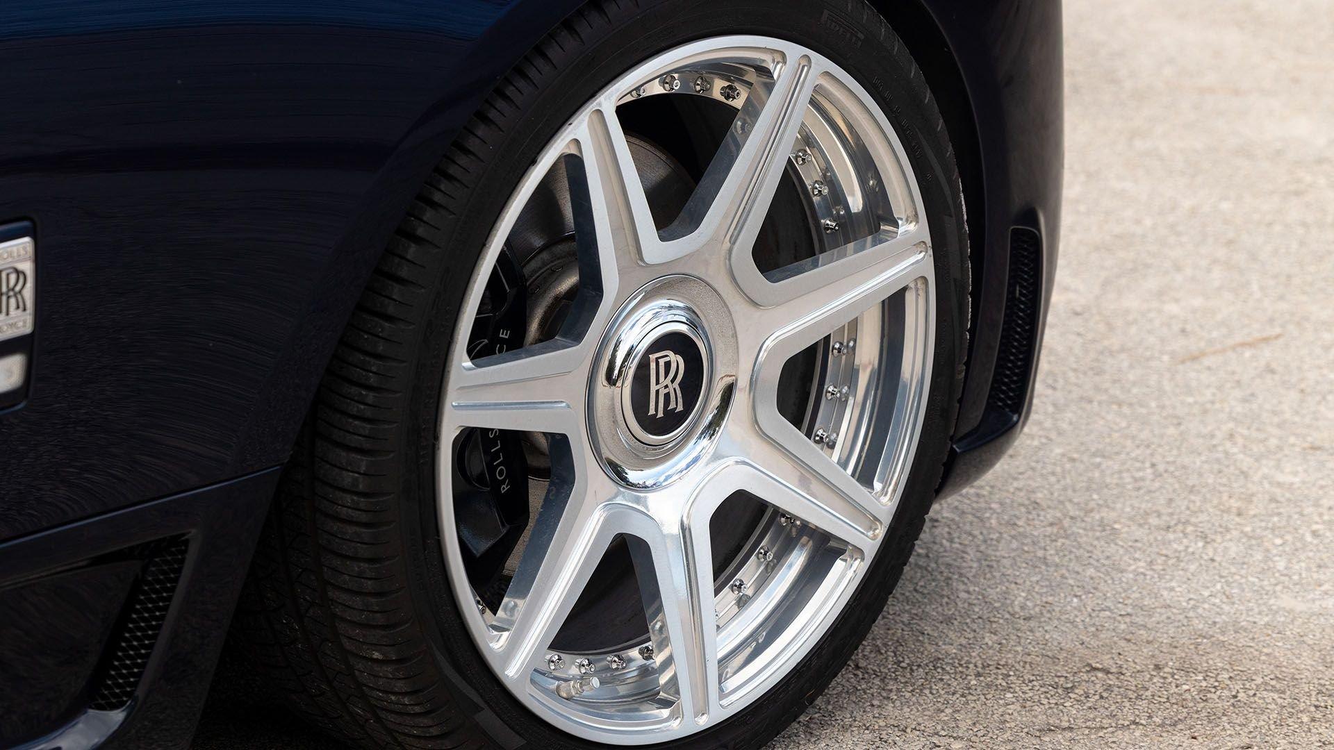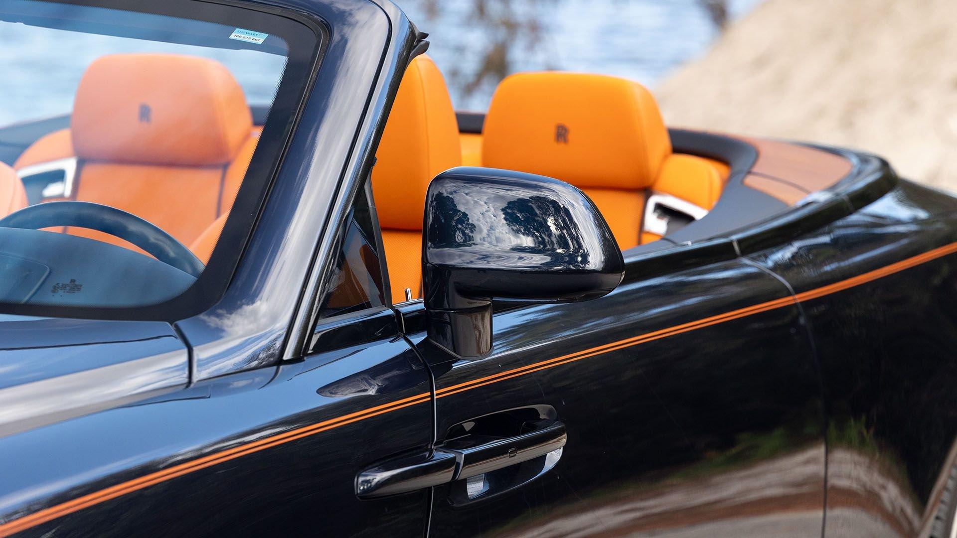 Per a copy of its window sticker, this striking Dawn was finished in Midnight Sapphire accented by a twin Mandarin coachline and originally specified with optional 21-inch Seven-Spoke Part Polished Wheels. Today, it sits on aftermarket 22-inch, seven-spoke wheels and a lowered suspension setup, lending a noticeably more aggressive stance than factory. The sumptuous Mandarin leather cabin was elevated by Bespoke Interior “Module Editing,” lambswool floormats, front ventilated seats, Navy Blue RR monograms embroidered to all headrests, matching Navy Blue seat piping, and a Navy Blue colored steering wheel. With the top lowered, a teak rear deck treatment added a yacht-like finishing touch aft of the cabin. Driver Assistance 3 completed the specification with Active Cruise Control with Stop & Go, a Head-Up Display, Night Vision with Pedestrian Recognition, High-Beam Assistance, and Lane Departure Warning. Both factory umbrellas remain stored in the doors, ready for unexpected weather.