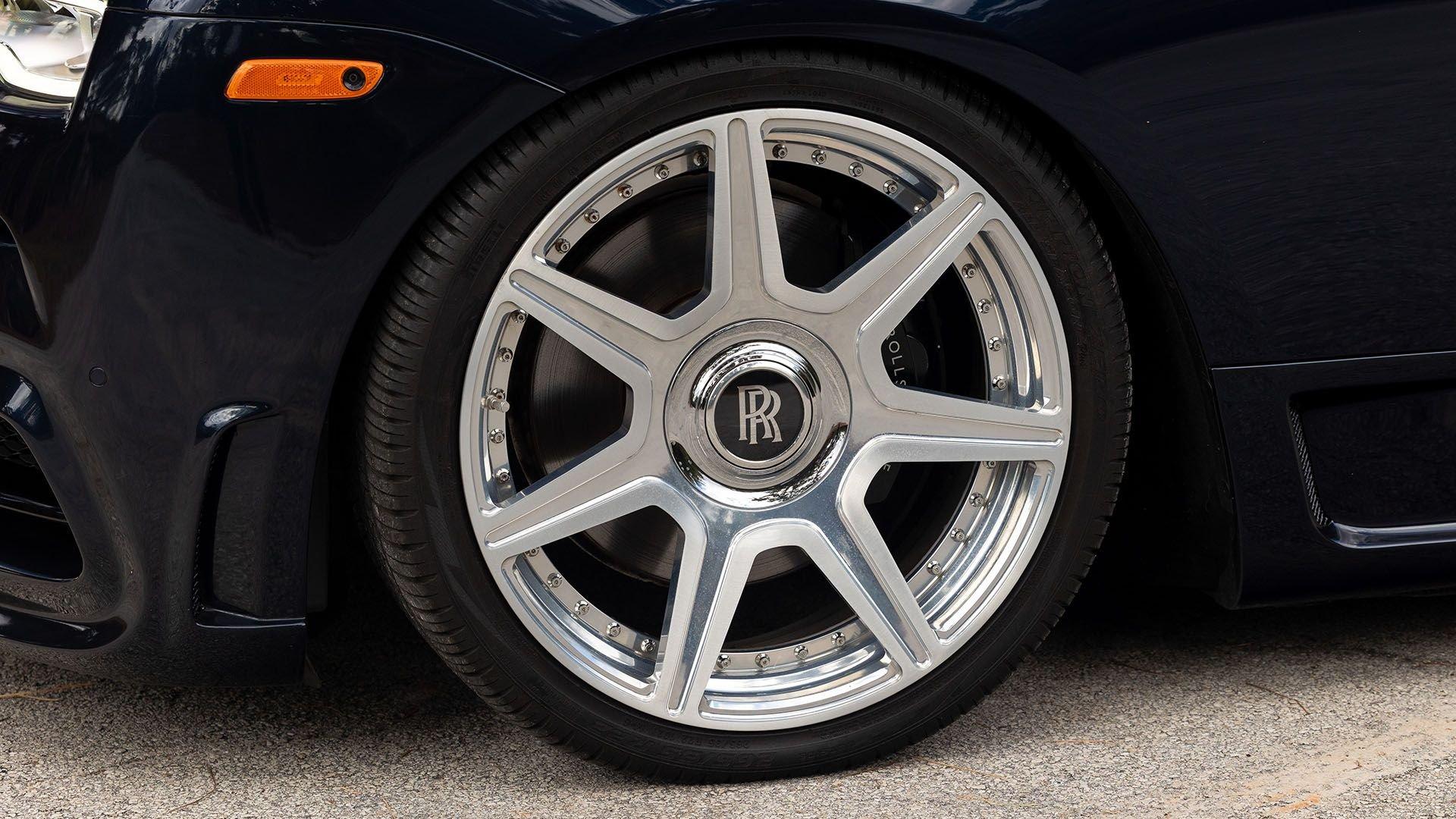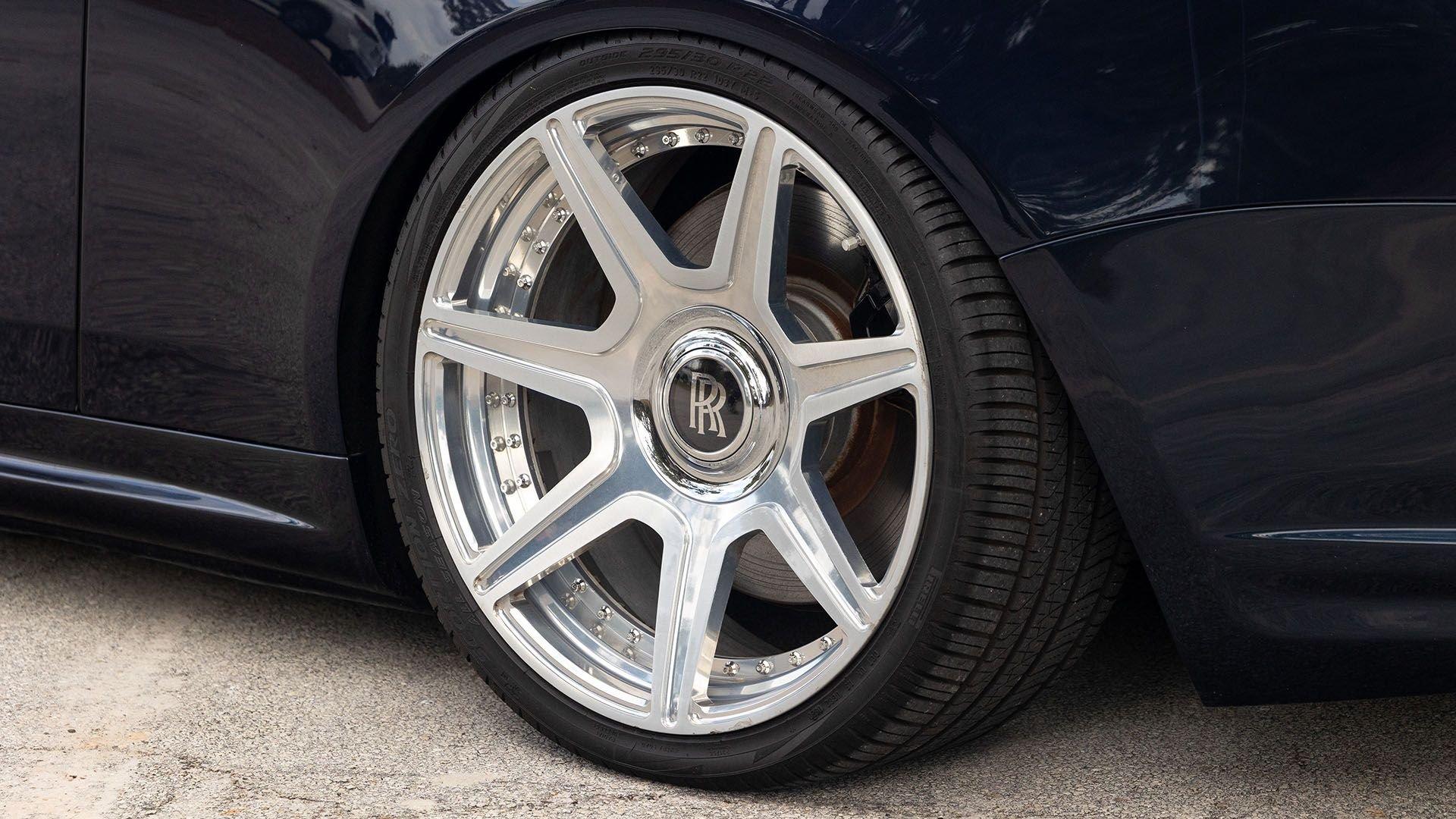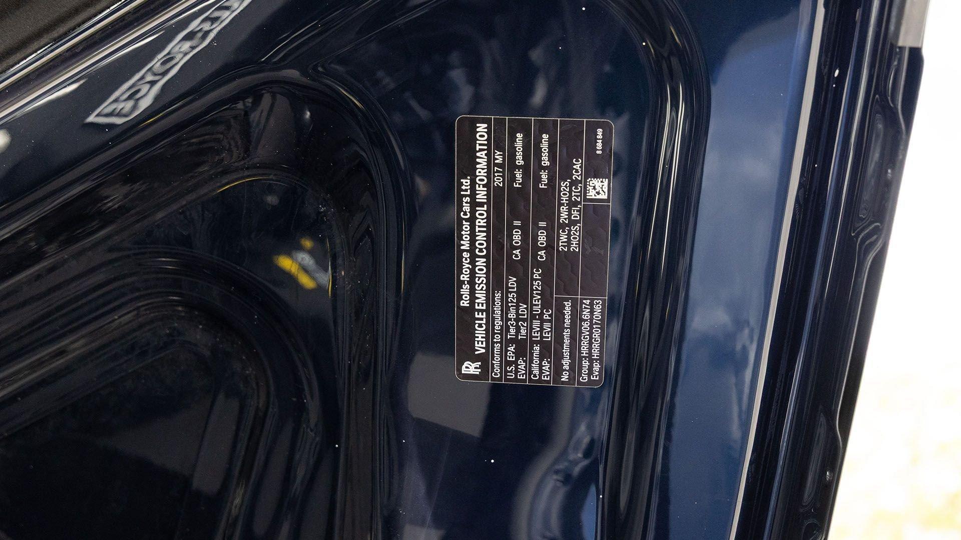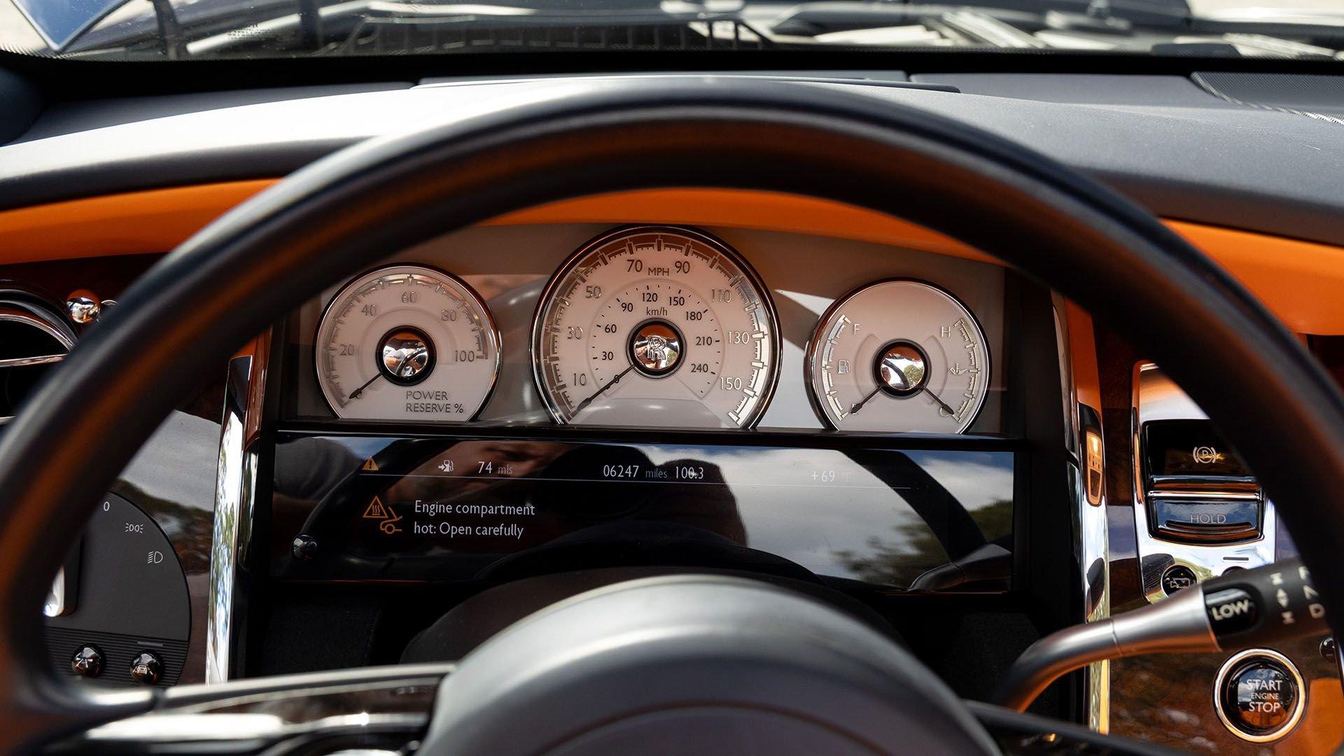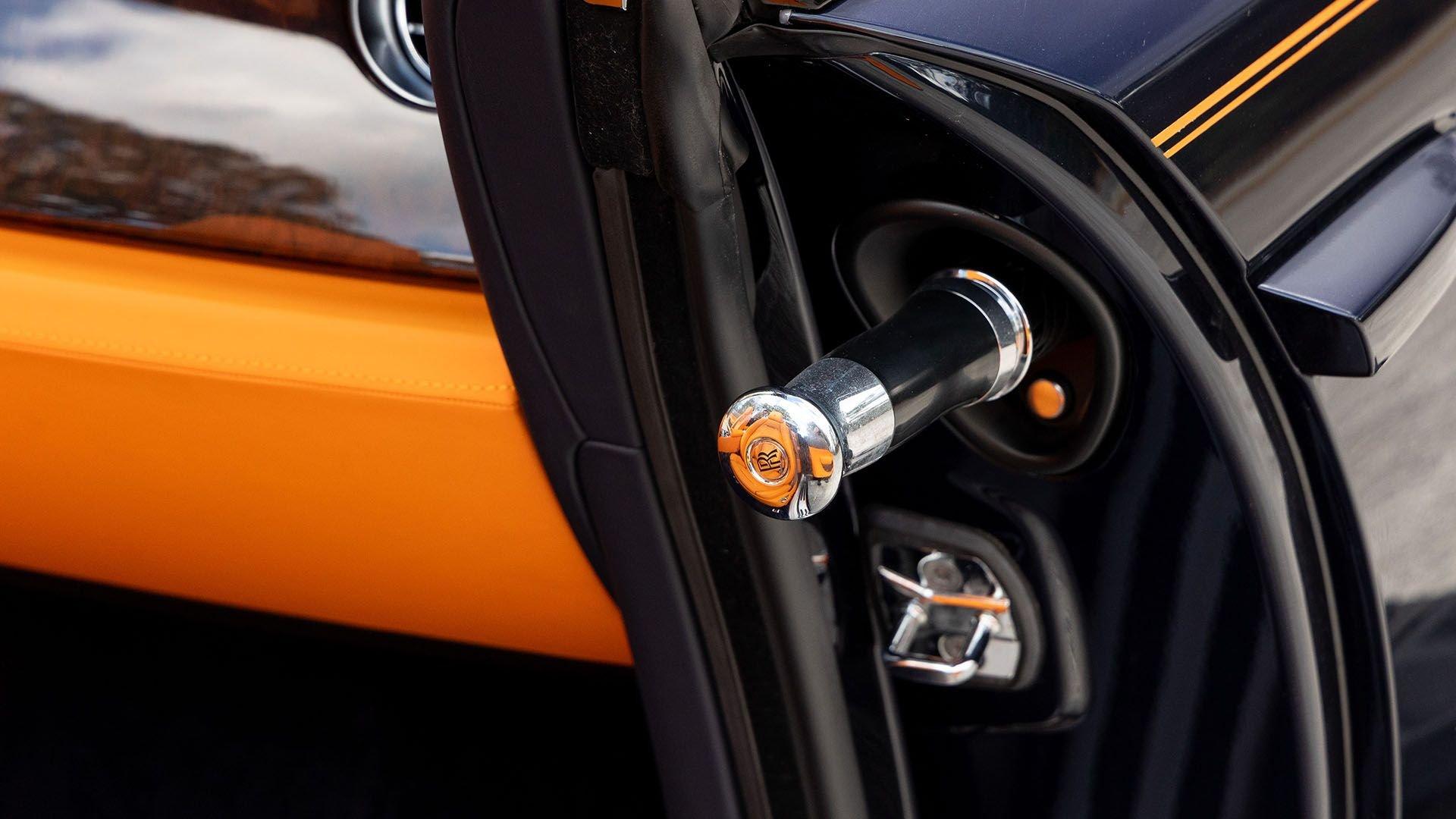 Per a copy of its window sticker, this striking Dawn was finished in Midnight Sapphire accented by a twin Mandarin coachline and originally specified with optional 21-inch Seven-Spoke Part Polished Wheels. Today, it sits on aftermarket 22-inch, seven-spoke wheels and a lowered suspension setup, lending a noticeably more aggressive stance than factory. The sumptuous Mandarin leather cabin was elevated by Bespoke Interior “Module Editing,” lambswool floormats, front ventilated seats, Navy Blue RR monograms embroidered to all headrests, matching Navy Blue seat piping, and a Navy Blue colored steering wheel. With the top lowered, a teak rear deck treatment added a yacht-like finishing touch aft of the cabin. Driver Assistance 3 completed the specification with Active Cruise Control with Stop & Go, a Head-Up Display, Night Vision with Pedestrian Recognition, High-Beam Assistance, and Lane Departure Warning. Both factory umbrellas remain stored in the doors, ready for unexpected weather.