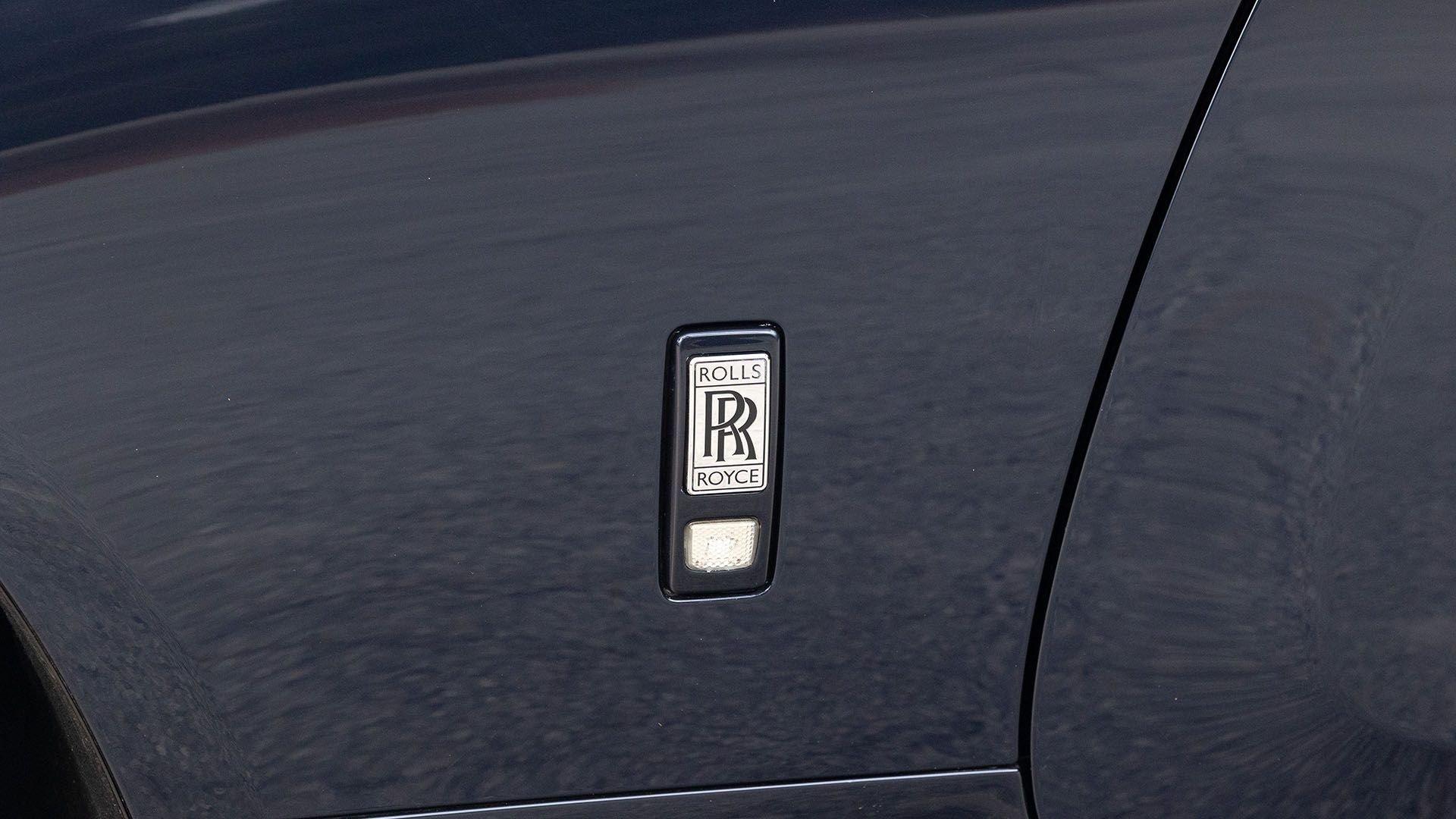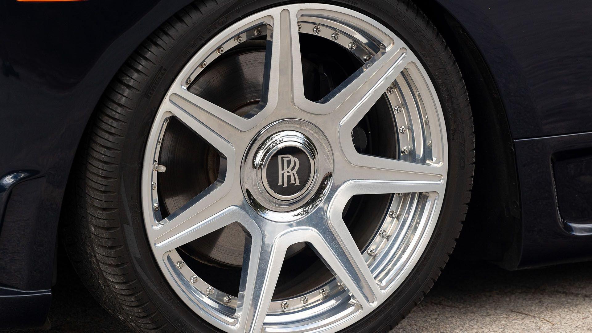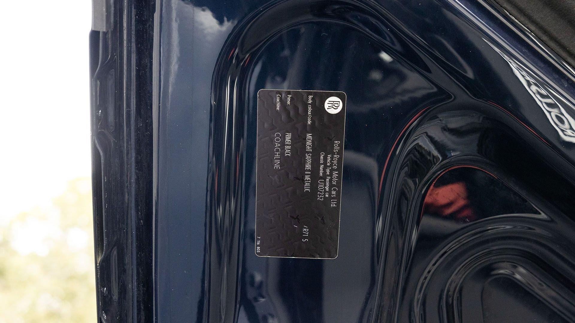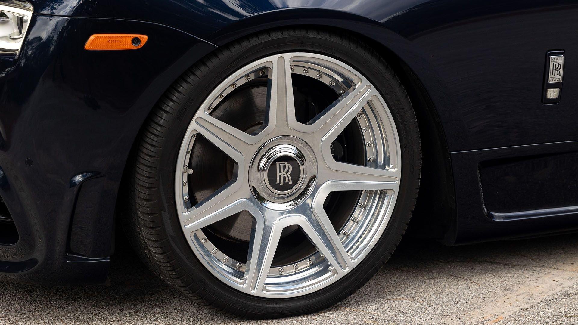 Per a copy of its window sticker, this striking Dawn was finished in Midnight Sapphire accented by a twin Mandarin coachline and originally specified with optional 21-inch Seven-Spoke Part Polished Wheels. Today, it sits on aftermarket 22-inch, seven-spoke wheels and a lowered suspension setup, lending a noticeably more aggressive stance than factory. The sumptuous Mandarin leather cabin was elevated by Bespoke Interior “Module Editing,” lambswool floormats, front ventilated seats, Navy Blue RR monograms embroidered to all headrests, matching Navy Blue seat piping, and a Navy Blue colored steering wheel. With the top lowered, a teak rear deck treatment added a yacht-like finishing touch aft of the cabin. Driver Assistance 3 completed the specification with Active Cruise Control with Stop & Go, a Head-Up Display, Night Vision with Pedestrian Recognition, High-Beam Assistance, and Lane Departure Warning. Both factory umbrellas remain stored in the doors, ready for unexpected weather.