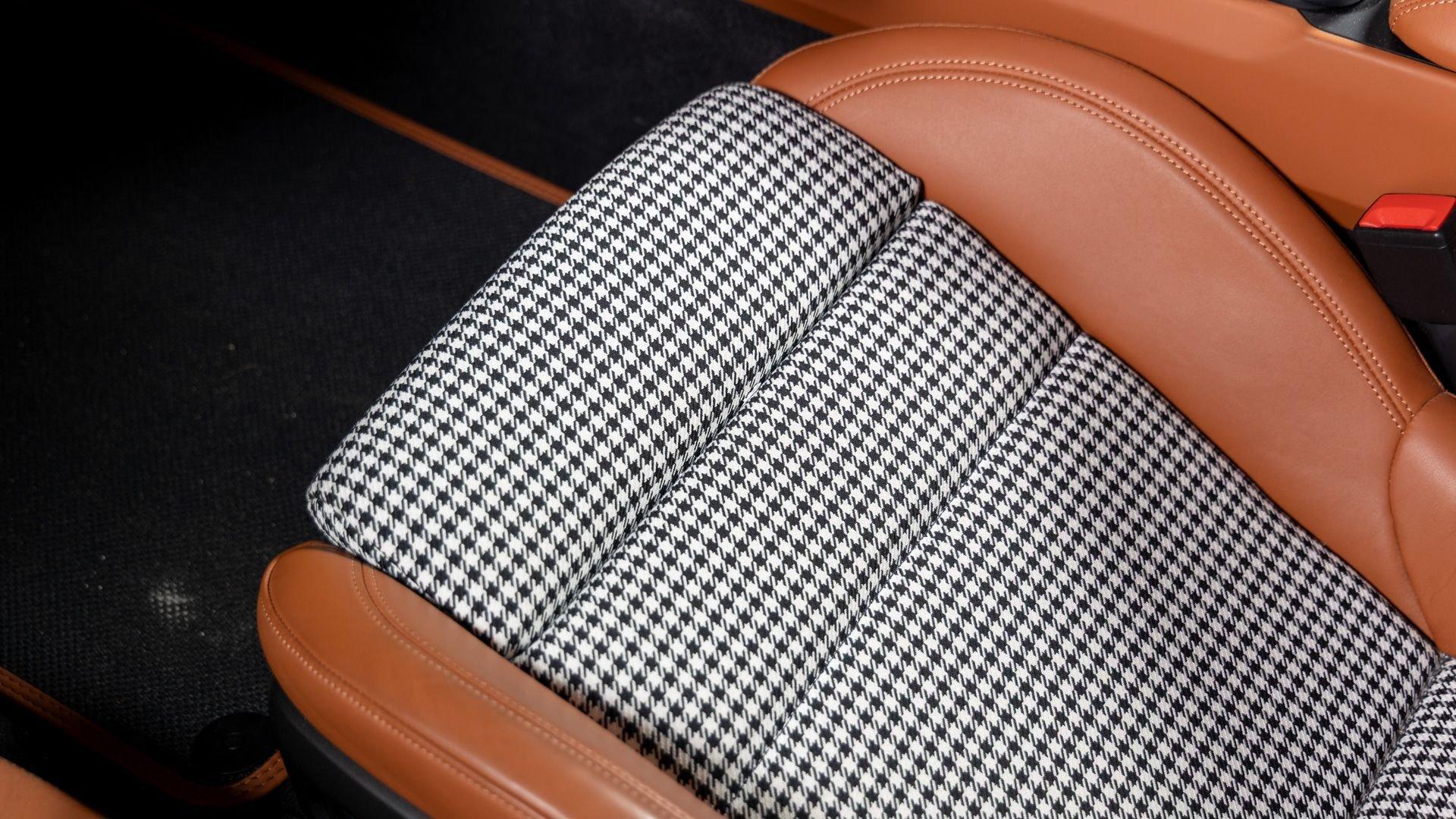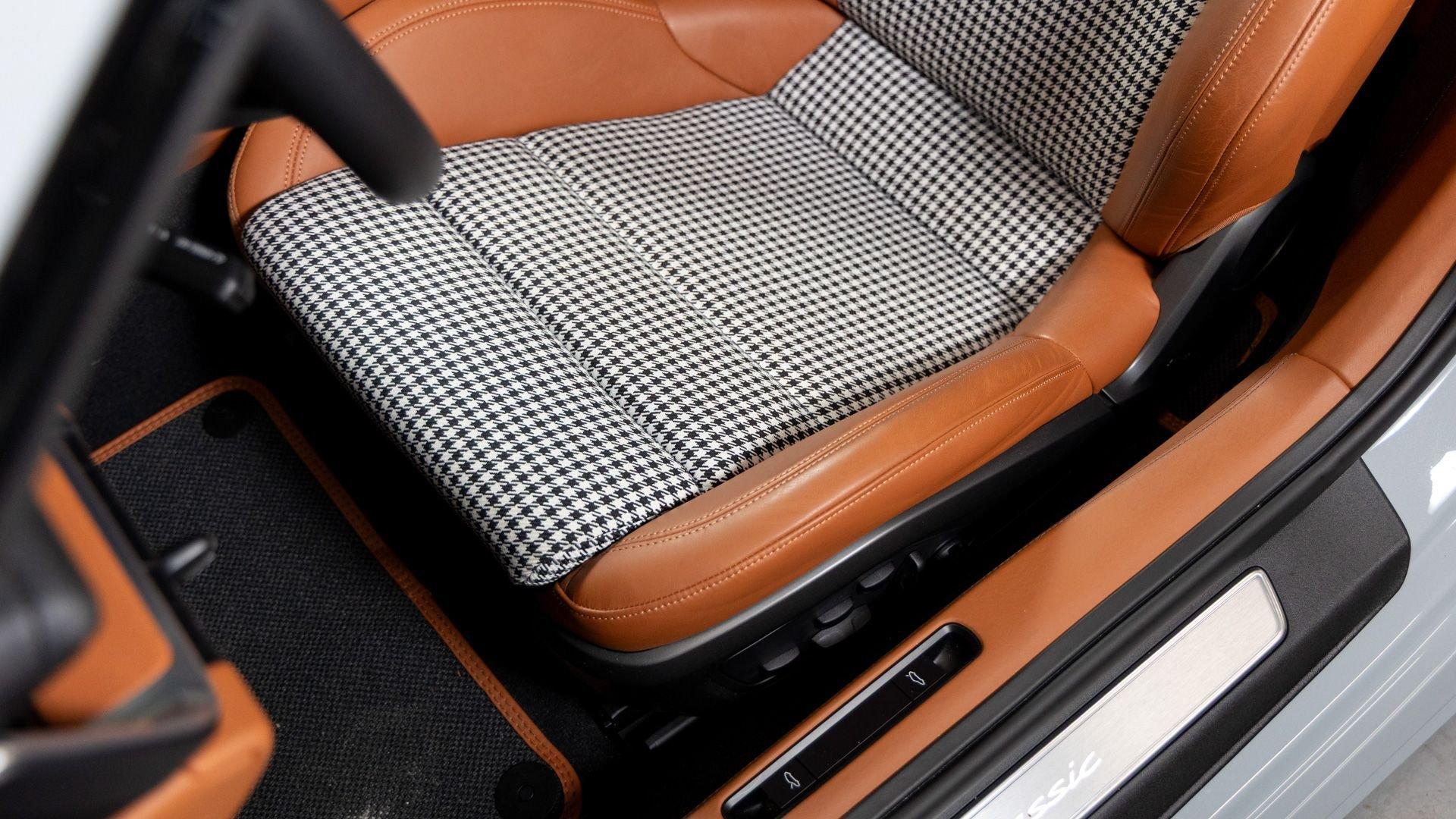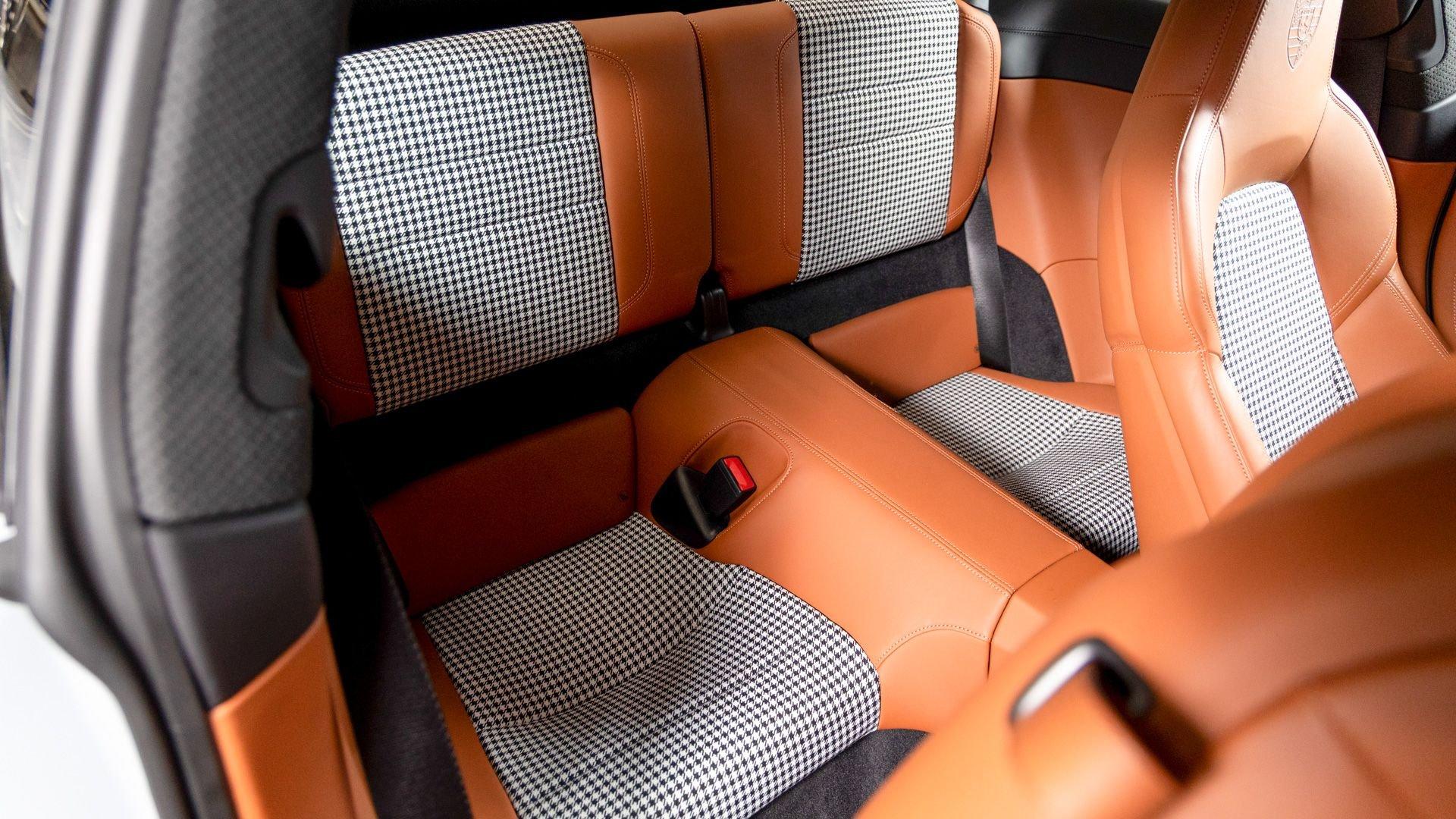 Inside, the cabin was a carefully curated blend of nostalgia and craftsmanship. Leather-trimmed seats featured houndstooth fabric inserts evocative of early 911s, complemented by wooden dashboard trim and green instrument backlighting that lent a warm, period-correct ambiance.