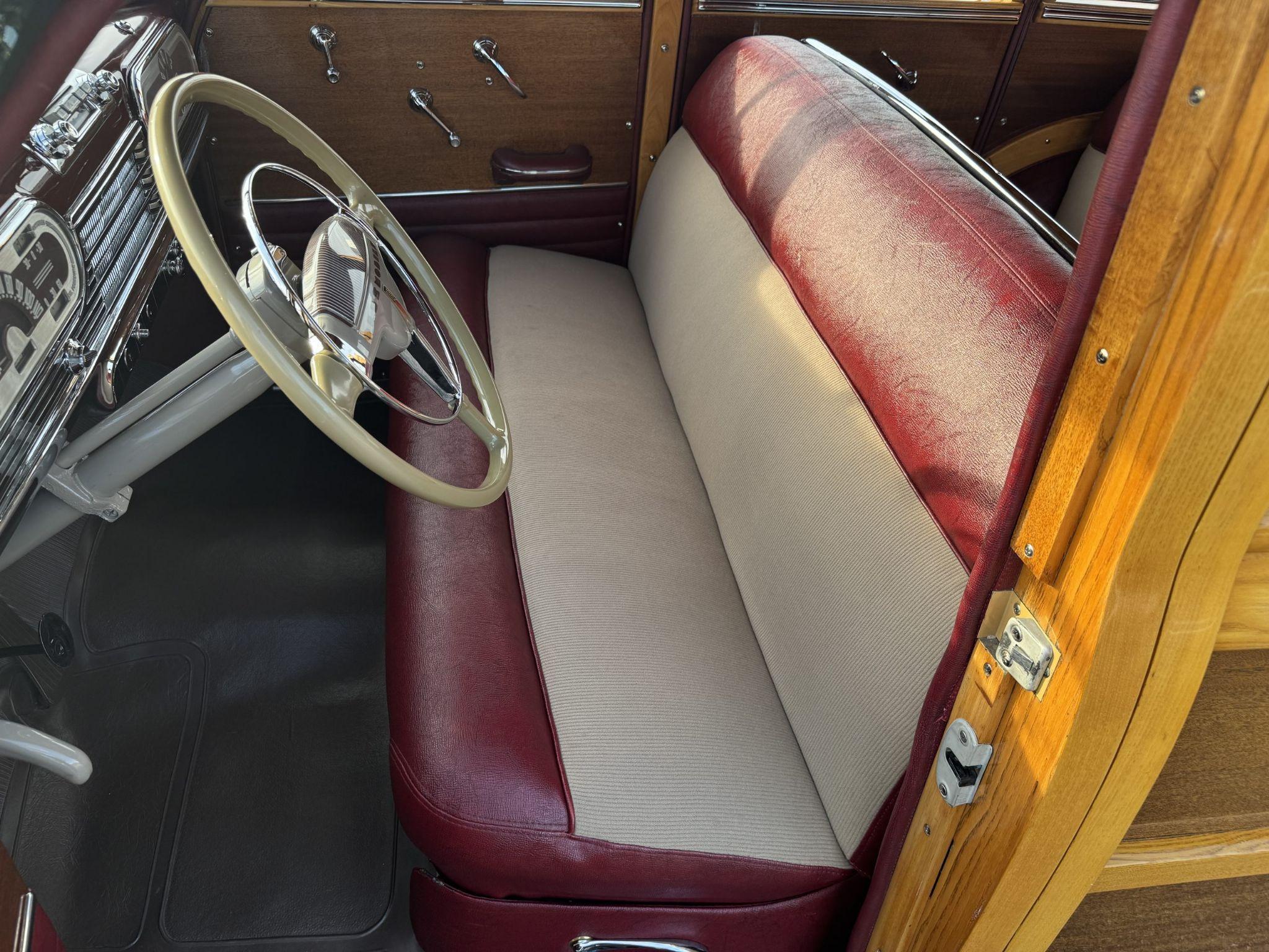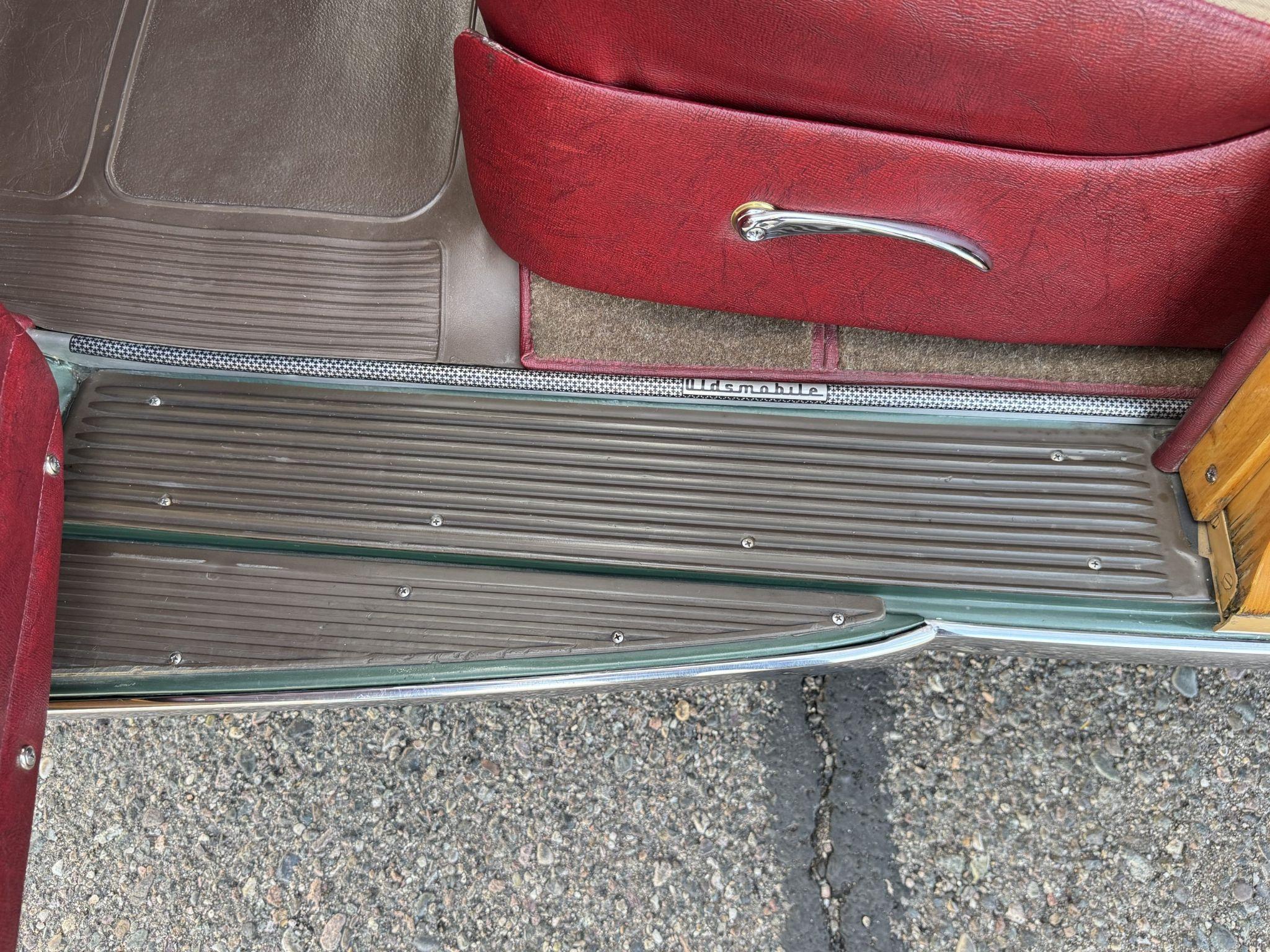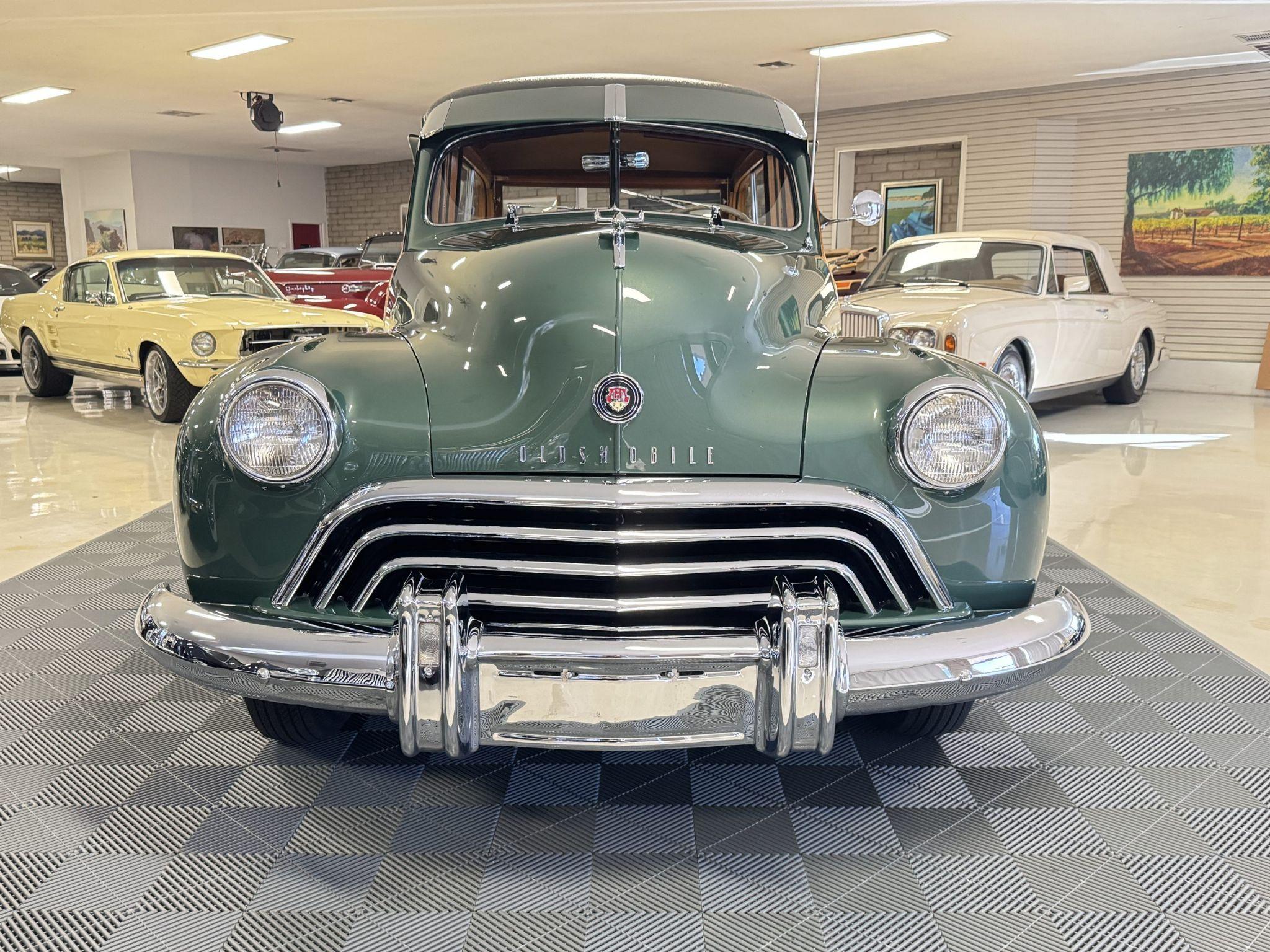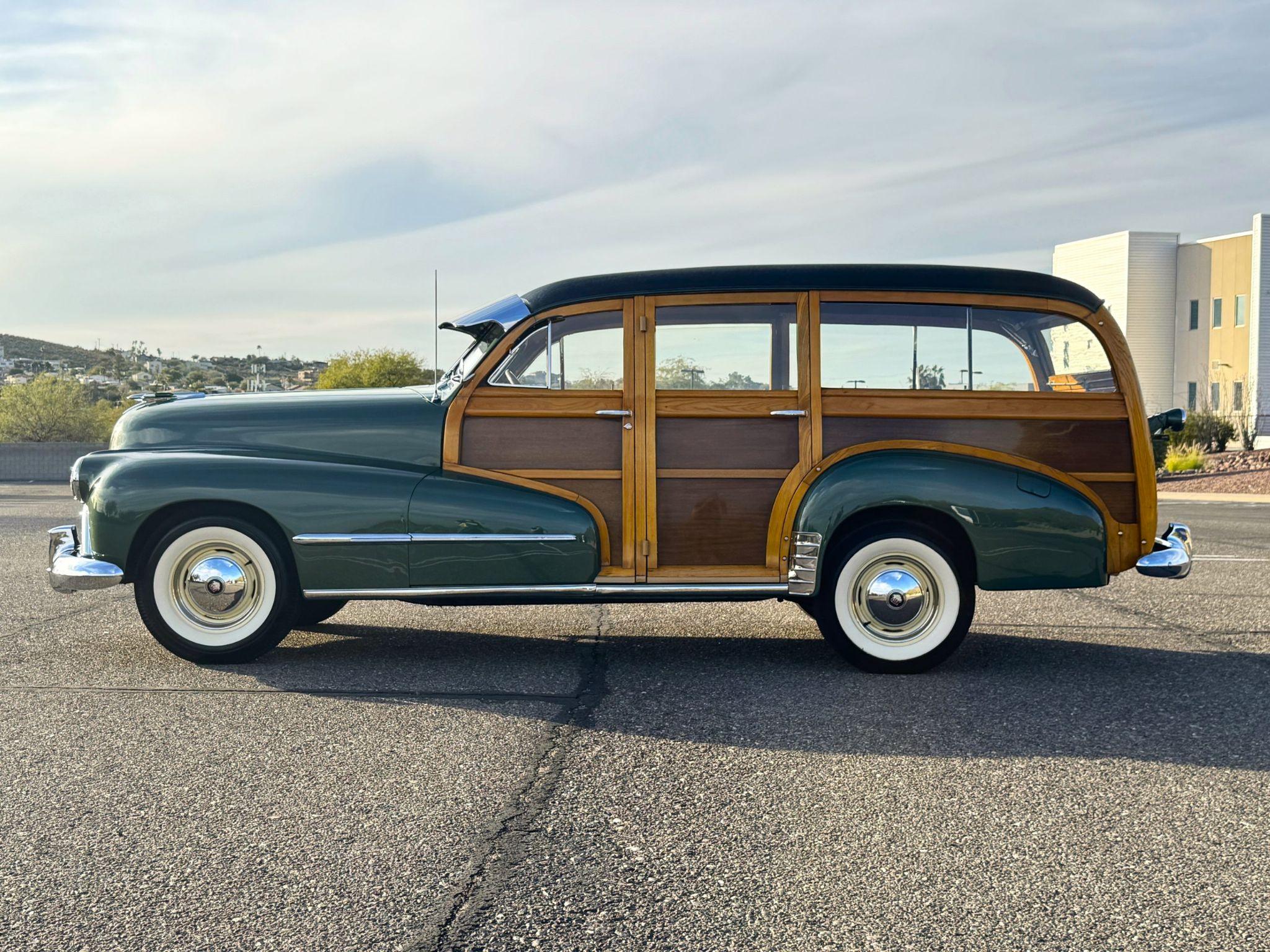 The 1948 Oldsmobile Series 66 Dynamic Deluxe Woodie Wagon represents one of the most refined postwar American family cars, blending craftsmanship, comfort, and restrained style. Powered by the original 238-cubic-inch inline six and equipped with a 4-speed Hydra-Matic automatic transmission, the Oldsmobile is believed to show 55,271 actual miles and presents as a high-quality restored example. With its steel body and Ionia-built ash and mahogany coachwork, the Series 66 is well suited for long-distance touring, regional shows, or inclusion in a distinctive postwar collection. Produced in limited numbers, with just 553 examples built for the 1948 model year, the Series 66 Dynamic Deluxe Woodie Wagon features wood construction by the Ionia Body Company of Michigan, long regarded as General Motors premier wood-body supplier. Originally finished in Nickel Gray, this example is believed to have undergone a frame-off restoration and has been carefully preserved since completion. The Oldsmobile reflects the periods tradition of wood-bodied wagons as upscale multipurpose vehicles, often used for beach outings, resort travel, and family touring, and today offers an authentic representation of that postwar lifestyle. The exterior presents in Ivy Green paint with deep, even luster, complemented by richly finished ash and mahogany side and rear panels that remain in excellent condition. The dark green textured vinyl roof is clean and well fitted, while the split front windshield, exterior sun shield, and brightwork all present strongly. The distinctive Oldsmobile grille and bomber style chrome and green hood handle remain crisp, and the headlamp glass is clear and fully functional. A two-piece tailgate with a tilting glass vent window adds practicality, while steel wheels with Oldsmobile-logo hubcaps and wide whitewall tires in very good condition complete the period-correct appearance. Inside, the Series 66 features dual bench seating trimmed in the original-style tan cloth and maroon vinyl, offering accommodation for six passengers in a warm, inviting cabin. The wood paneling and interior accents remain in excellent condition and reinforce the craftsmanship associated with Ionia-built wagons. The maroon and chrome dashboard appears fresh, housing a 0110 mph speedometer and full auxiliary gauges, all framed by an ivory deluxe steering wheel. The clock is operational, the AM radio powers on without sound output, and all interior lighting functions as designed. Manual windows and tilt features provide natural airflow, while the folding passenger bench expands rear cargo space in traditional station wagon fashion. Mechanical power is supplied by the original 238-cubic-inch inline six, paired with a column-shifted 4-speed Hydra-Matic automatic transmission. The Series 66 delivers modest, relaxed performance consistent with its touring-focused design, aided by power-assisted steering and responsive hydraulic drum brakes. The Oldsmobile does not feature turn signals, consistent with the era, and retains a straightforward mechanical layout that emphasizes smooth operation and reliability. Included with the sale are original manuals, a jack, trunk-mounted spare tire, fire extinguisher, recent inspection report and a clean title. For more information and details, please call or text Kendi Brown at 1.623.404.9042 or email us at sales@classicpromenade.com . This 1948 Oldsmobile Series 66 Dynamic Deluxe Woodie Wagon is available for inspection at our showroom in Phoenix. We are pleased to offer FaceTime or WhatsApp live video inspections, and we help coordinate shipping worldwide. We also have financing partners if you are interested in financing.