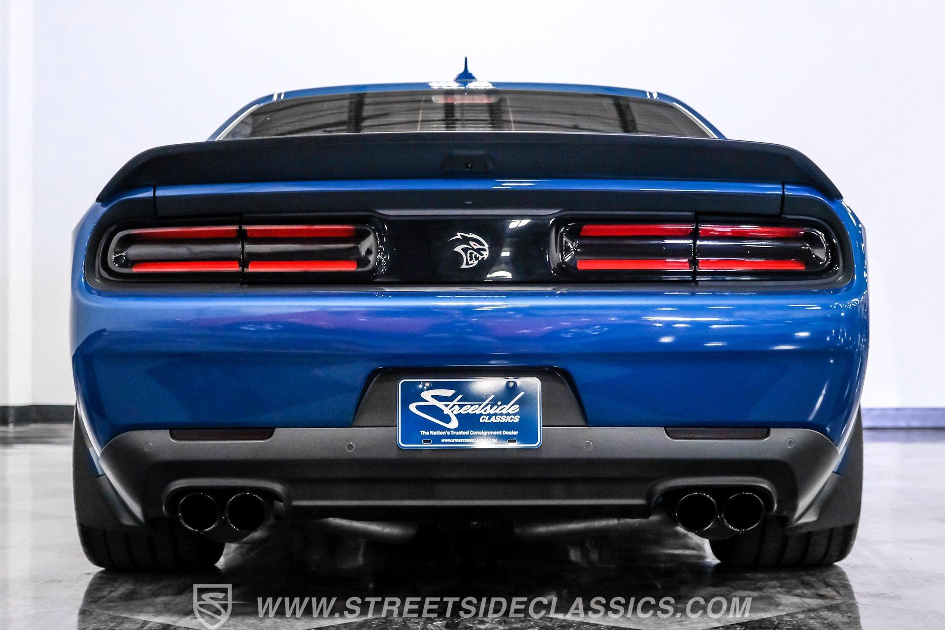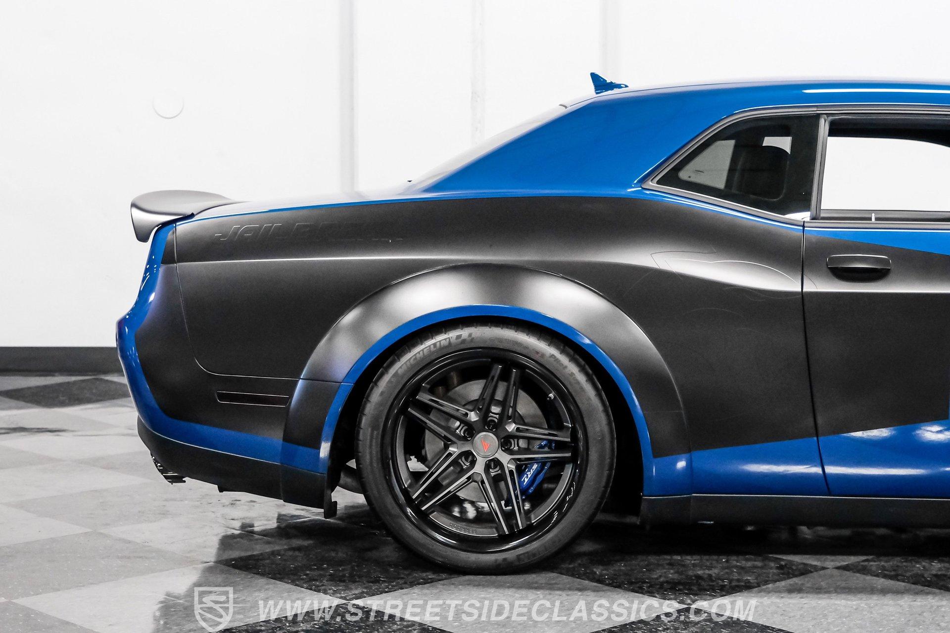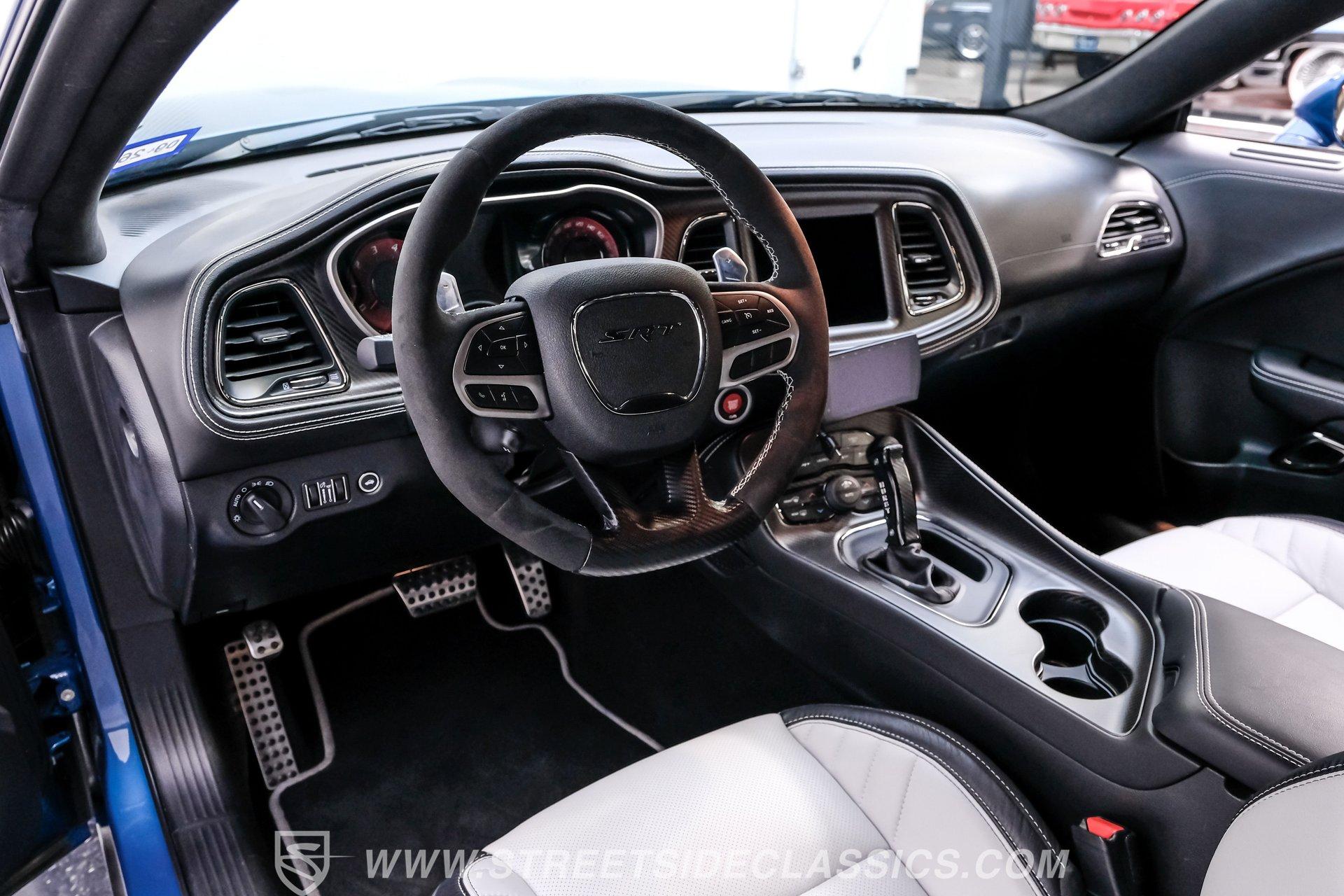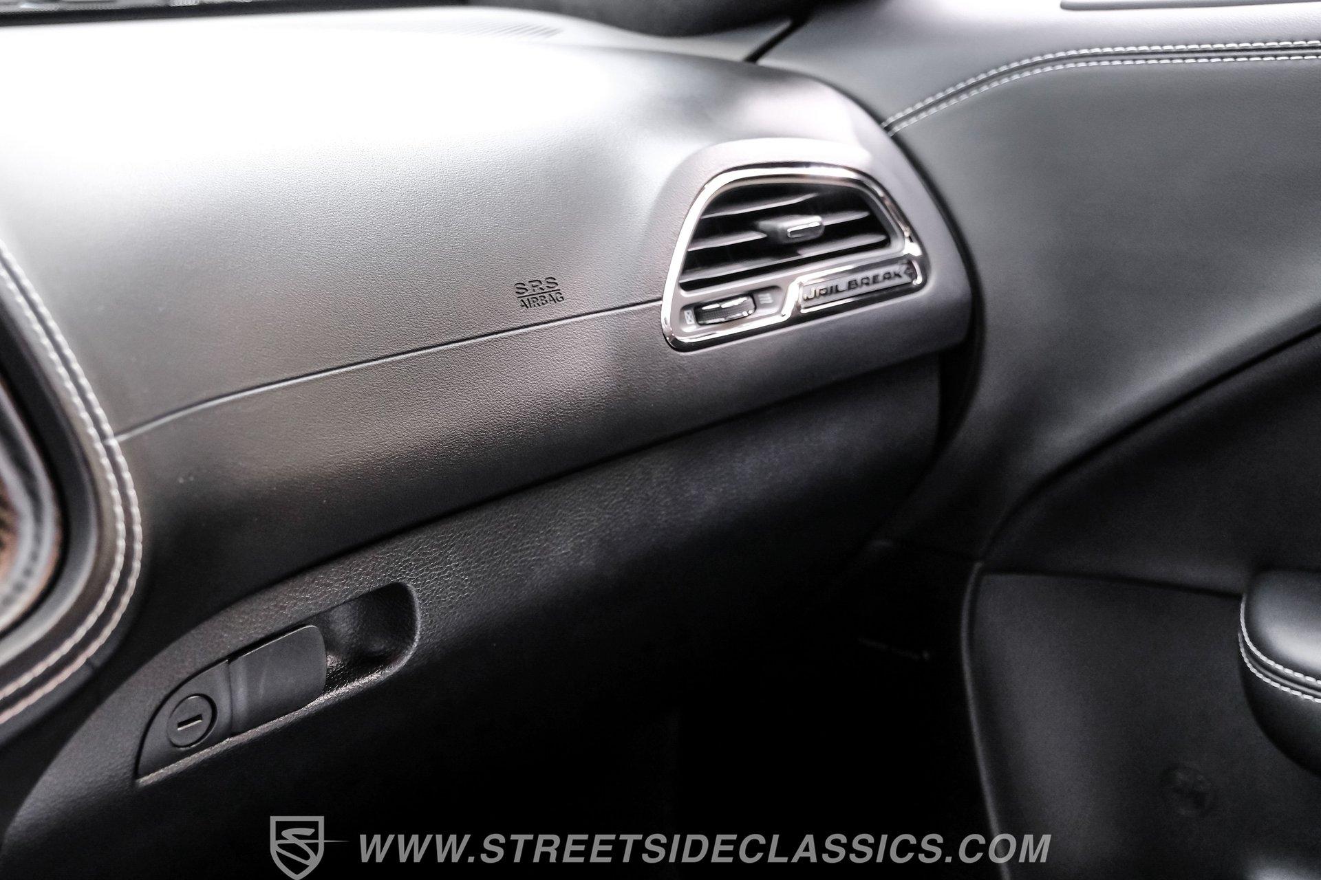 This Challenger SRT8 Hellcat Redeye has the rare Jailbreak package that added additional $18,595 to the price of the car. The Jailbreak option includes a 220-mph speedometer, widebody fender flares, high-performance engine controller, widebody competition suspension, Jailbreak badging and a SRT power chiller. Other options include Laguna leather seats with Hellcat logo that are ventilated and have memory settings, Technology Group, Driver Convenience Group, Harmon Kardon Audio Group with 18-speaker Prem Audio and trunk-mounted subwoofer, suede headliner, 8-speed TorqueFlite automatic transmission, 3.09 rear axle ratio, black hood pin kit, satin chrome exterior badging, satin black SRT Performance spoiler, SRT Widebody stripe, SRT Alcantra steering wheel with red LED logo, 4C NAV with 8.4-inch touch screen display, 20'' x 11'' Warp-Speed satin carbon wheels, real carbon fiber interior accents and blue brake calipers.